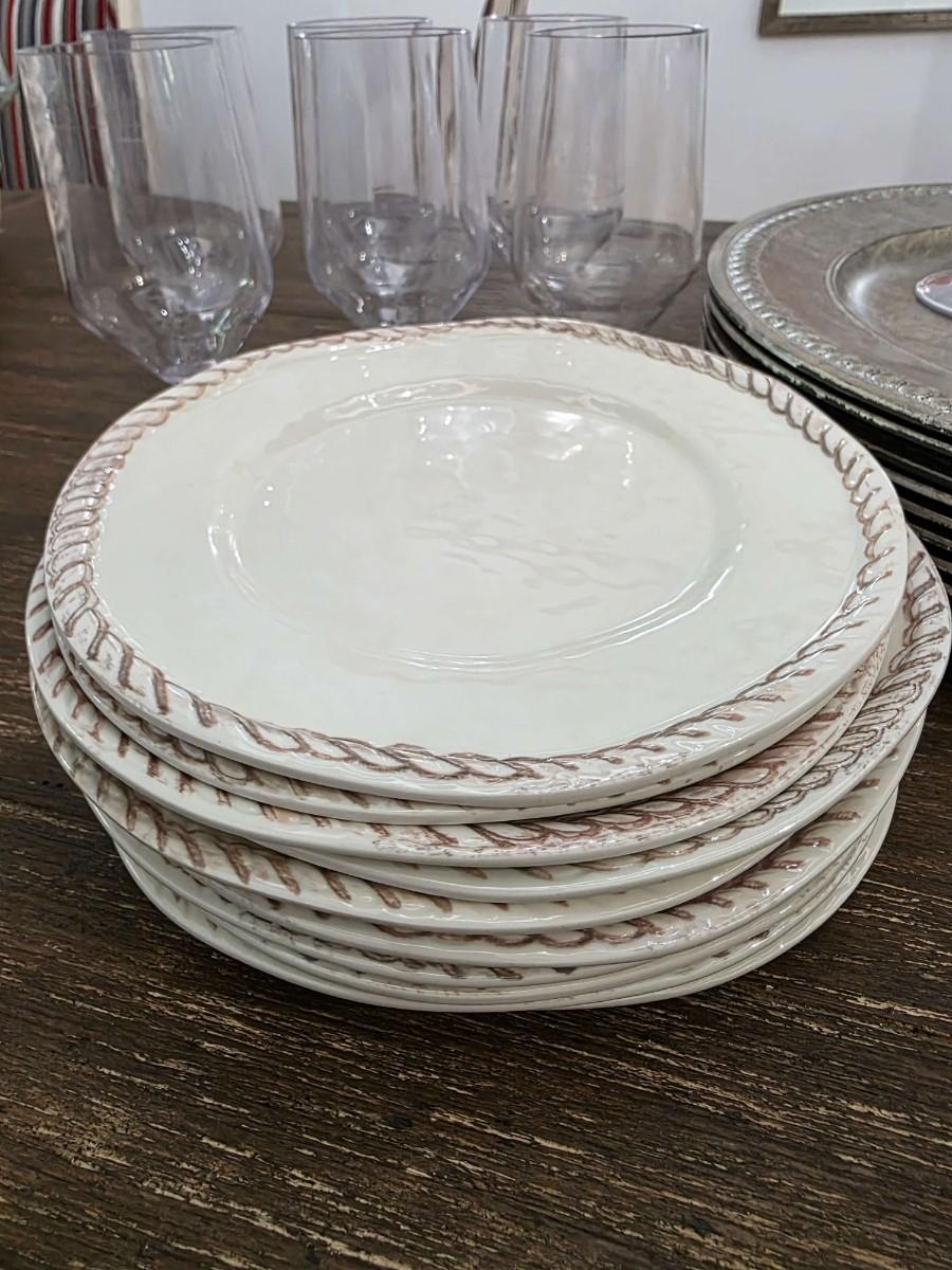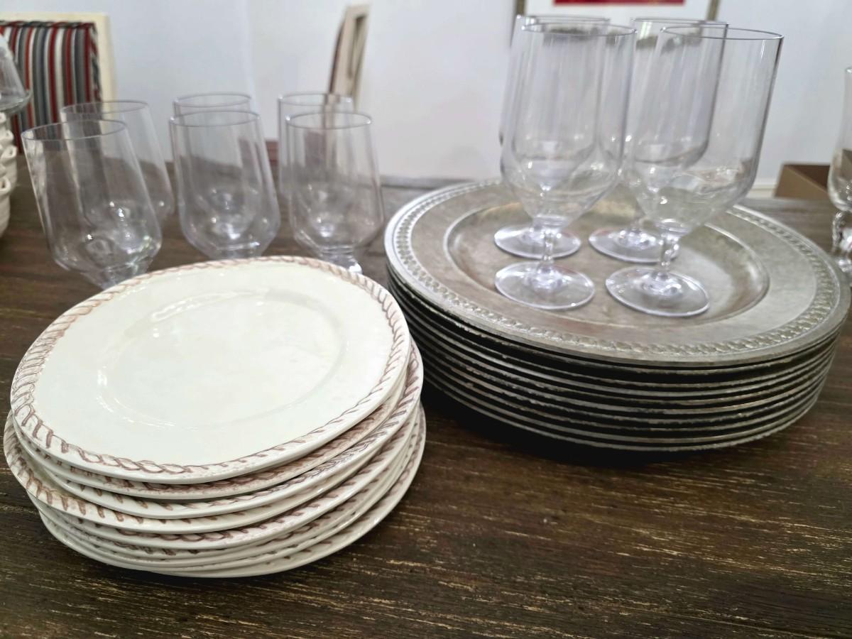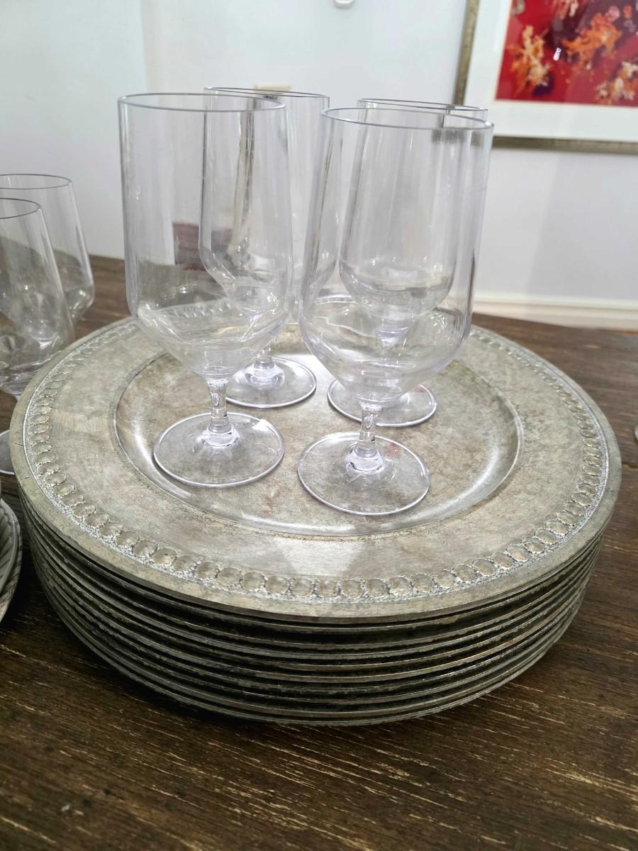 This is a lot including cream colored melamine plates, acrylic silver vintage look chargers, and clear acrylic goblets. This is a lot meaning you must pay for and take the entire lot.