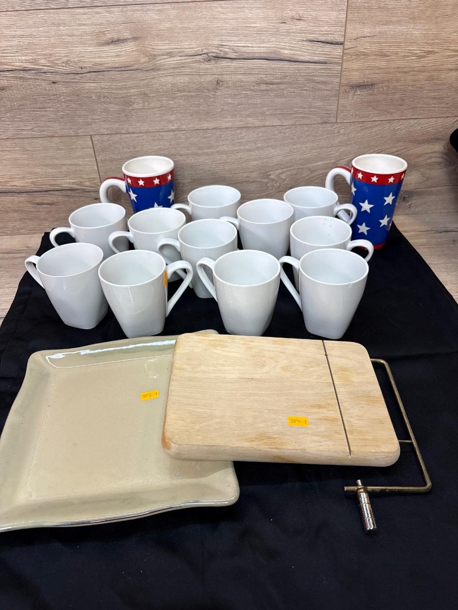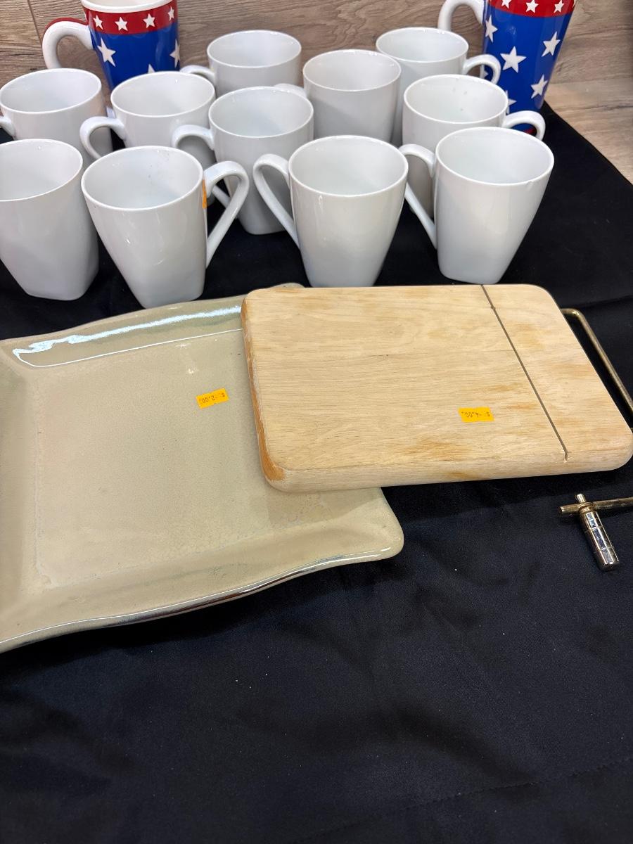 Cups and cheese board, plate