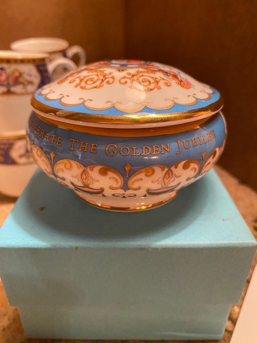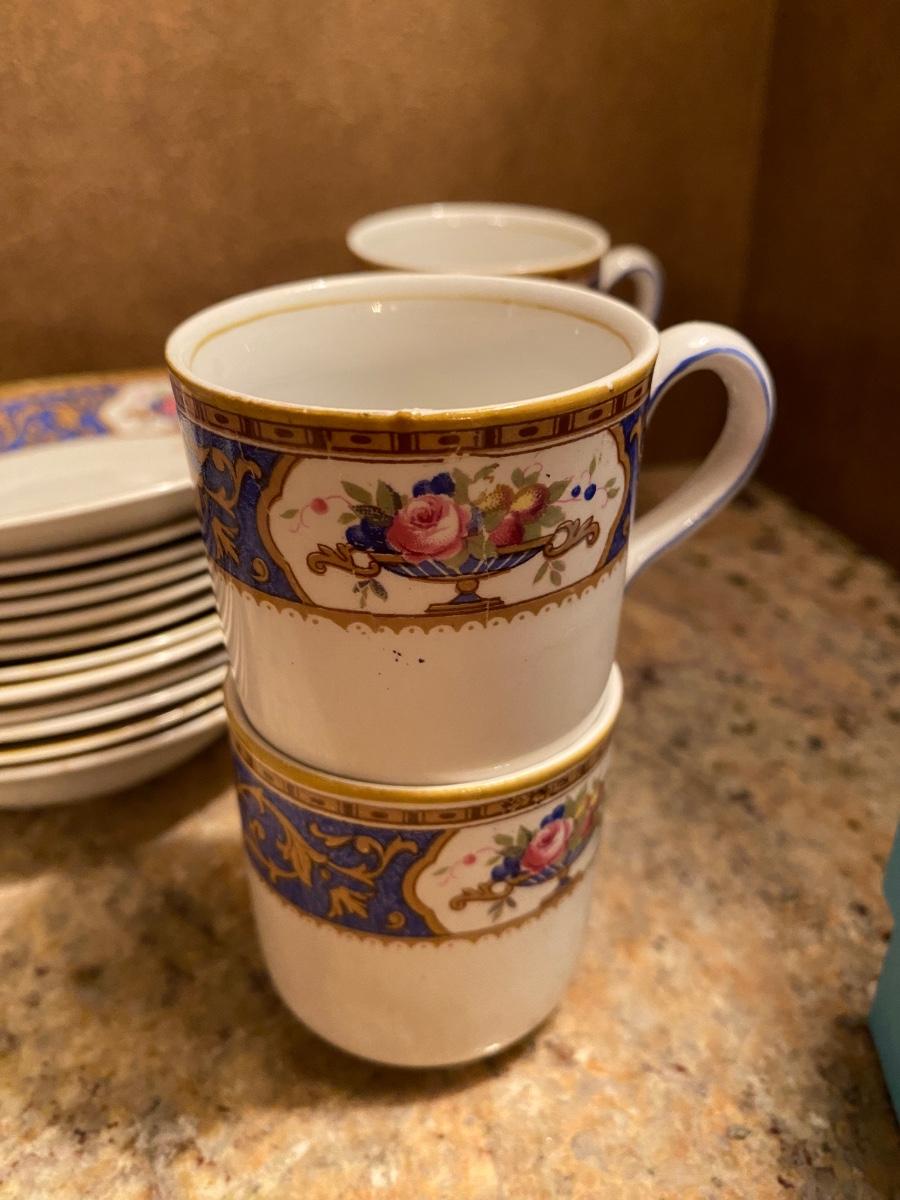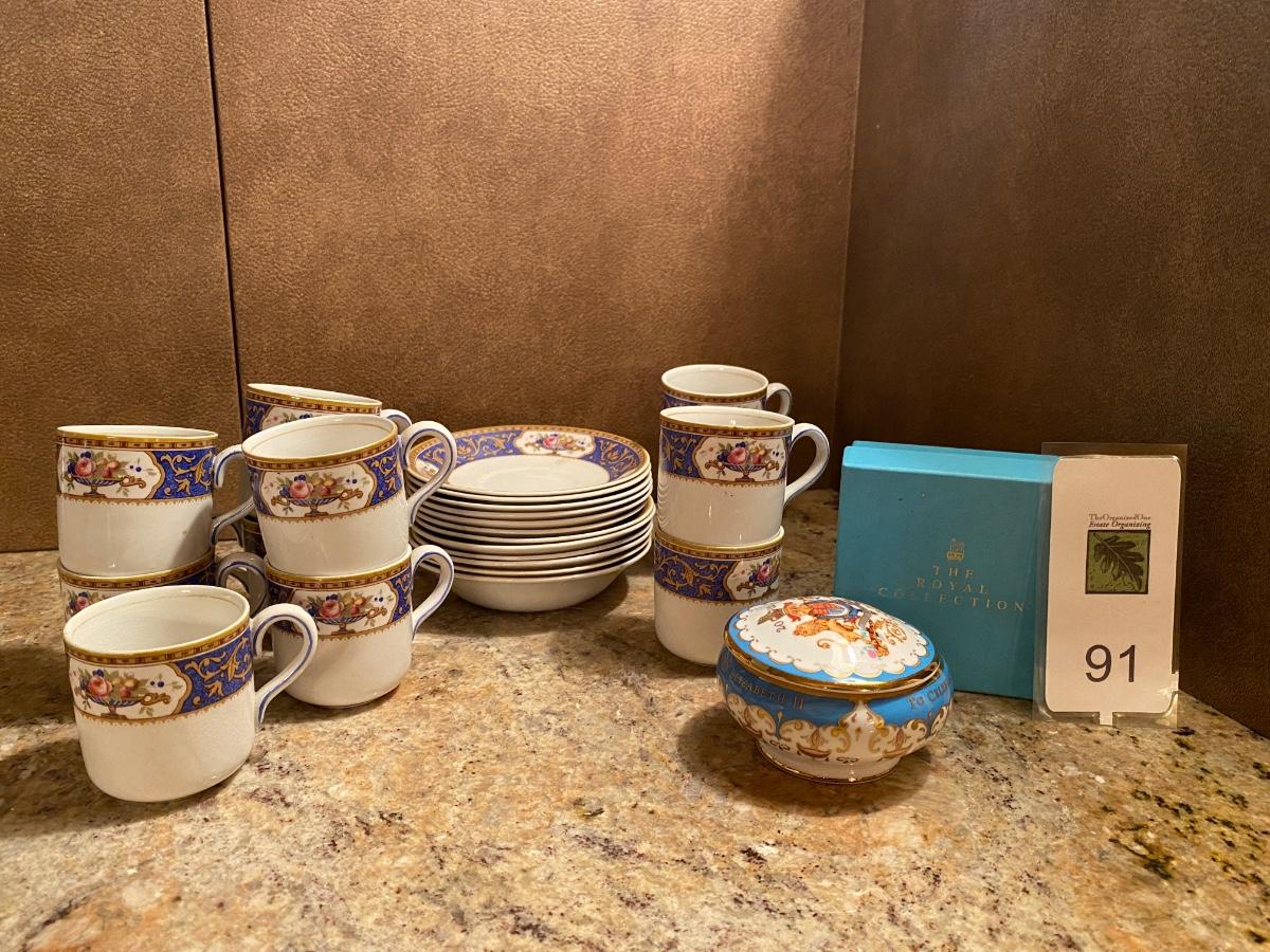 Collection of espresso cups (11ct) and saucers (12ct) by Myott, Son and Co. Also includes a small dish with lid from the Royal Collection. Saucers 5”, dish with lid 3” x 1.5”