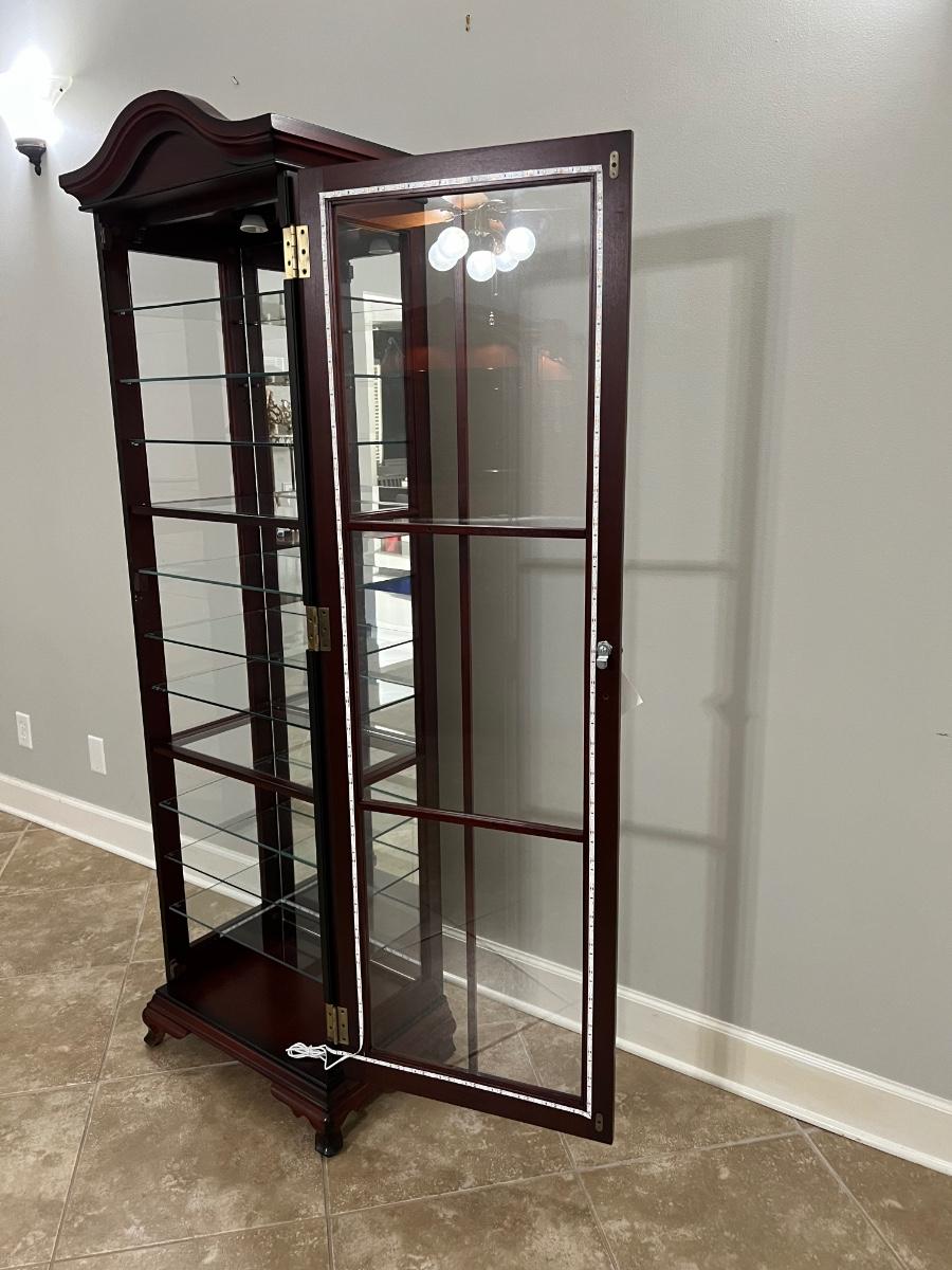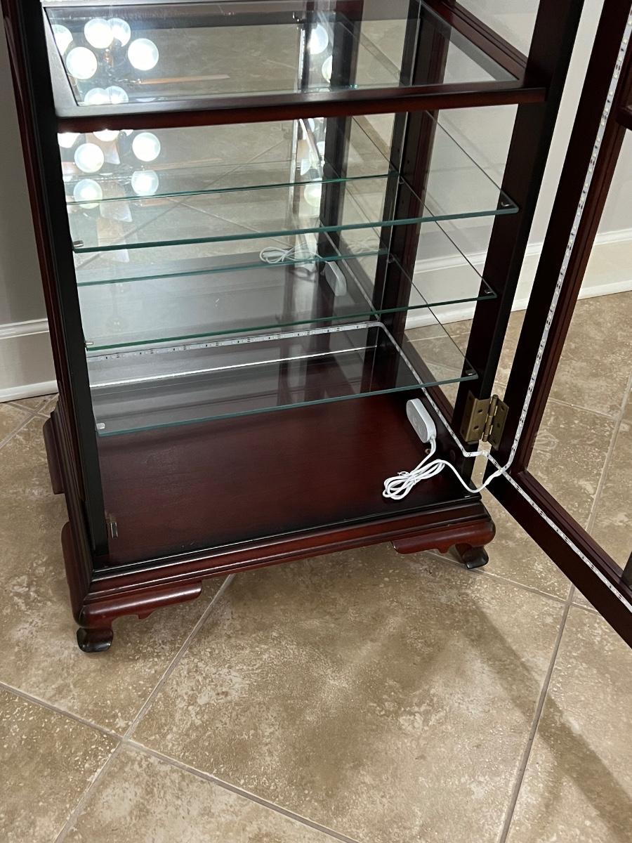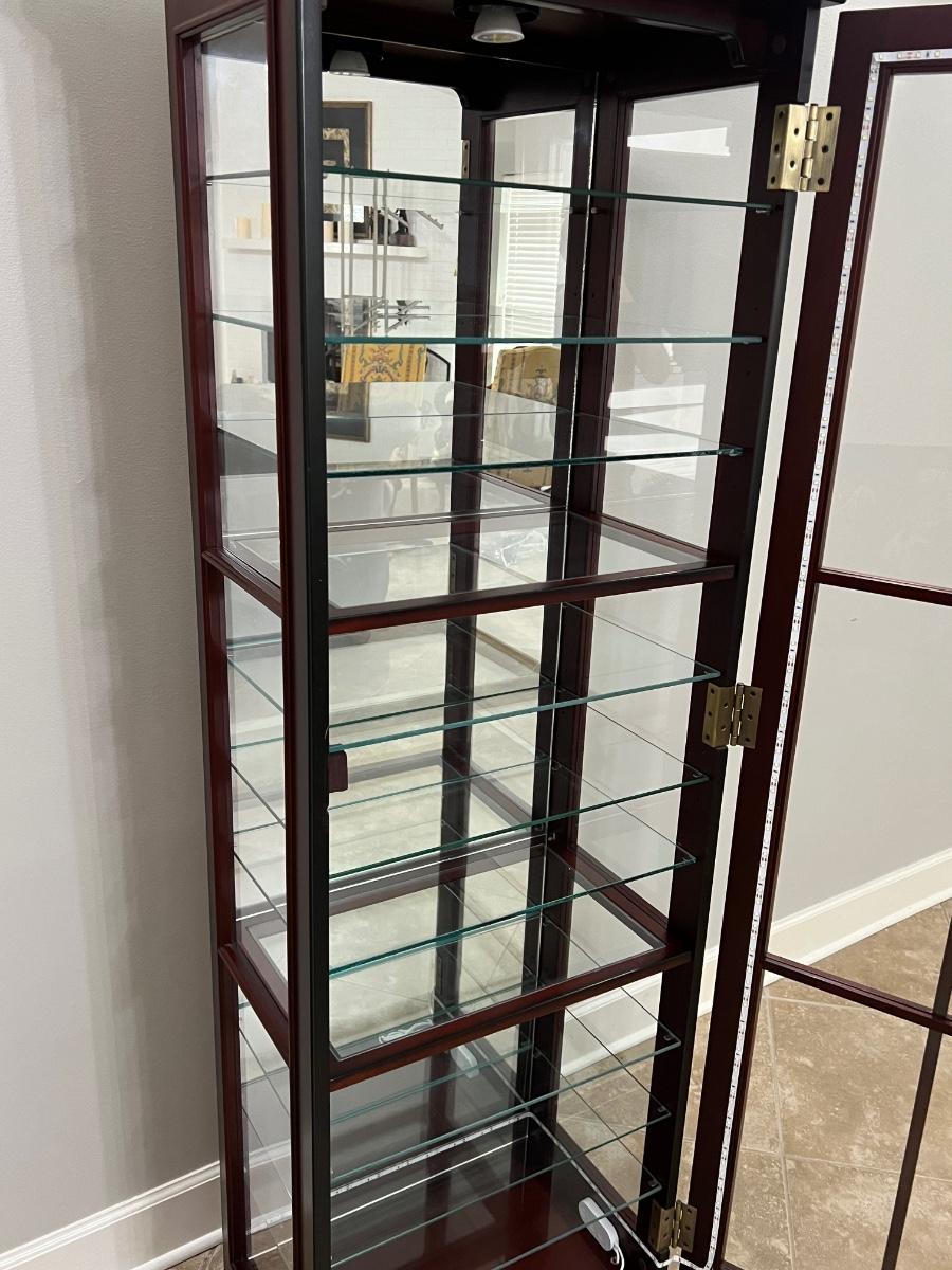Only 3 shelves are adjustable, 1 in the top section, 1 in the middle section, & 1 in bottom section ~ Client had put the white strip lighting along the inside bottom and door, they do not have the cord to lite them, it will need replacing ~ 74” H x 24” W x 15.5” D ~ No Brand Name ~ Original Handle Hardware has been removed and a new lock added. See photo where old hardware use to be