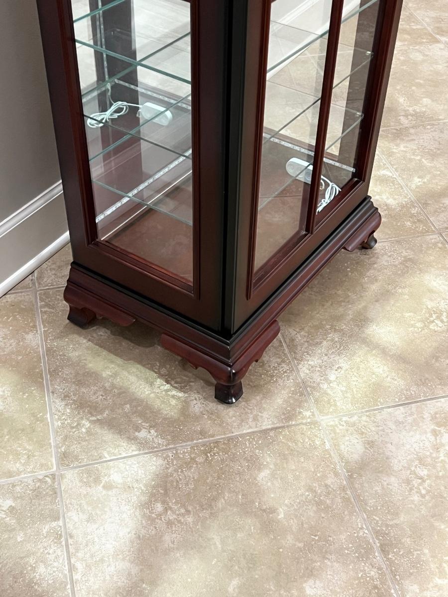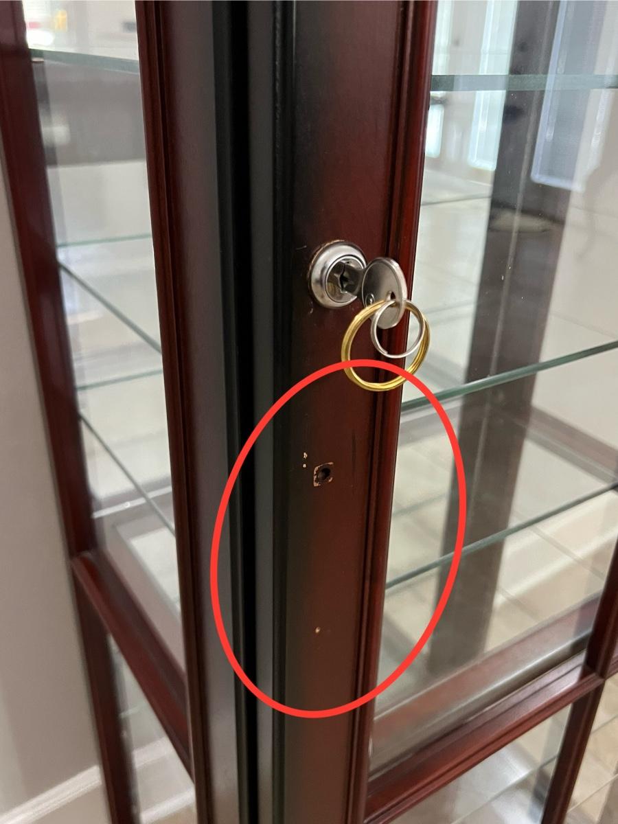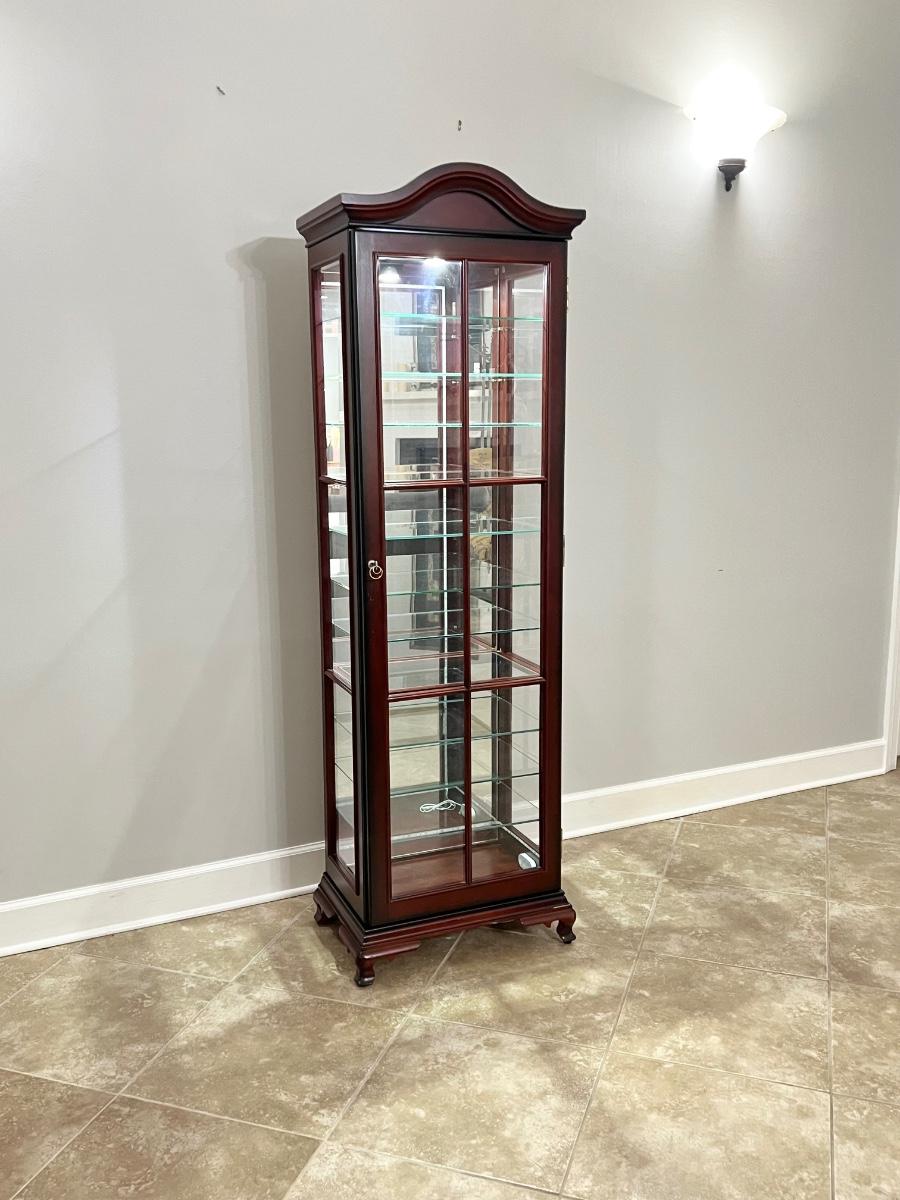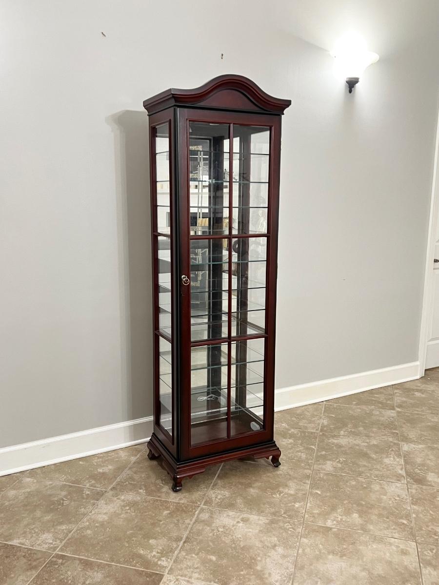 Only 3 shelves are adjustable, 1 in the top section, 1 in the middle section, & 1 in bottom section ~ Client had put the white strip lighting along the inside bottom and door, they do not have the cord to lite them, it will need replacing ~ 74” H x 24” W x 15.5” D ~ No Brand Name ~ Original Handle Hardware has been removed and a new lock added. See photo where old hardware use to be