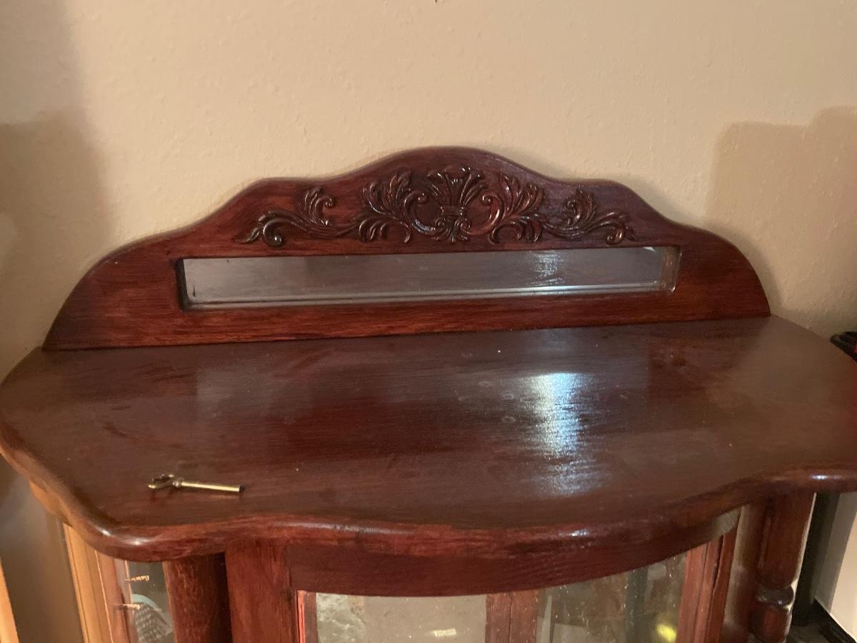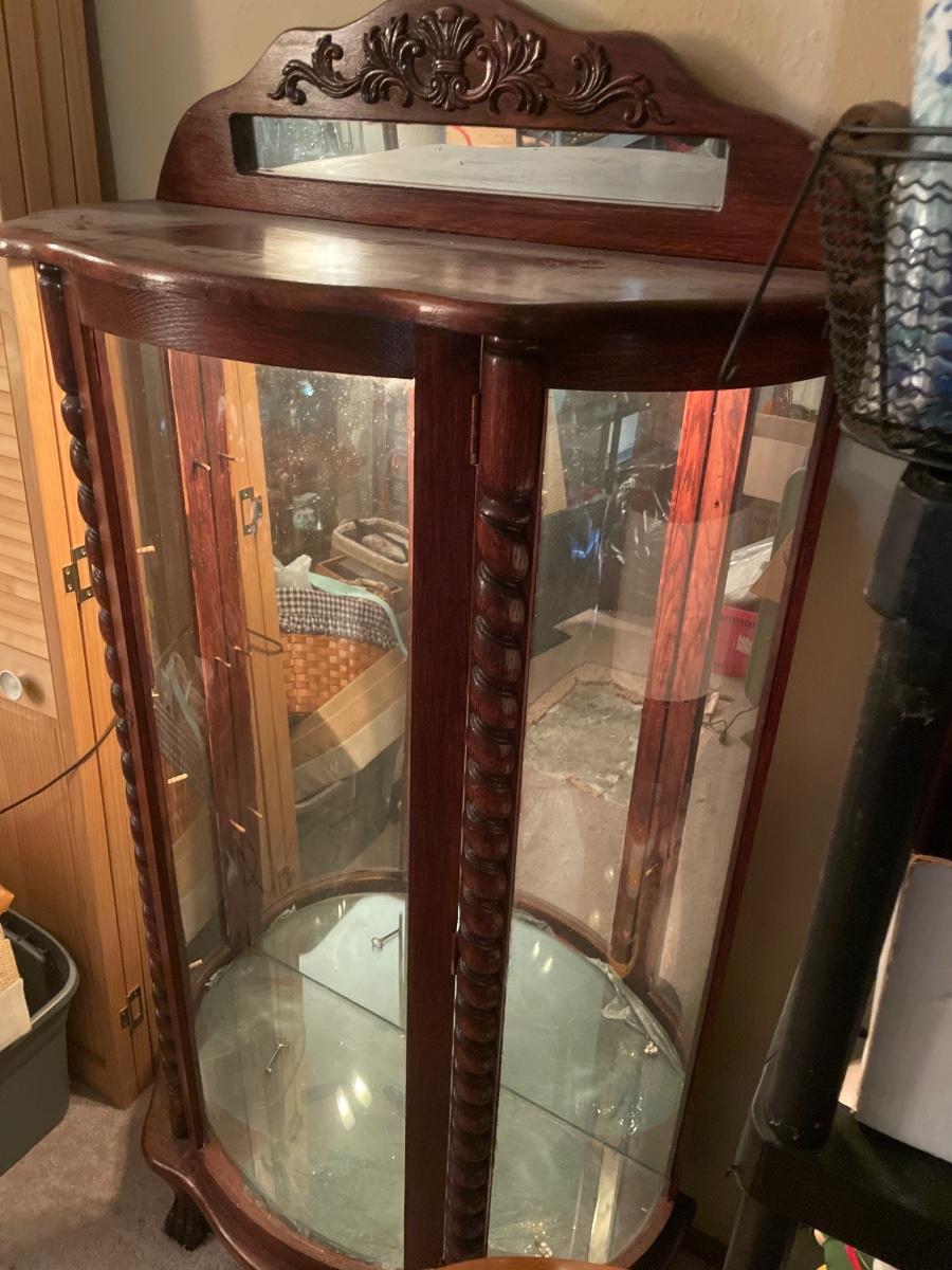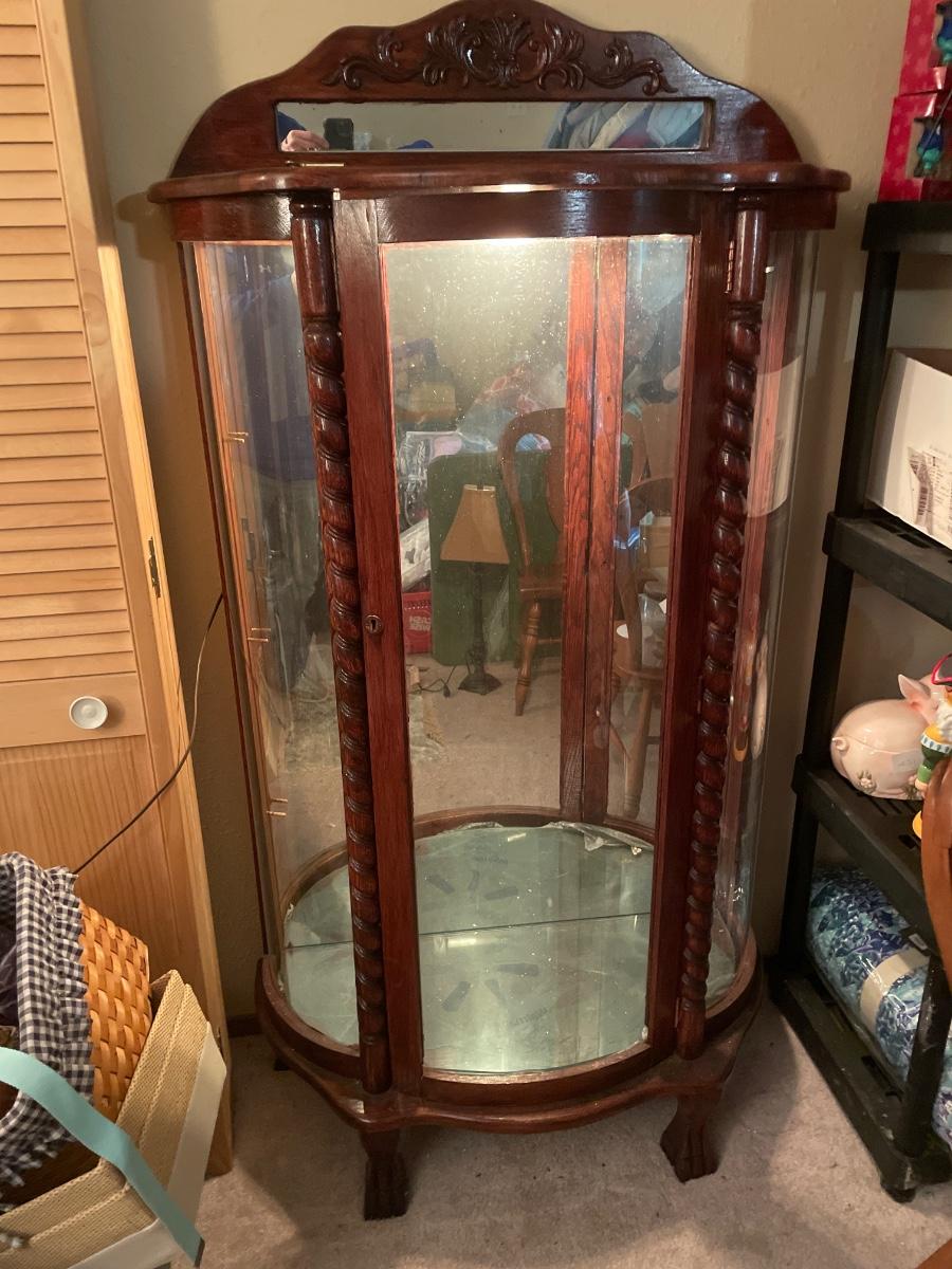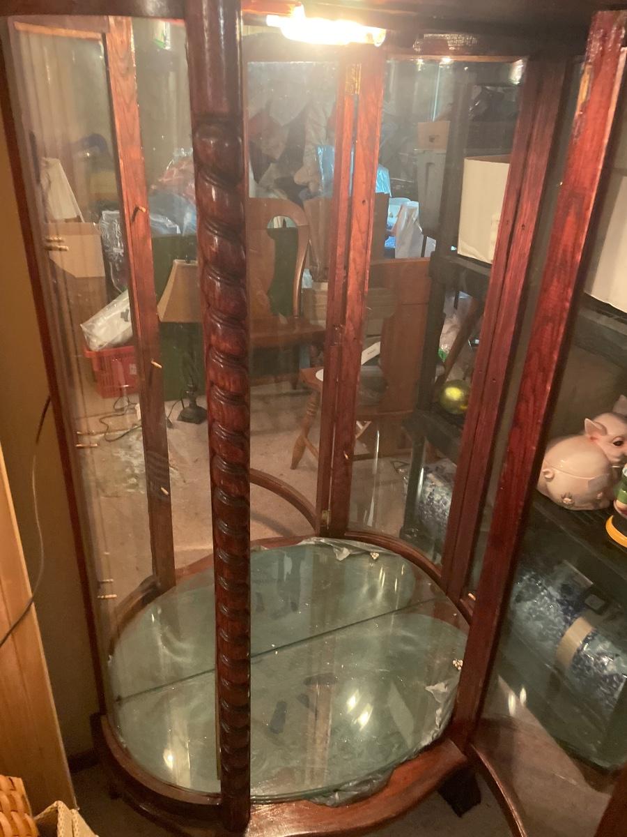 I found 3 glass shelves for it however there are 5 wooden pegs that are missing so you would need to buy them somewhere else. Dimensions are 34 1/2 inches wide x 65 inches tall x 16 inches deep.