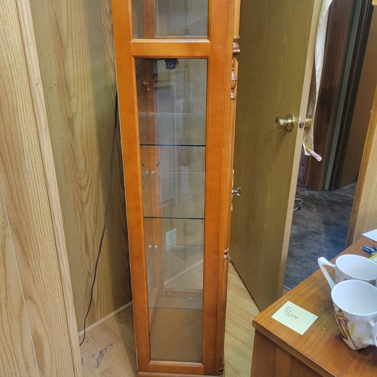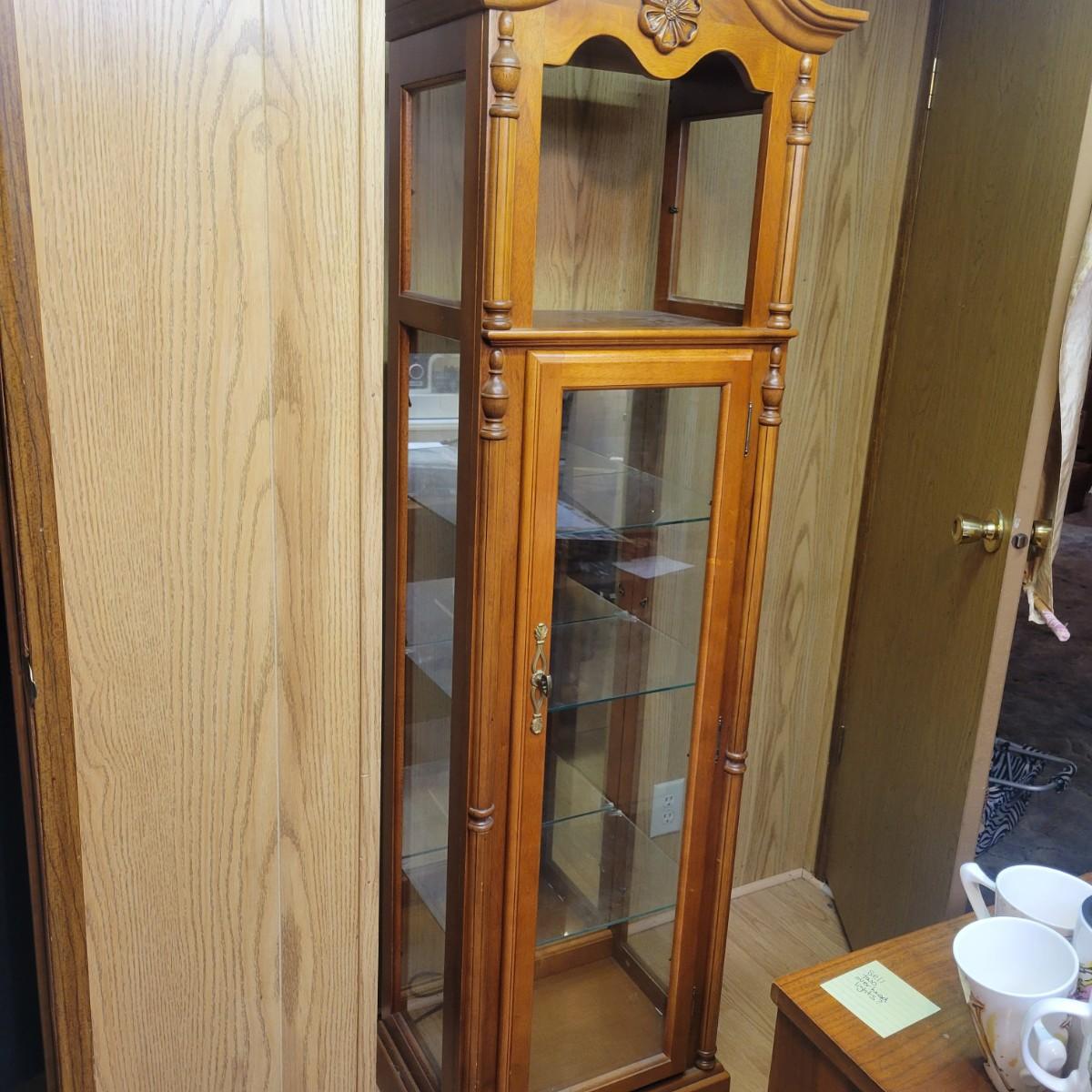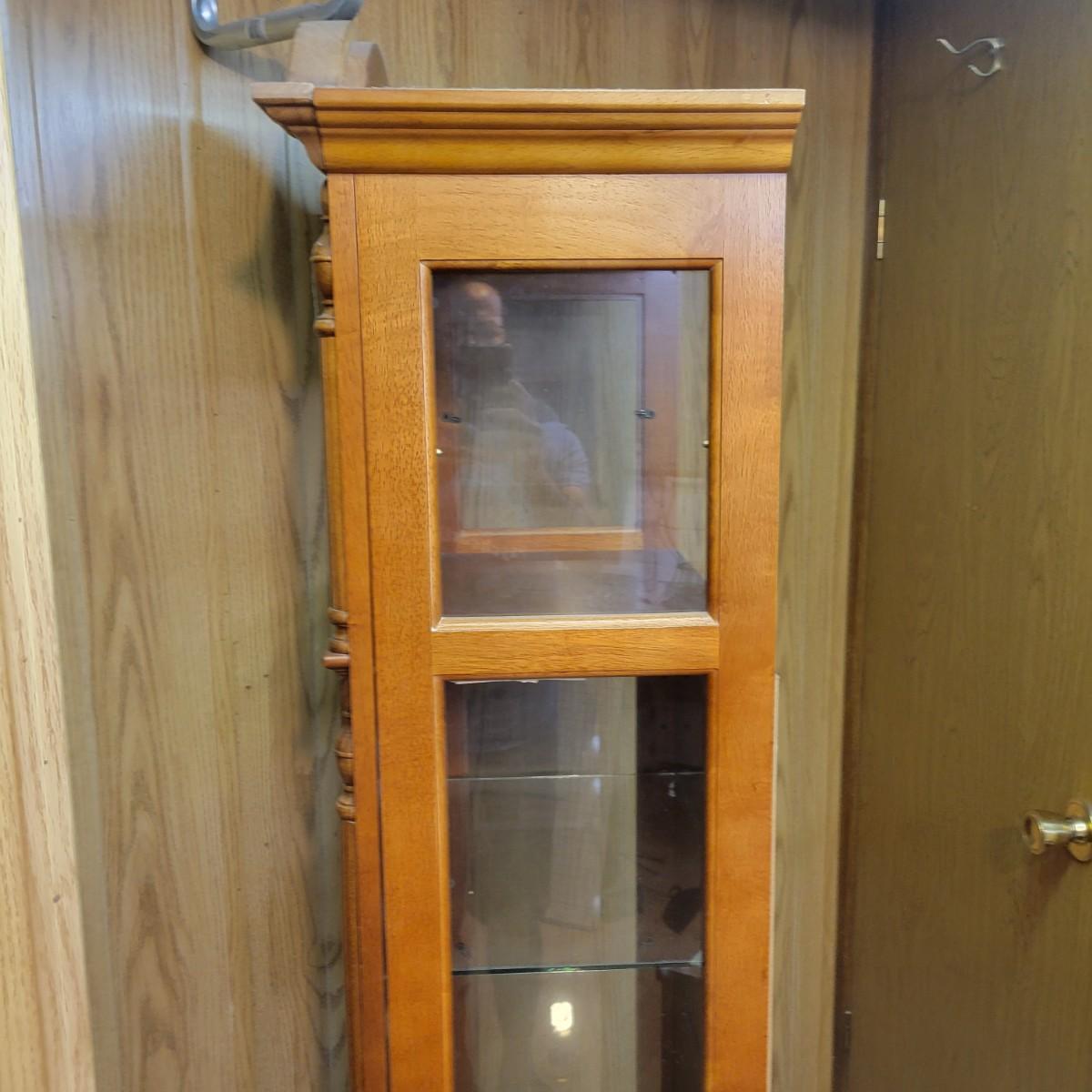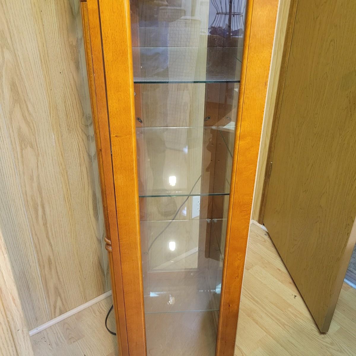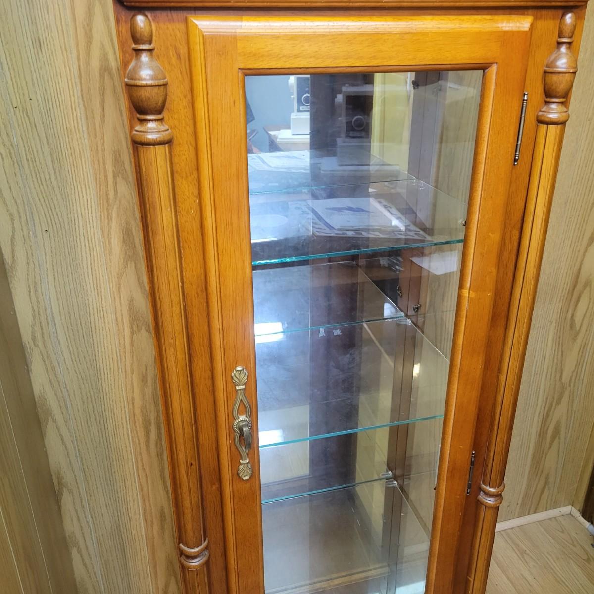 Curio cabinet with three adjustable glass shelves, glass door and a mirror back. Cabinet appears to be made of mdf with a veneer on the out side. Cabinet is in good condition with minor scratches. Measures approximately 19" x 14" x 73" Local pickup only