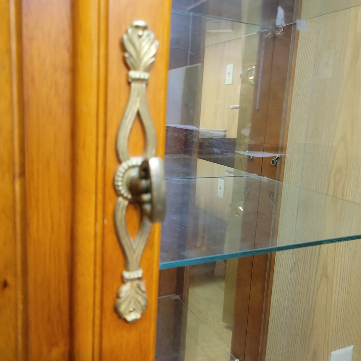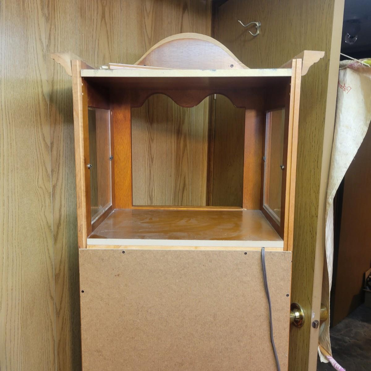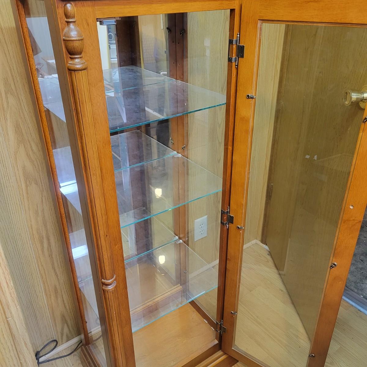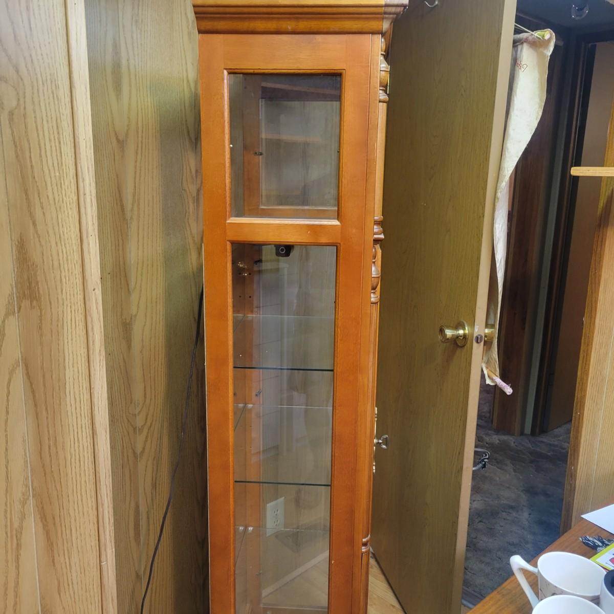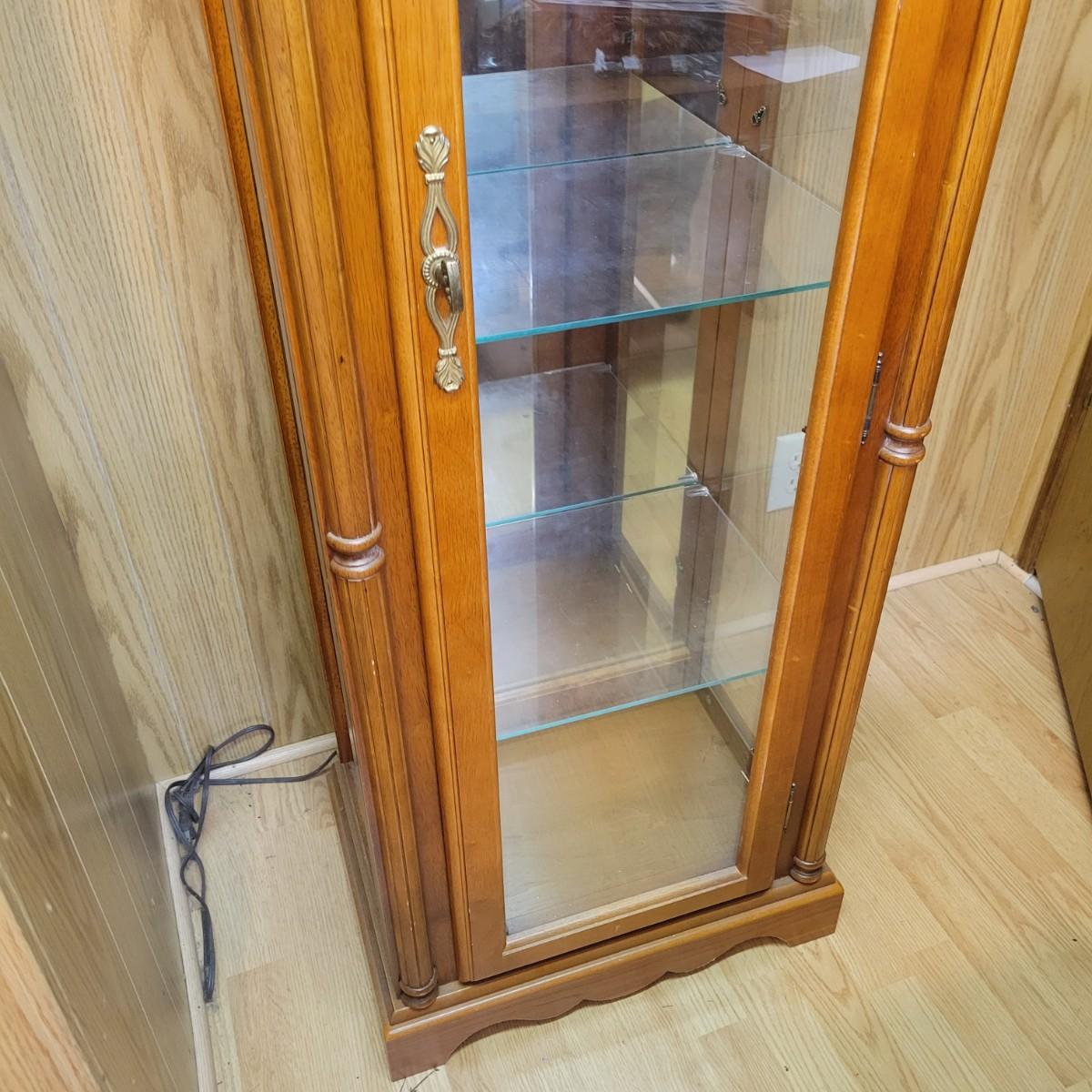 Curio cabinet with three adjustable glass shelves, glass door and a mirror back. Cabinet appears to be made of mdf with a veneer on the out side. Cabinet is in good condition with minor scratches. Measures approximately 19" x 14" x 73" Local pickup only