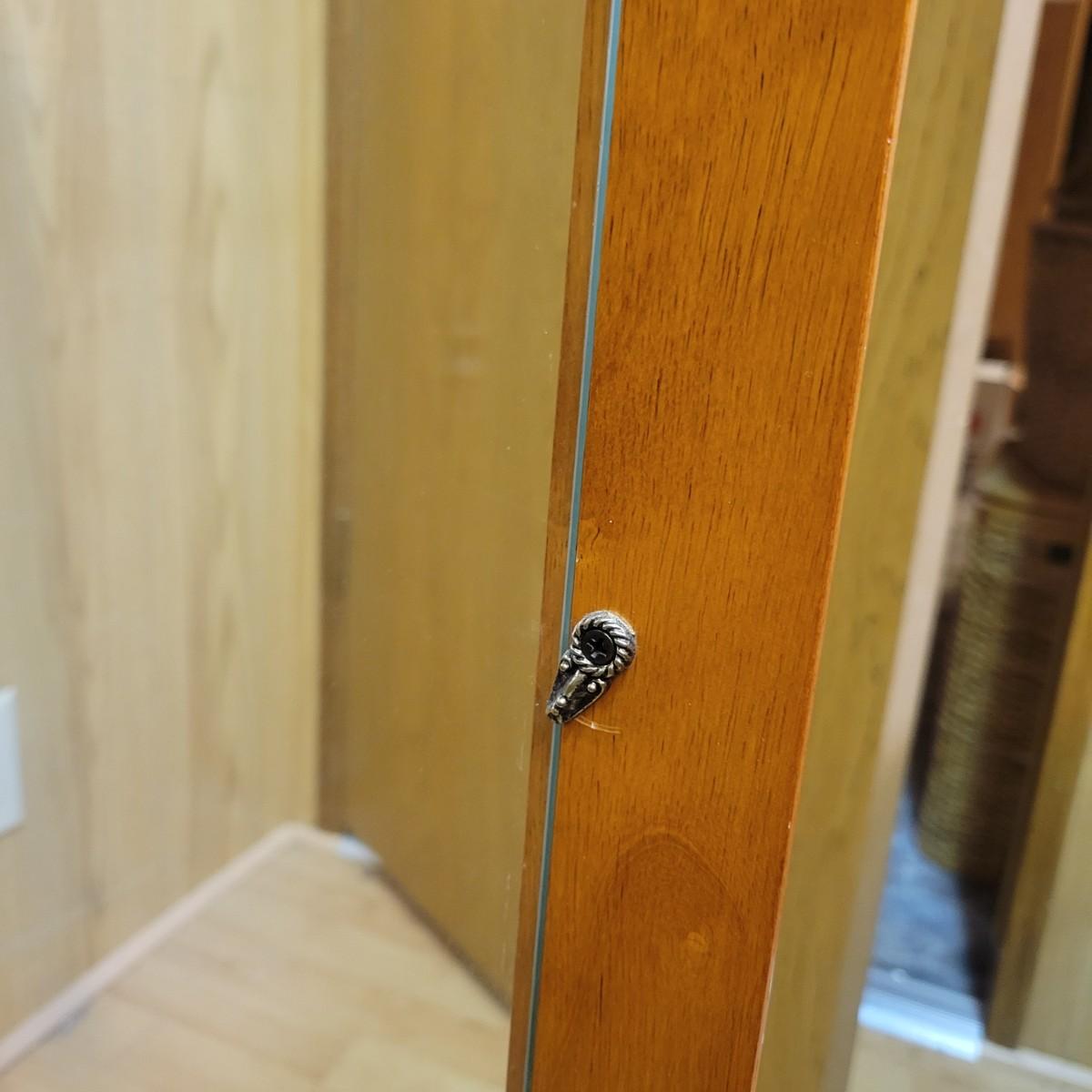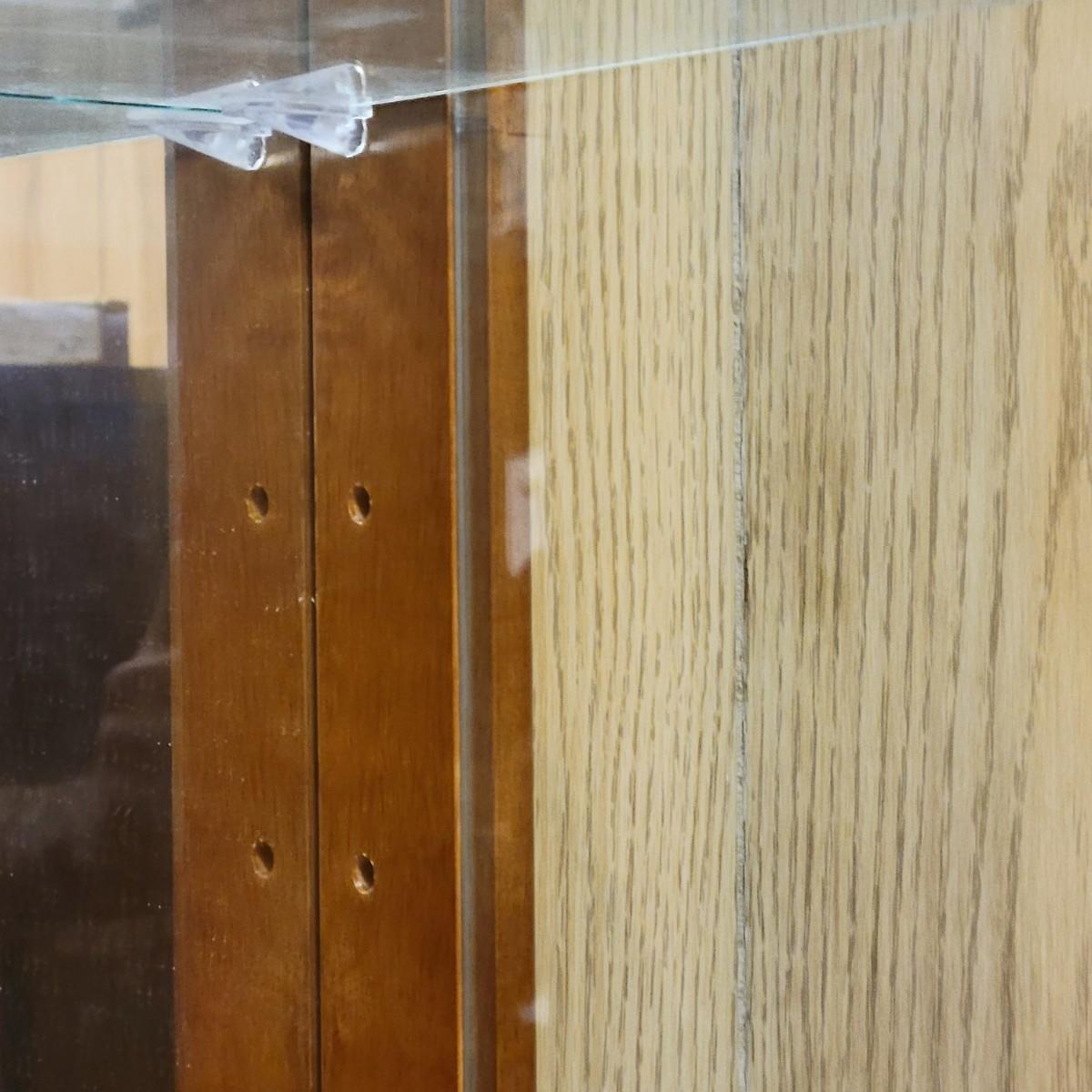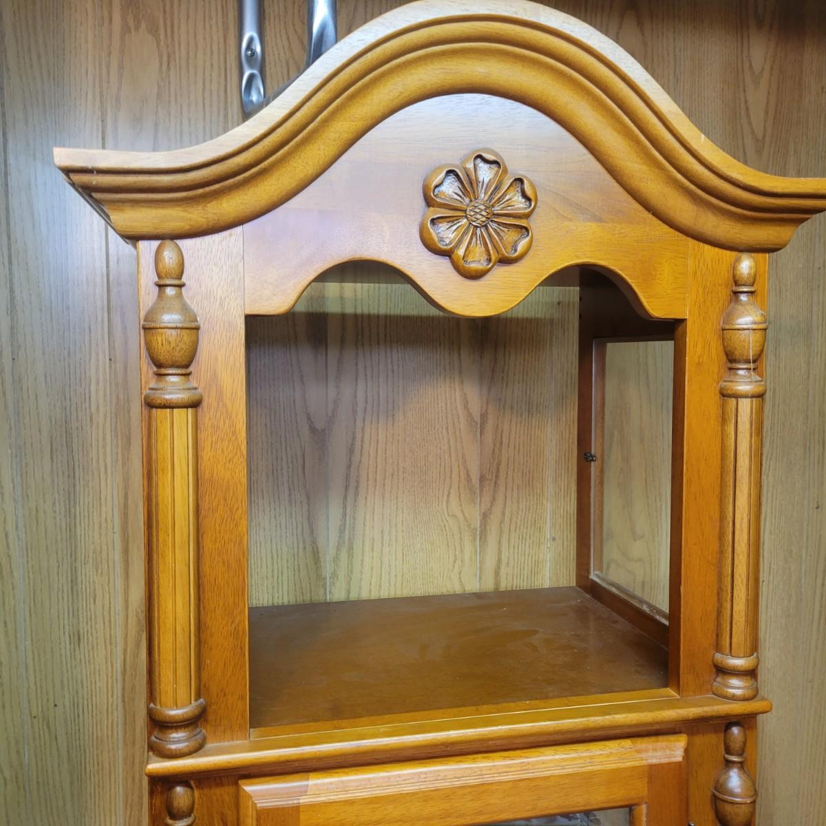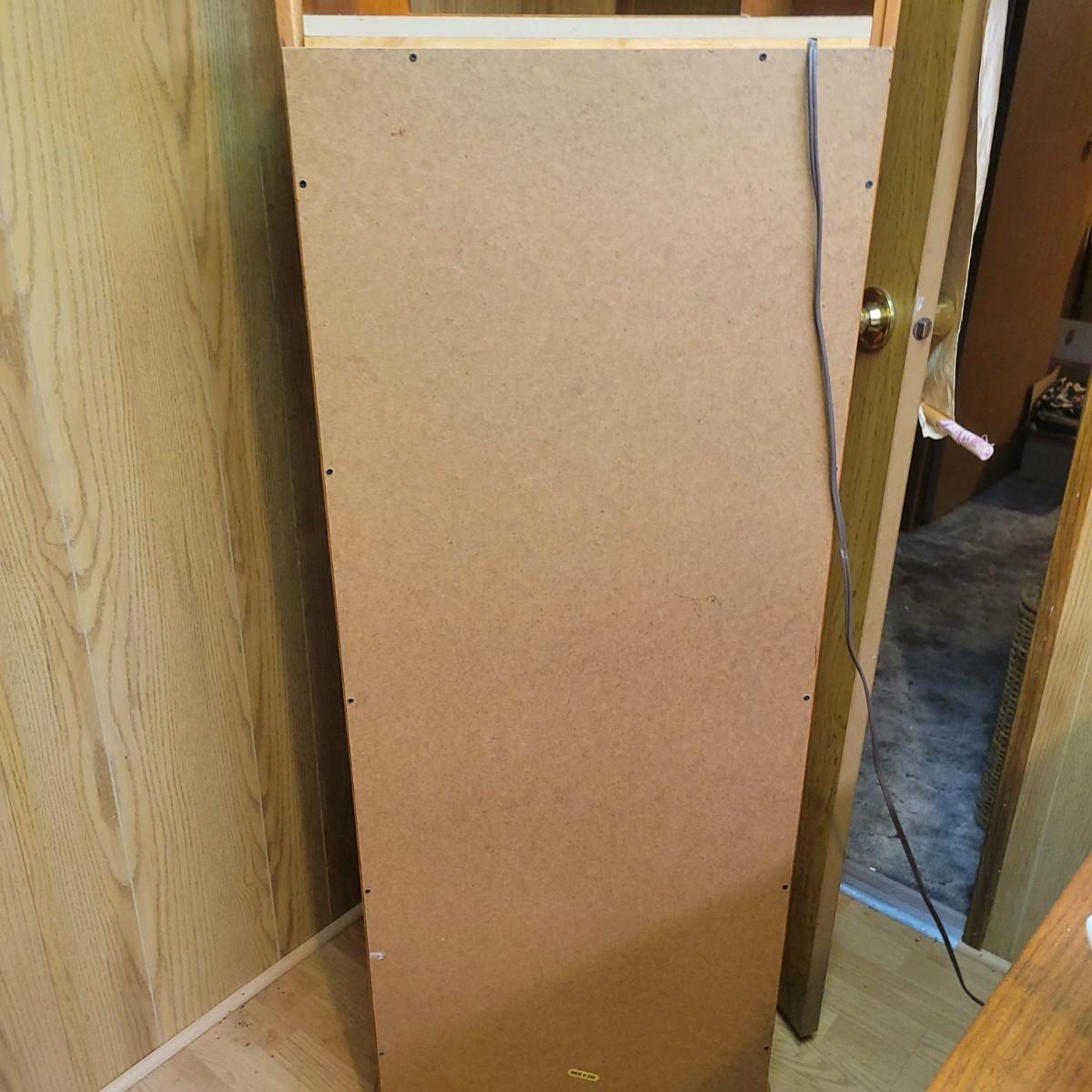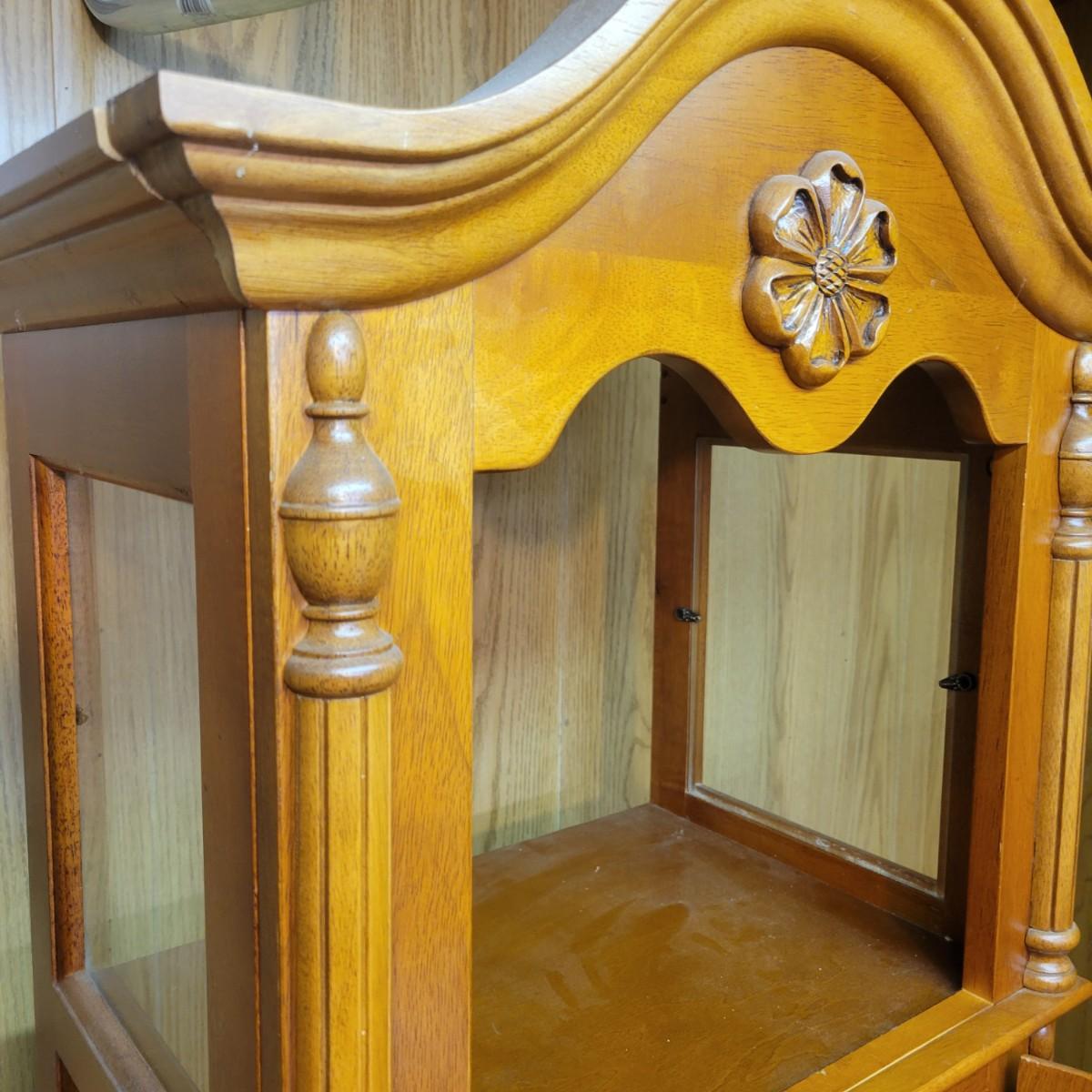 Curio cabinet with three adjustable glass shelves, glass door and a mirror back. Cabinet appears to be made of mdf with a veneer on the out side. Cabinet is in good condition with minor scratches. Measures approximately 19" x 14" x 73" Local pickup only