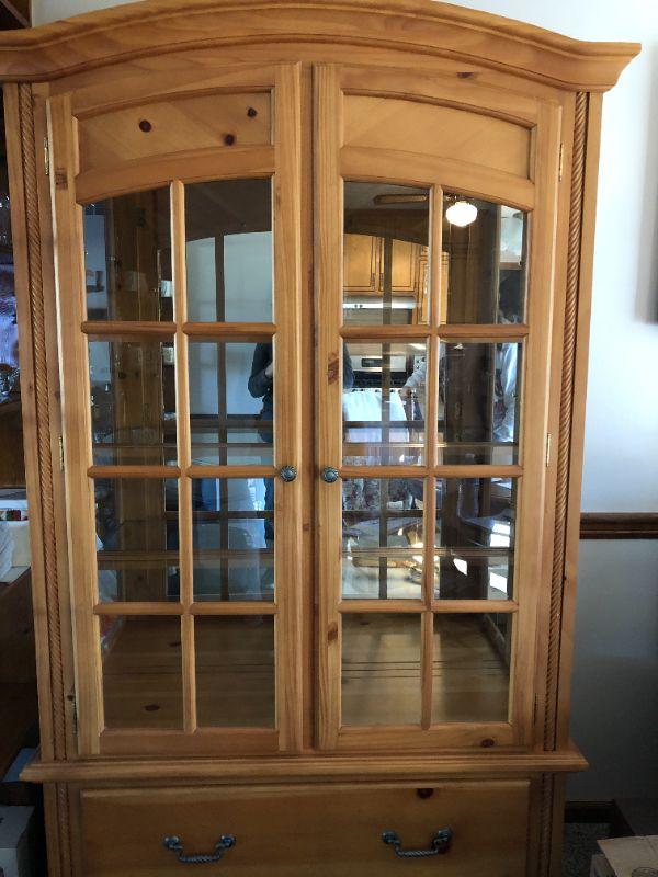 Lighted cabinet with glass shelves. Light wood cabinet in Great Condition (75 1/2" T X 14 1/2 D X 43 1/2 W)