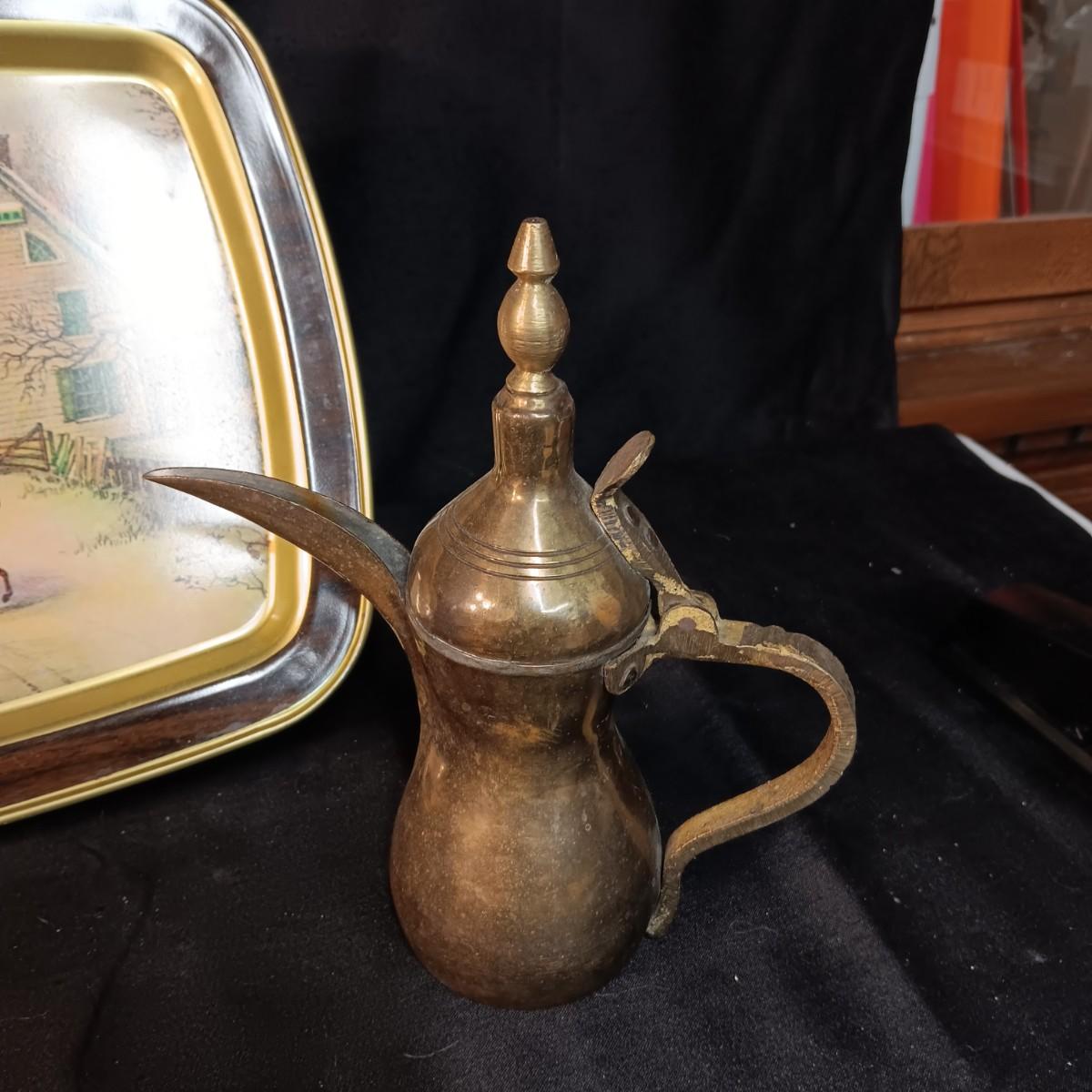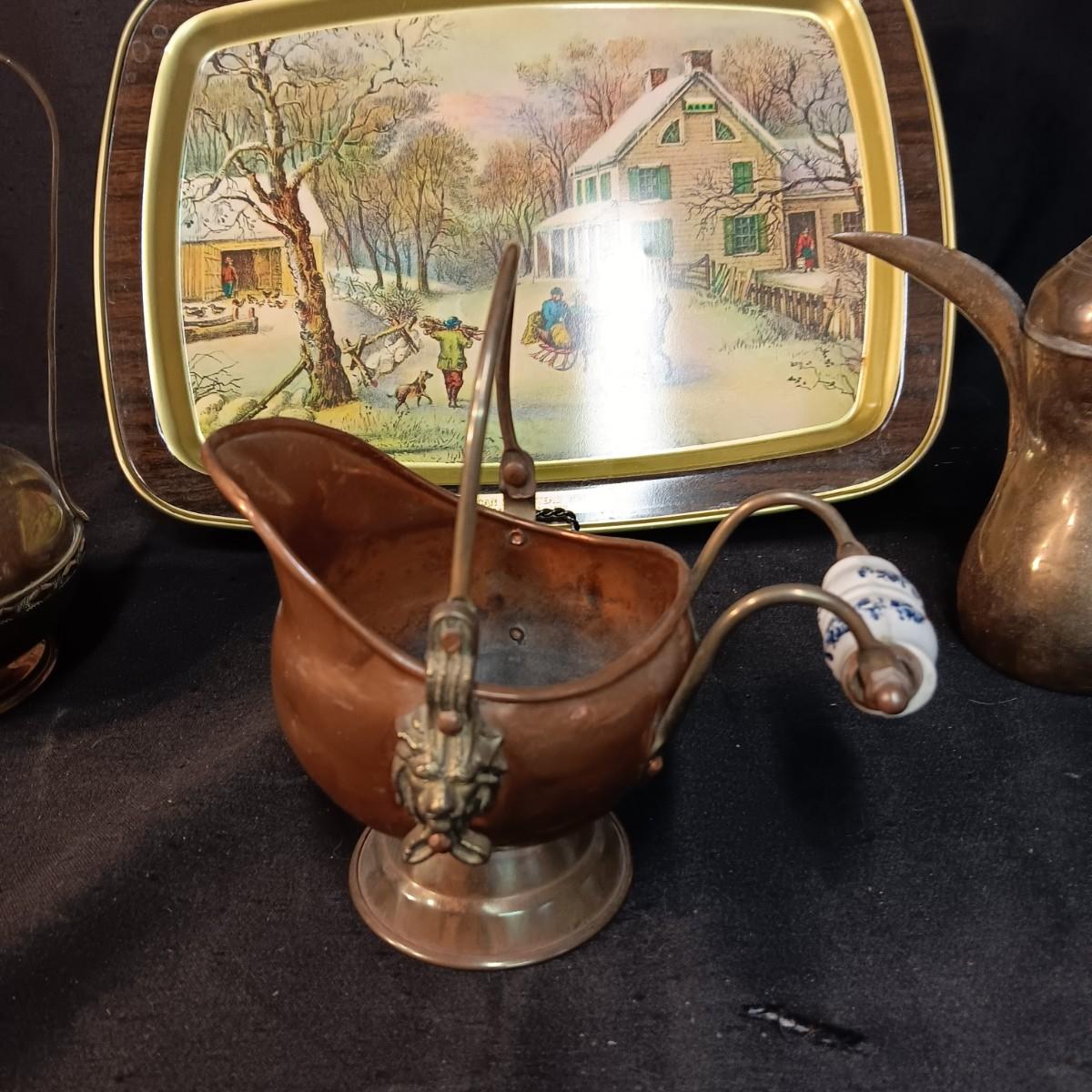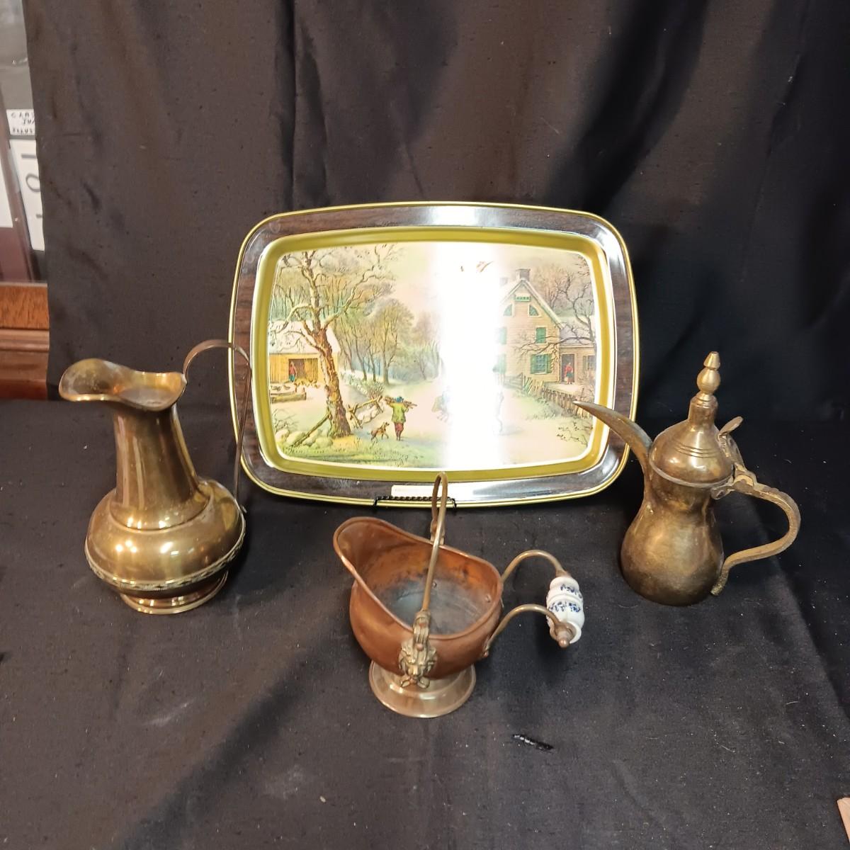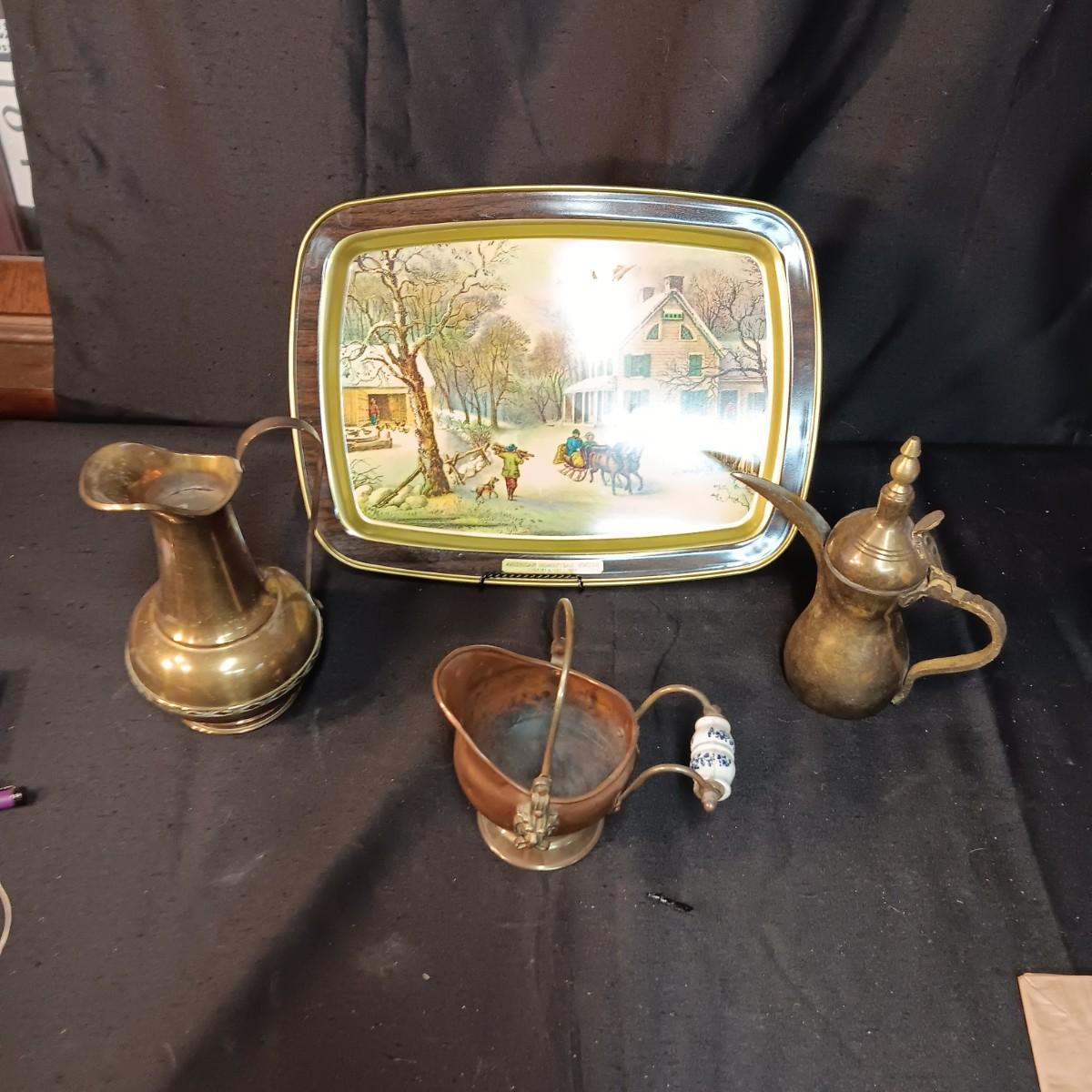 CURRIER & IVES METAL TRAY, BRASS DALLAH COFFEE POT & PITCHER PLUS A COPPER POT