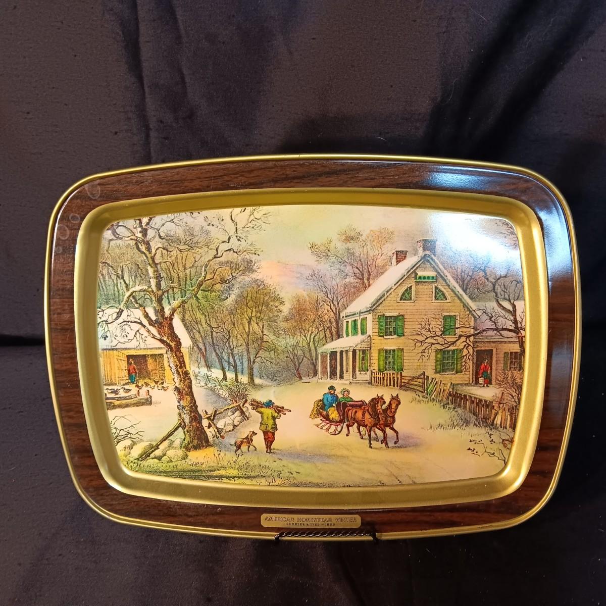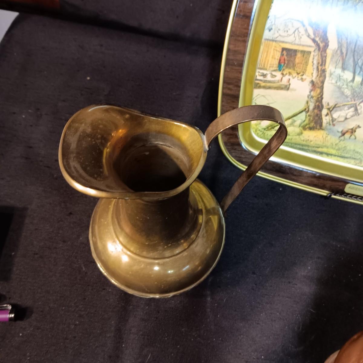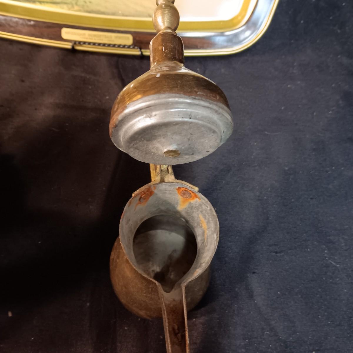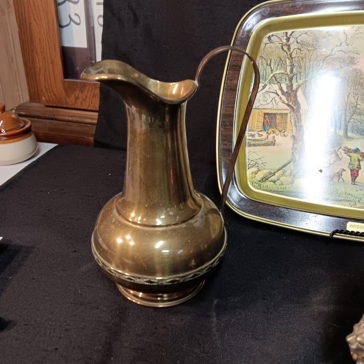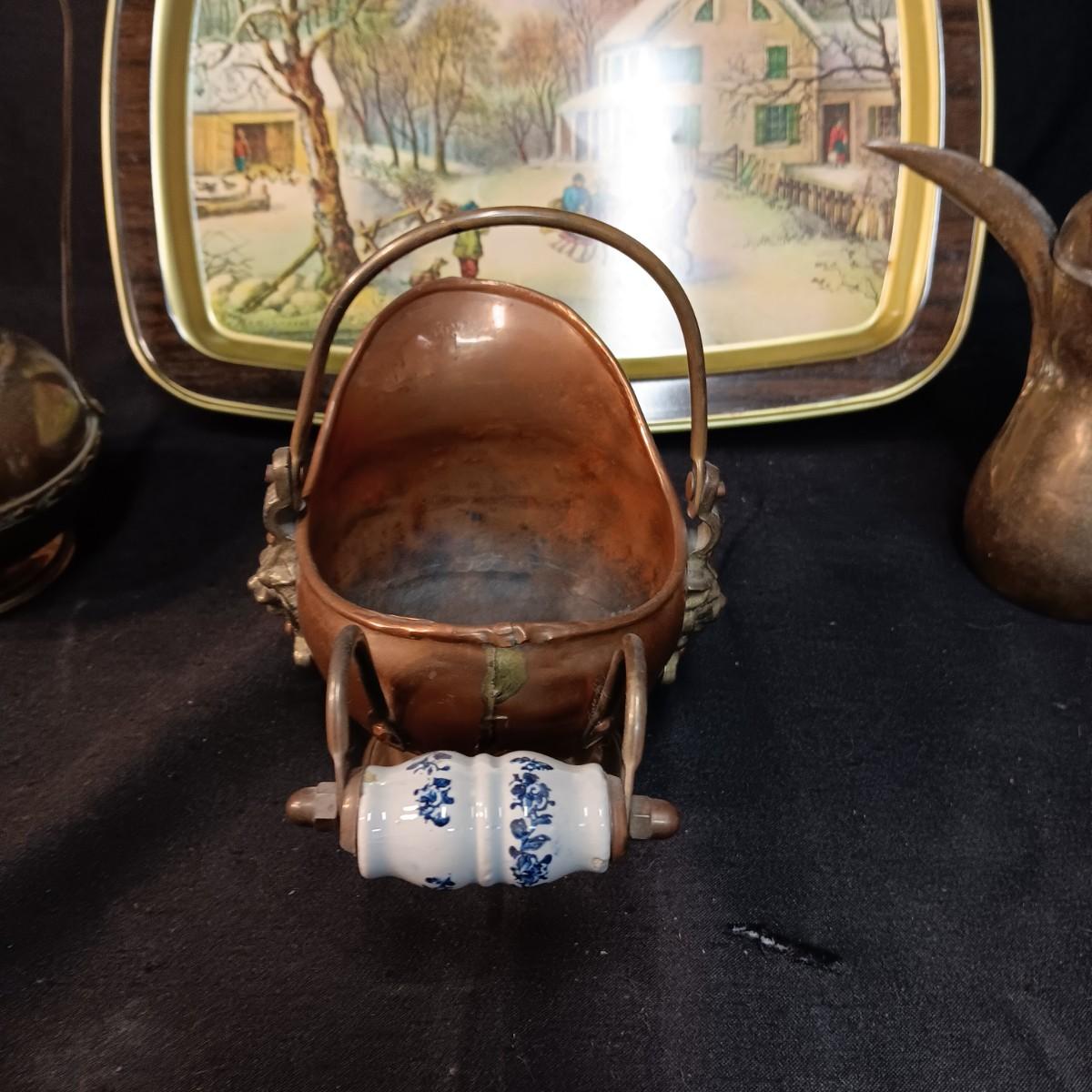 CURRIER & IVES METAL TRAY, BRASS DALLAH COFFEE POT & PITCHER PLUS A COPPER POT