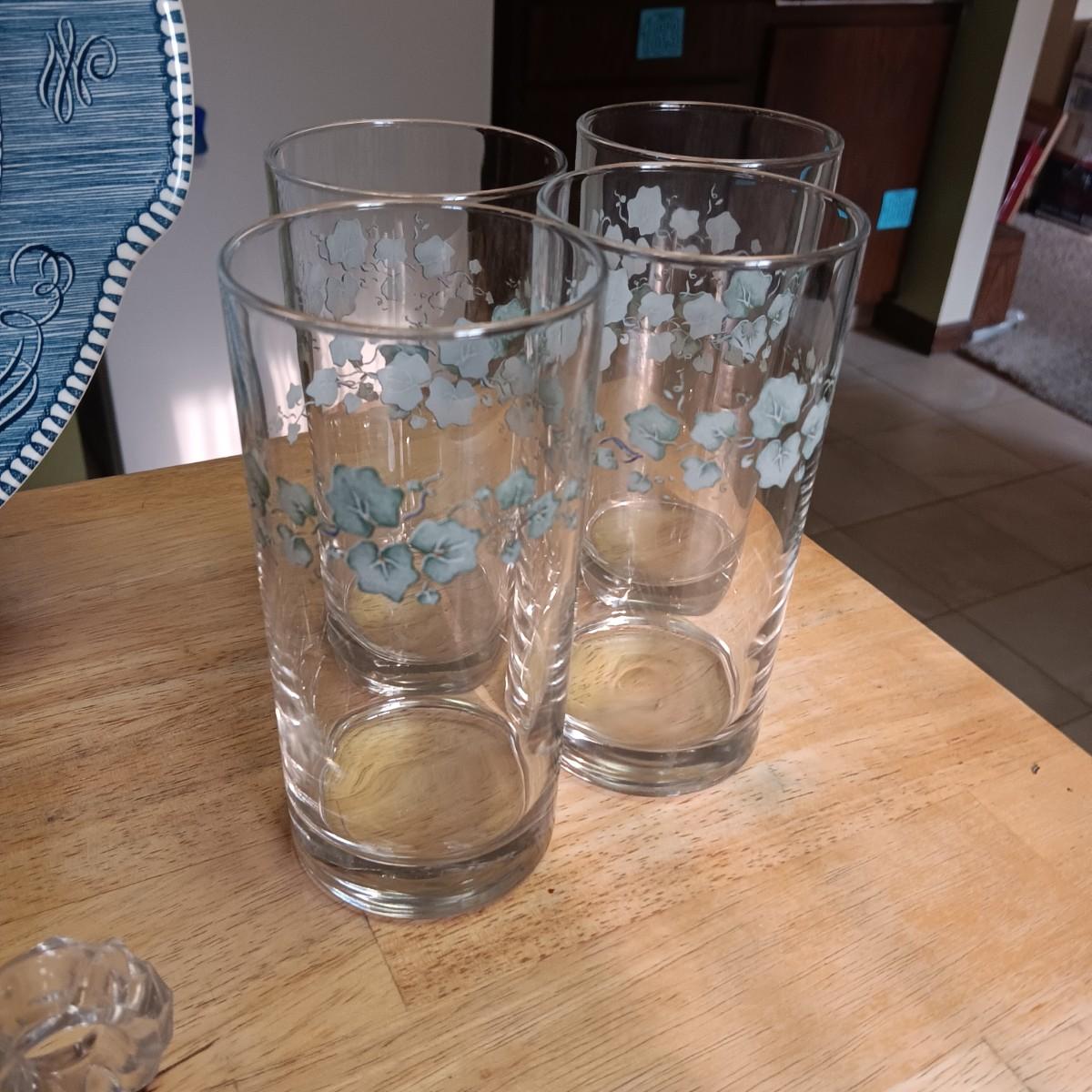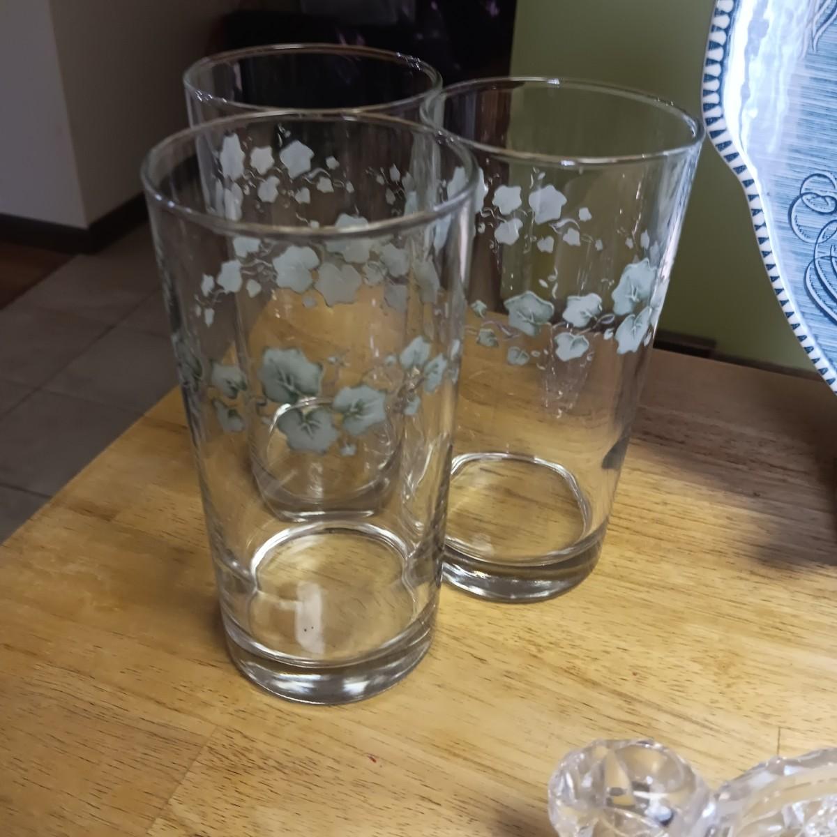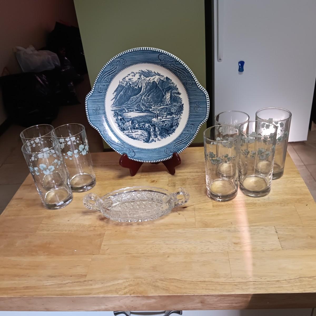 CURRIER & IVES PLATTER, 7 FLORAL GLASSES AND A RELISH TRAY
