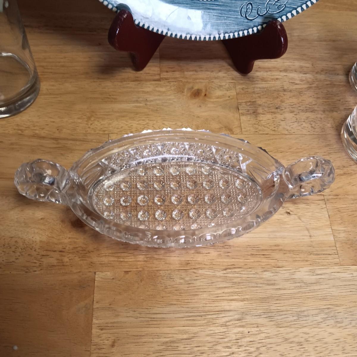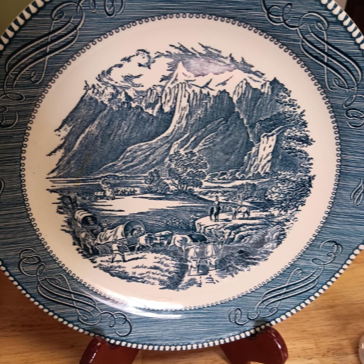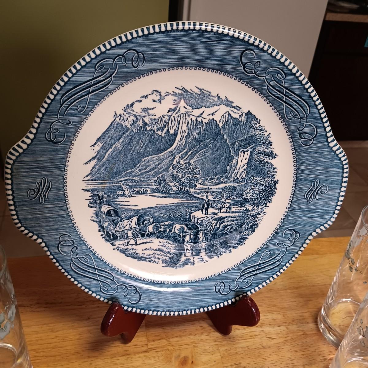 CURRIER & IVES PLATTER, 7 FLORAL GLASSES AND A RELISH TRAY