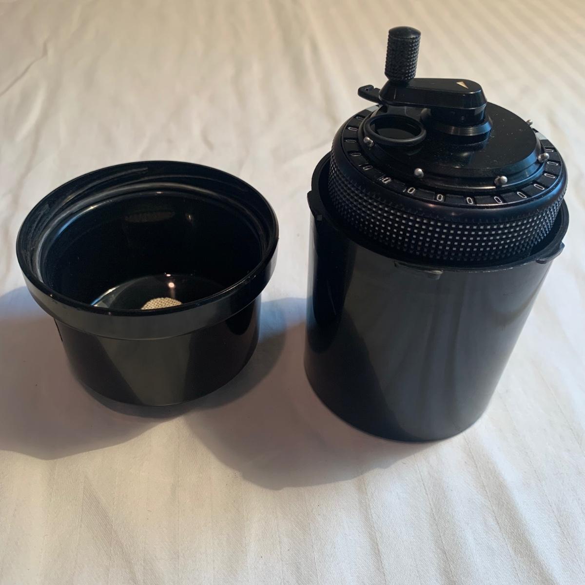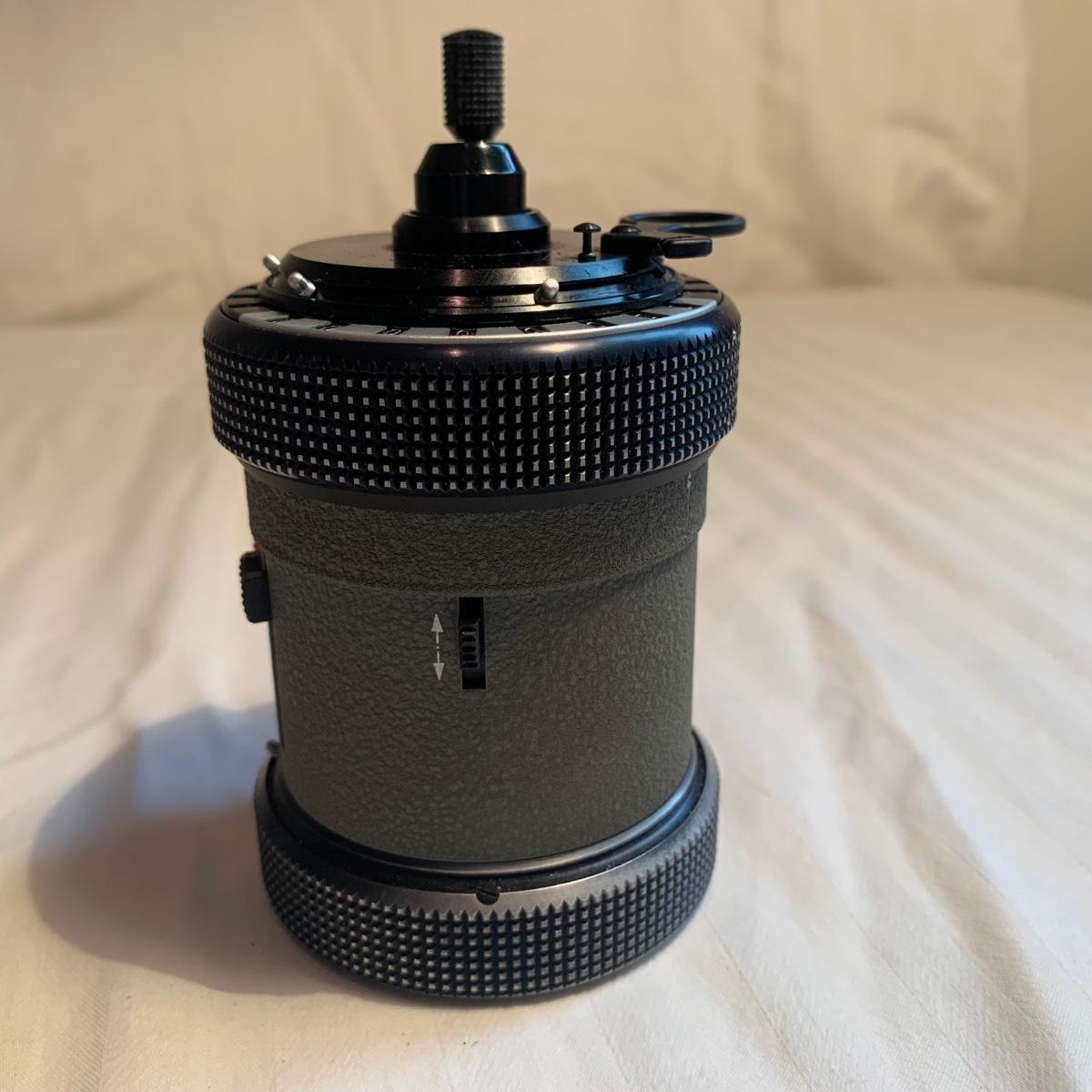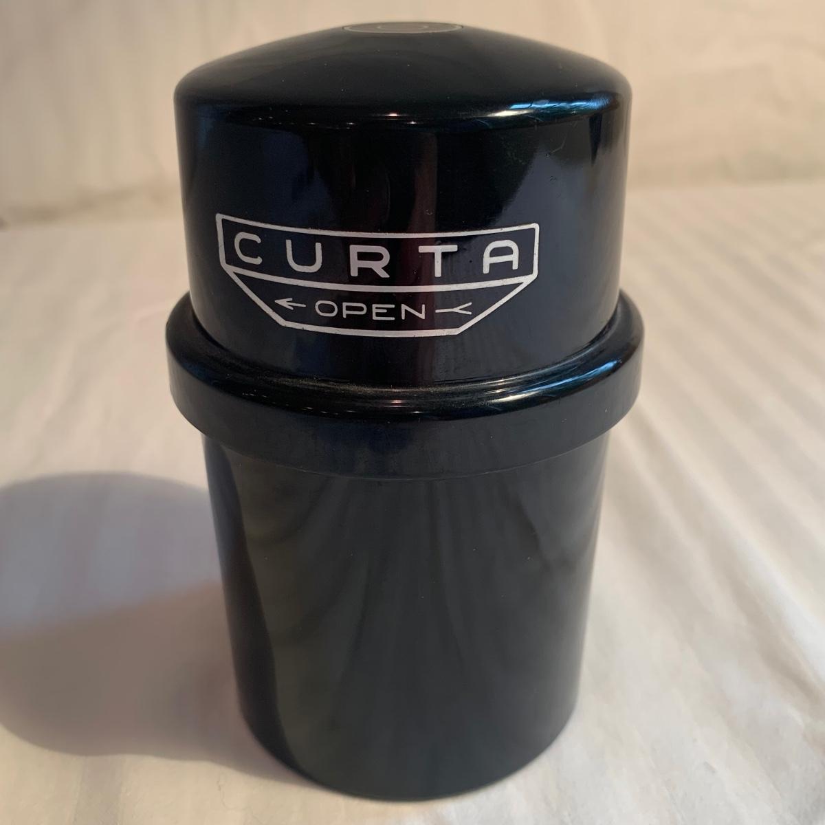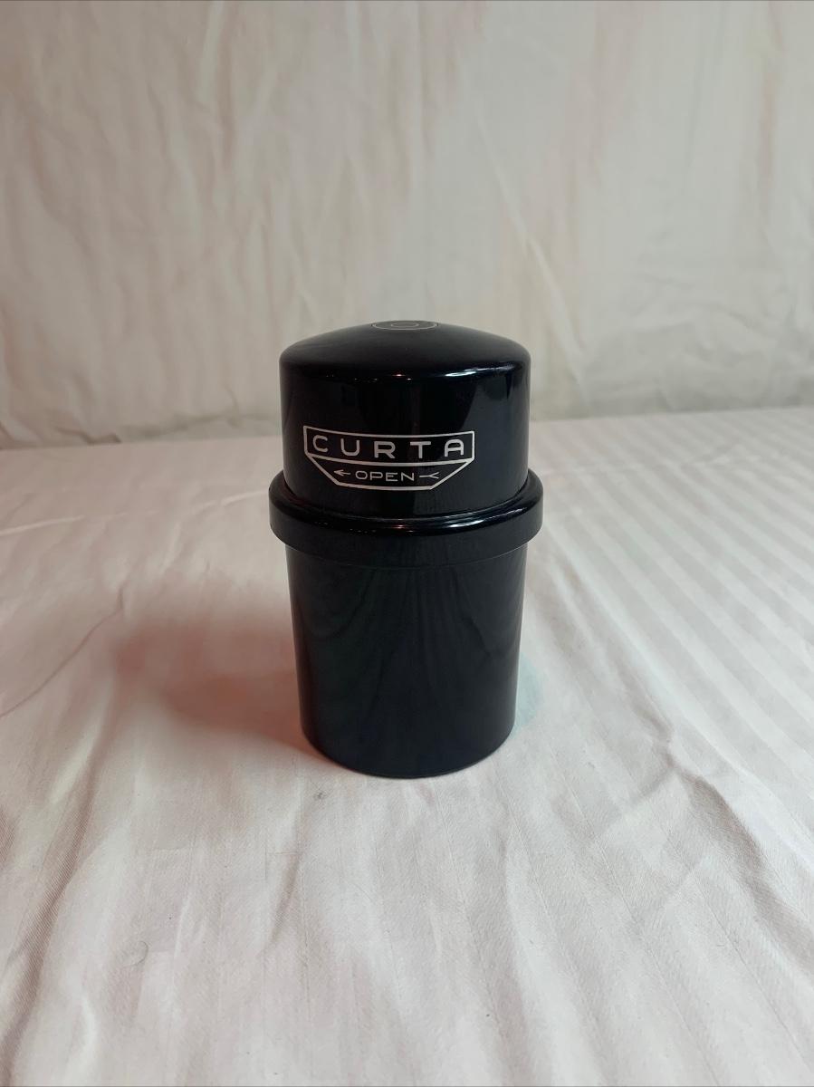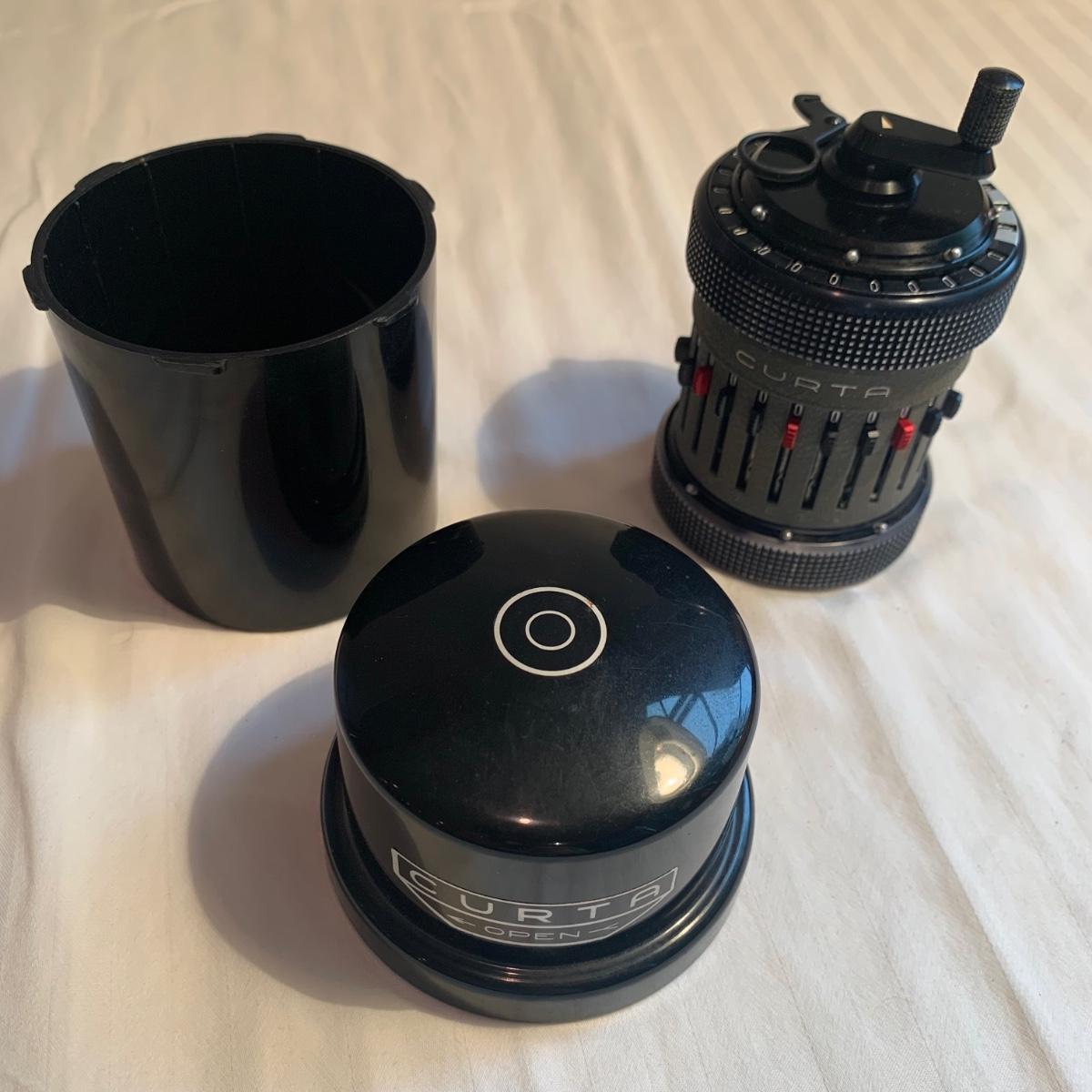 This Curta Type II mechanical calculator comes in a hard plastic case. The metal label on the bottom has come detached from the calculator, but is present. The case measures approximately 3”D x 5”H.