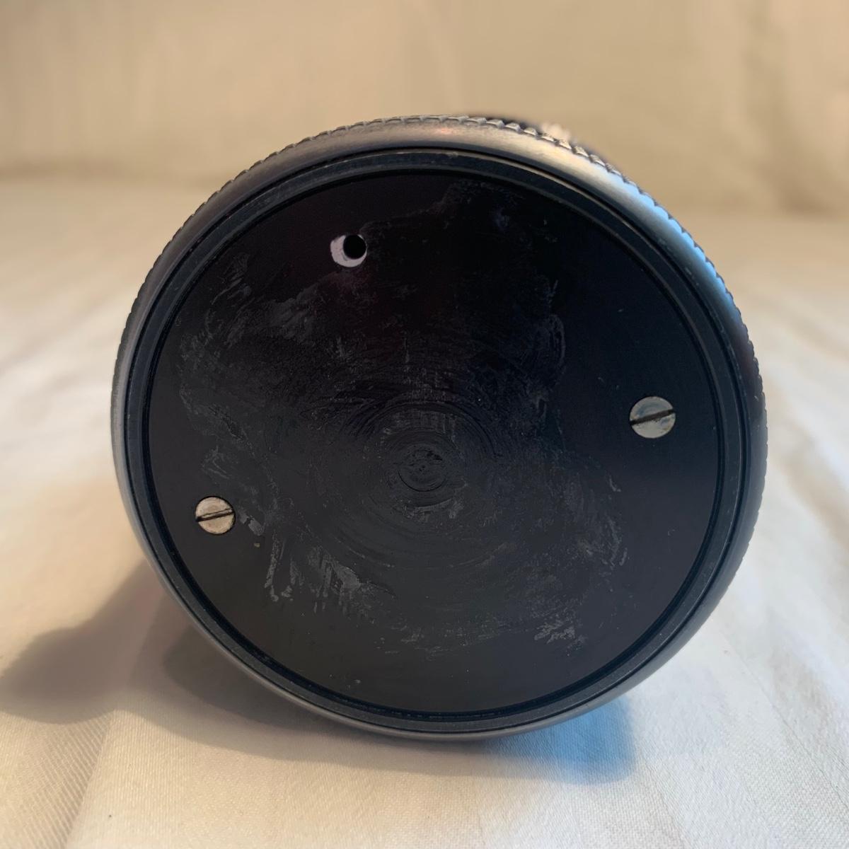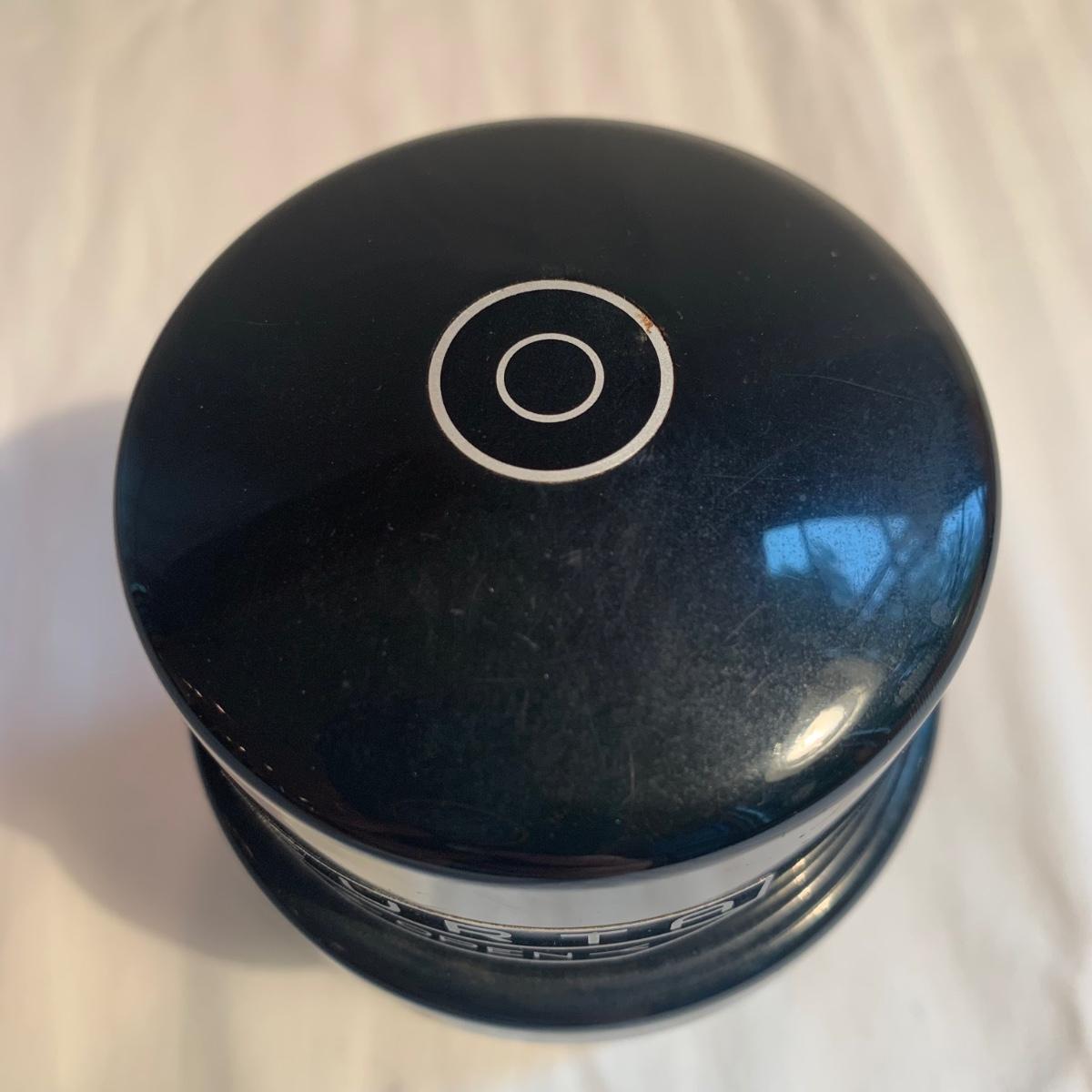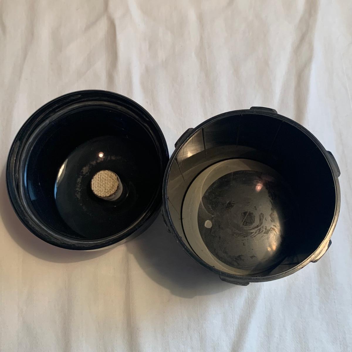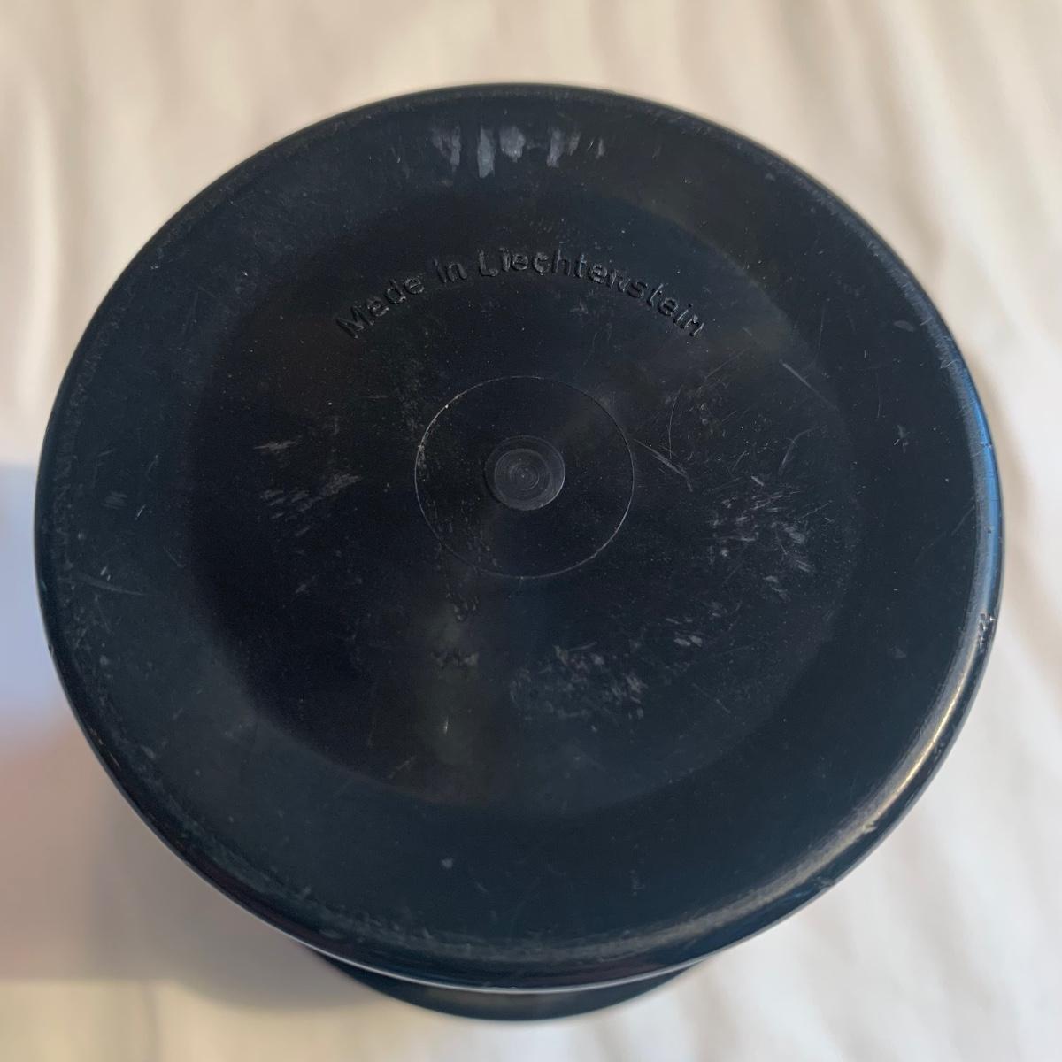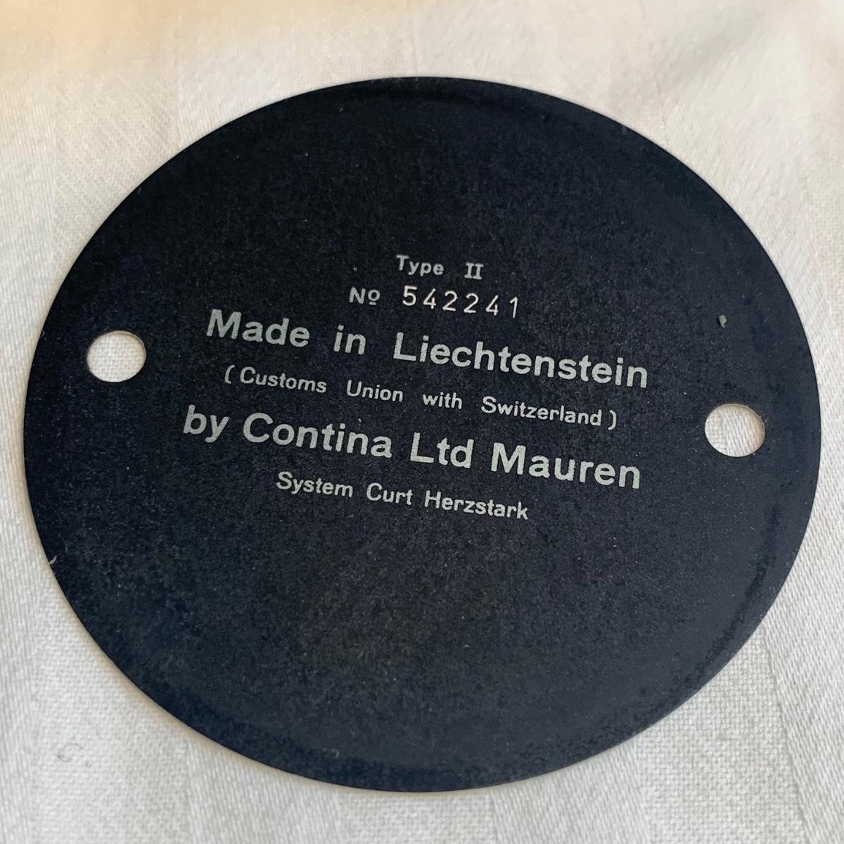 This Curta Type II mechanical calculator comes in a hard plastic case. The metal label on the bottom has come detached from the calculator, but is present. The case measures approximately 3”D x 5”H.