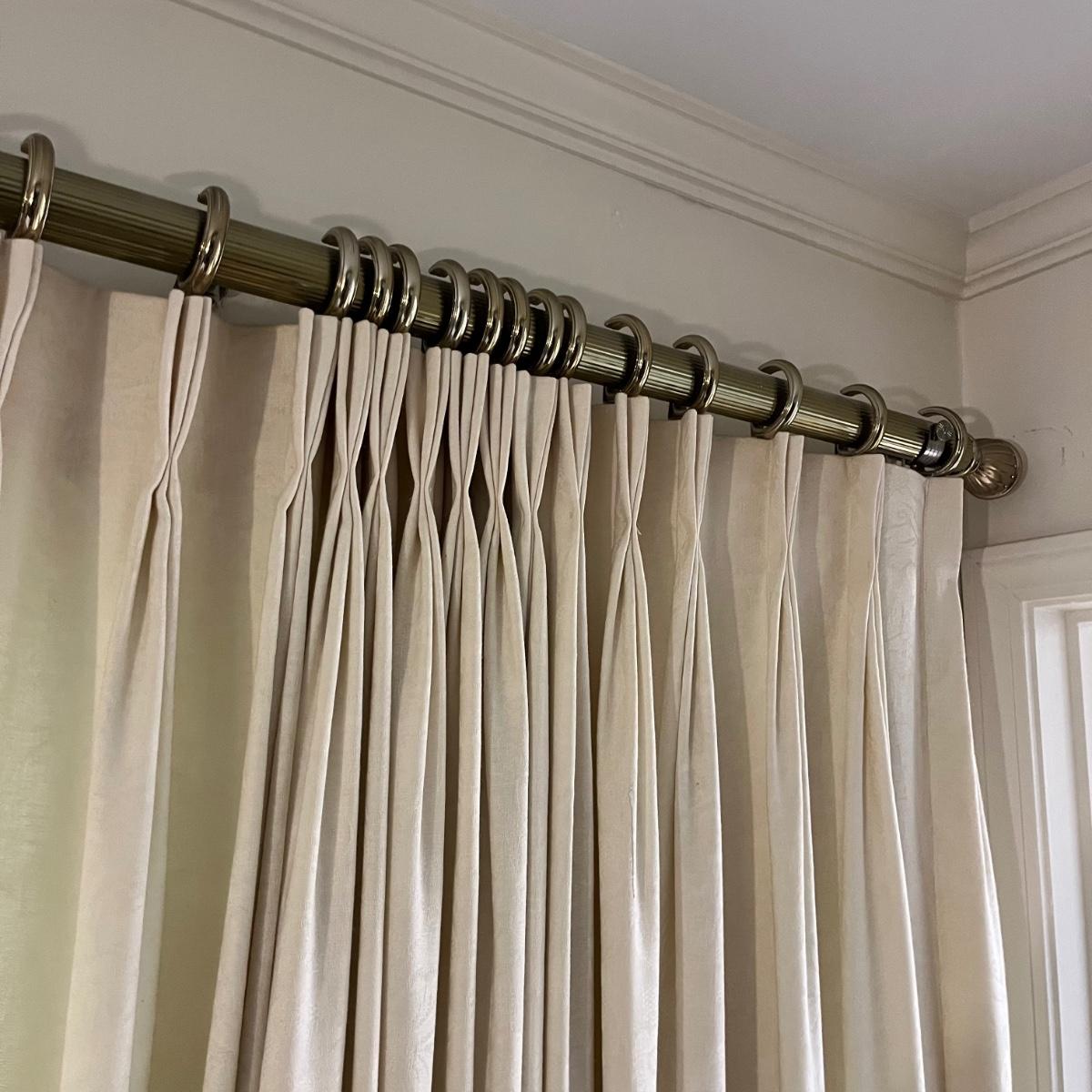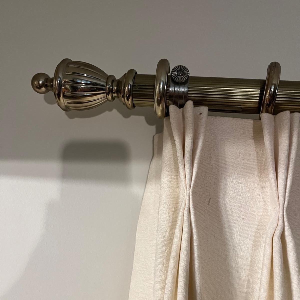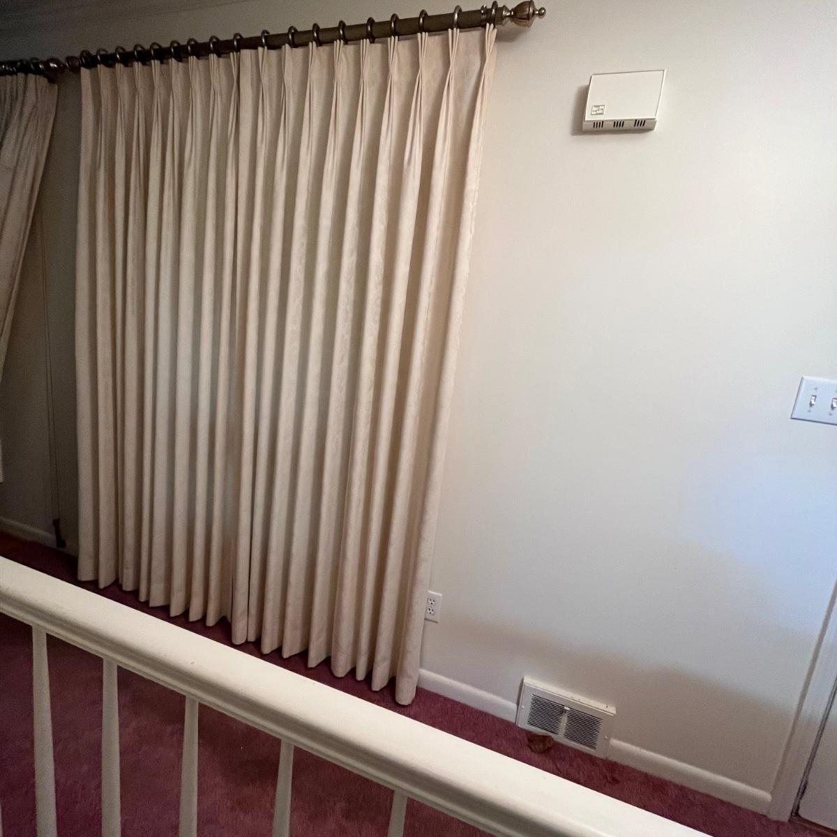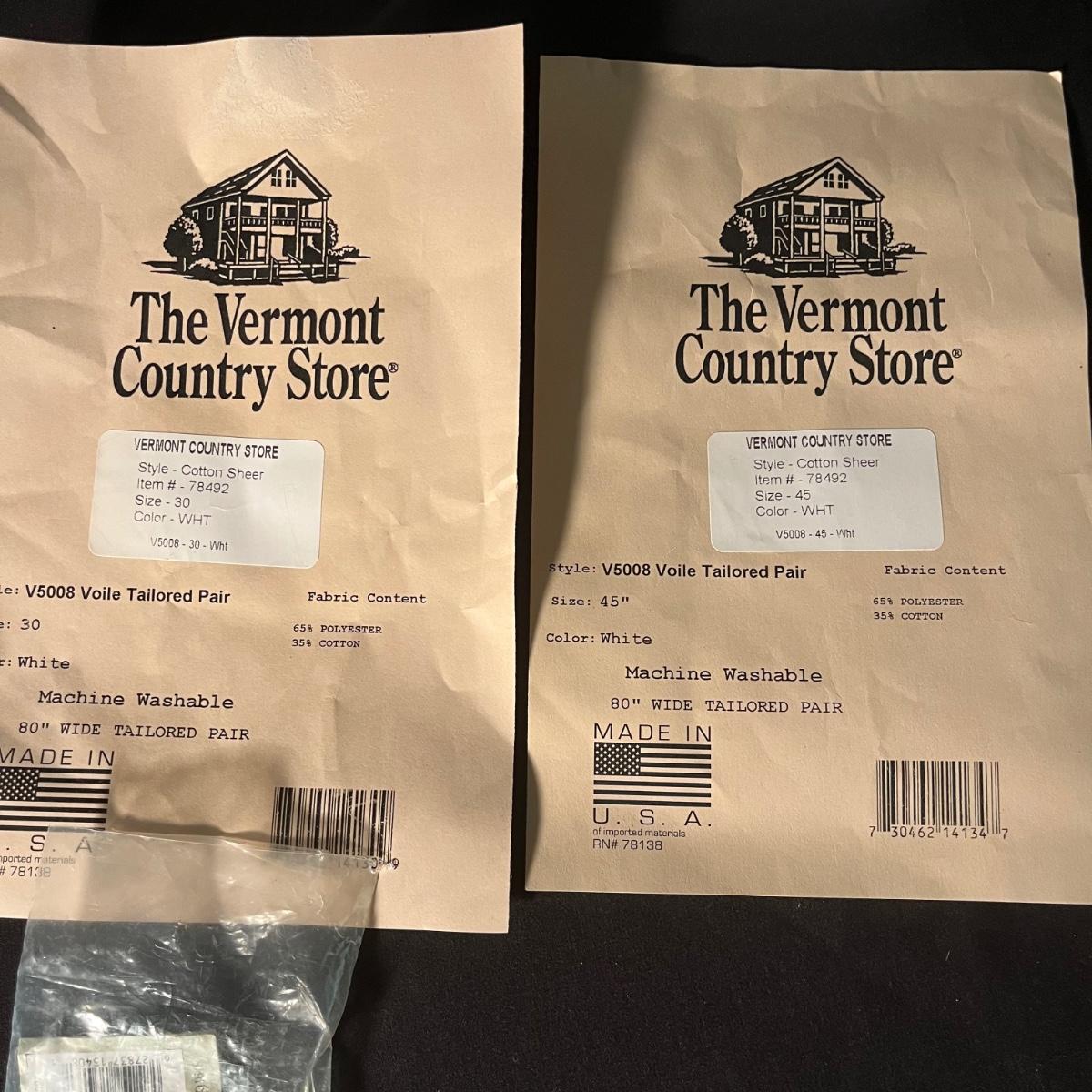 Lot includes a collection of matching curtain panels. Panel measure 2@ 84” tall x 36” wide, 2@ 84” tall x 96” wide, 2@ 80” tall x 52” wide, 2@ 84” tall x 70” wide, 2@ 81” tall x 72” wide and one 84” tall x 90” wide. The 6 curtain rods are available to winning bidder. Curtain rods are mounted to wall and will need to be taken off by winning bidder. Rods are 4 inches longer than two curtain panels. Also includes two pairs of Vermont Country Store sheer panels.