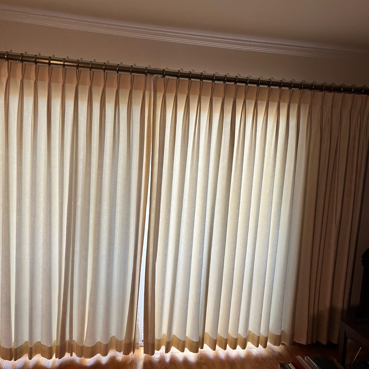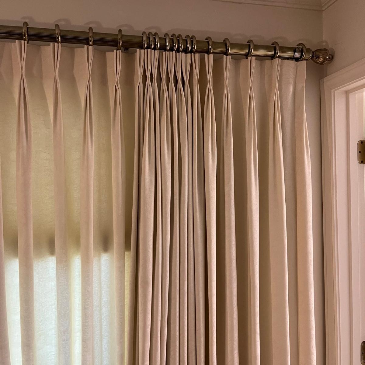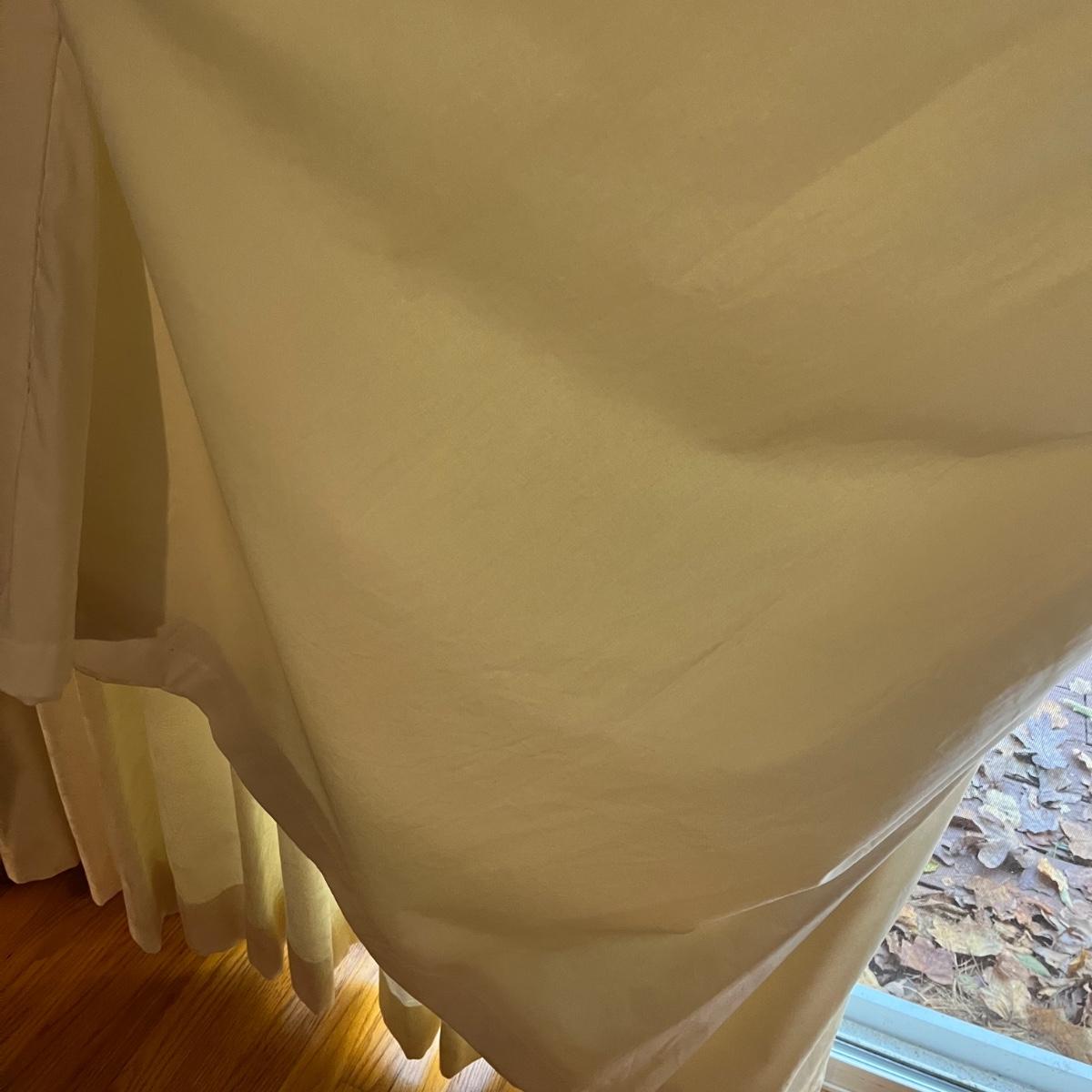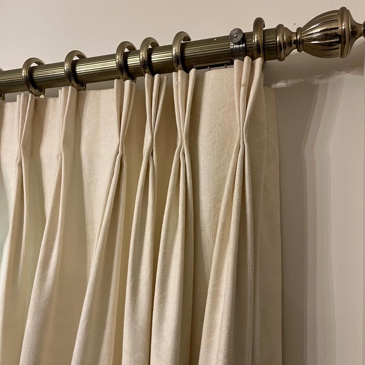 Lot includes a collection of matching curtain panels. Panel measure 2@ 84” tall x 36” wide, 2@ 84” tall x 96” wide, 2@ 80” tall x 52” wide, 2@ 84” tall x 70” wide, 2@ 81” tall x 72” wide and one 84” tall x 90” wide. The 6 curtain rods are available to winning bidder. Curtain rods are mounted to wall and will need to be taken off by winning bidder. Rods are 4 inches longer than two curtain panels. Also includes two pairs of Vermont Country Store sheer panels.