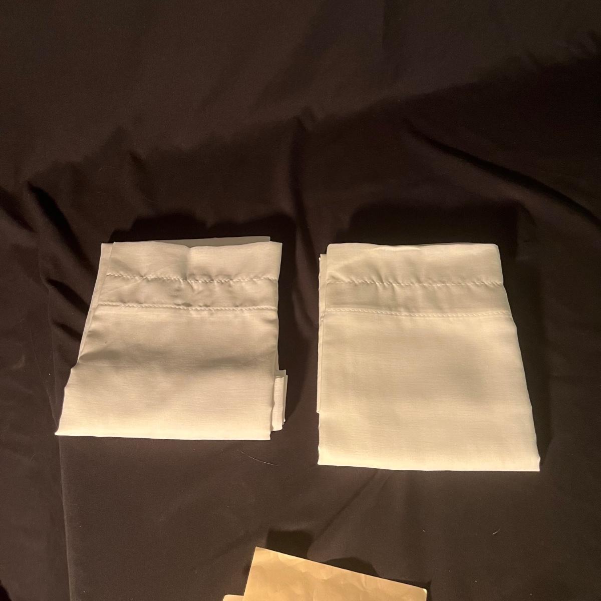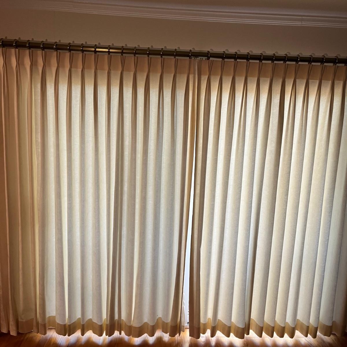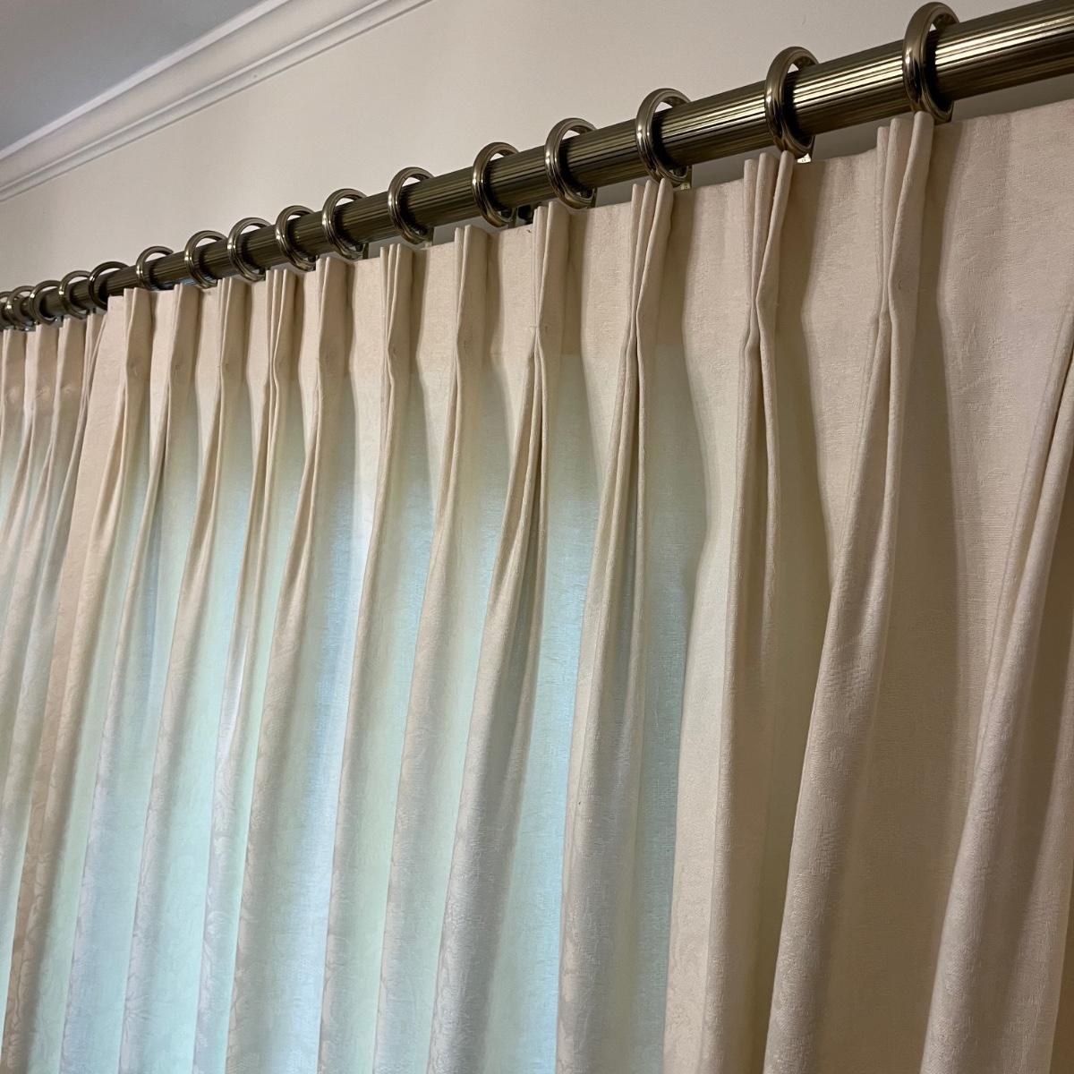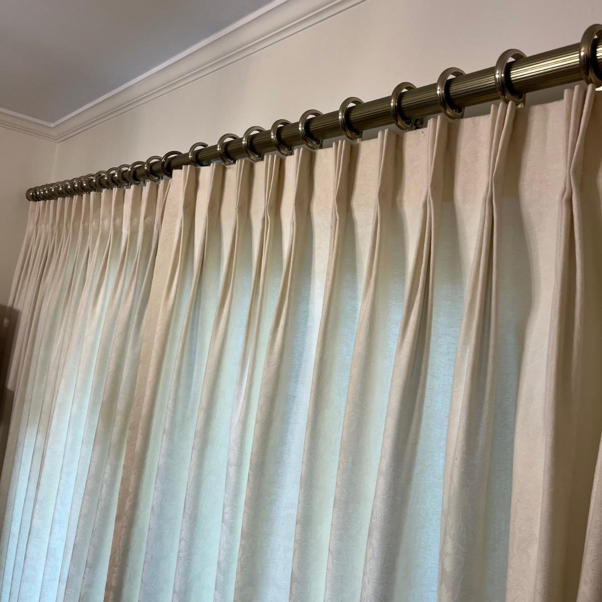 Lot includes a collection of matching curtain panels. Panel measure 2@ 84” tall x 36” wide, 2@ 84” tall x 96” wide, 2@ 80” tall x 52” wide, 2@ 84” tall x 70” wide, 2@ 81” tall x 72” wide and one 84” tall x 90” wide. The 6 curtain rods are available to winning bidder. Curtain rods are mounted to wall and will need to be taken off by winning bidder. Rods are 4 inches longer than two curtain panels. Also includes two pairs of Vermont Country Store sheer panels.