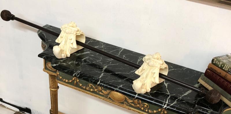 Curtain rod adjusts from 4' to 6 1/2', brackets are resin.