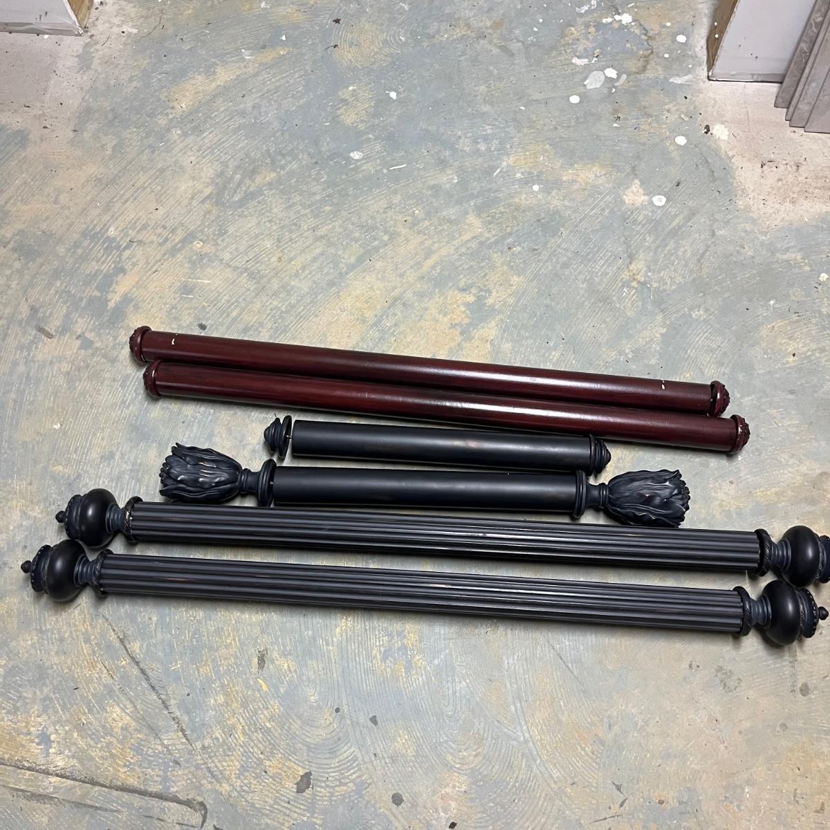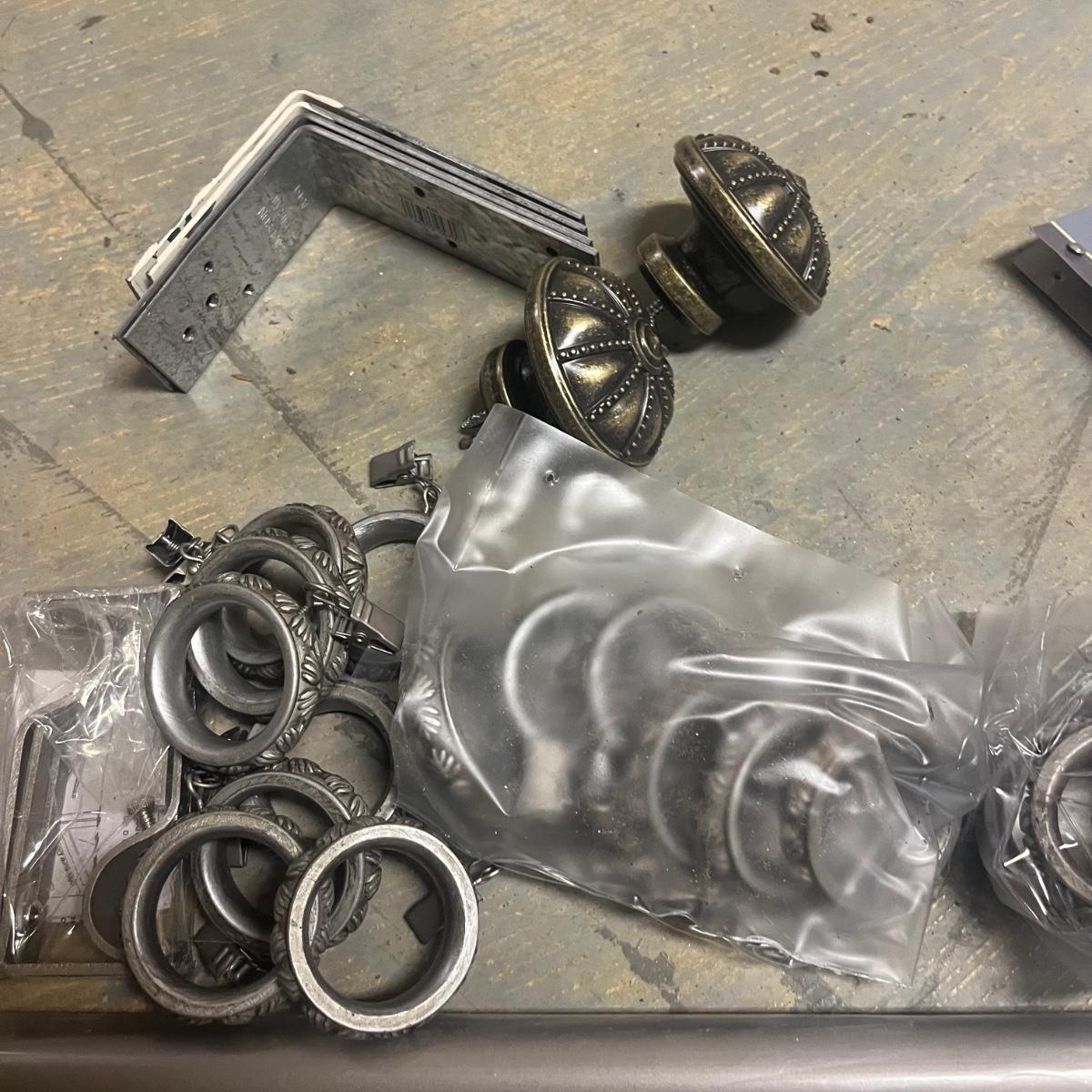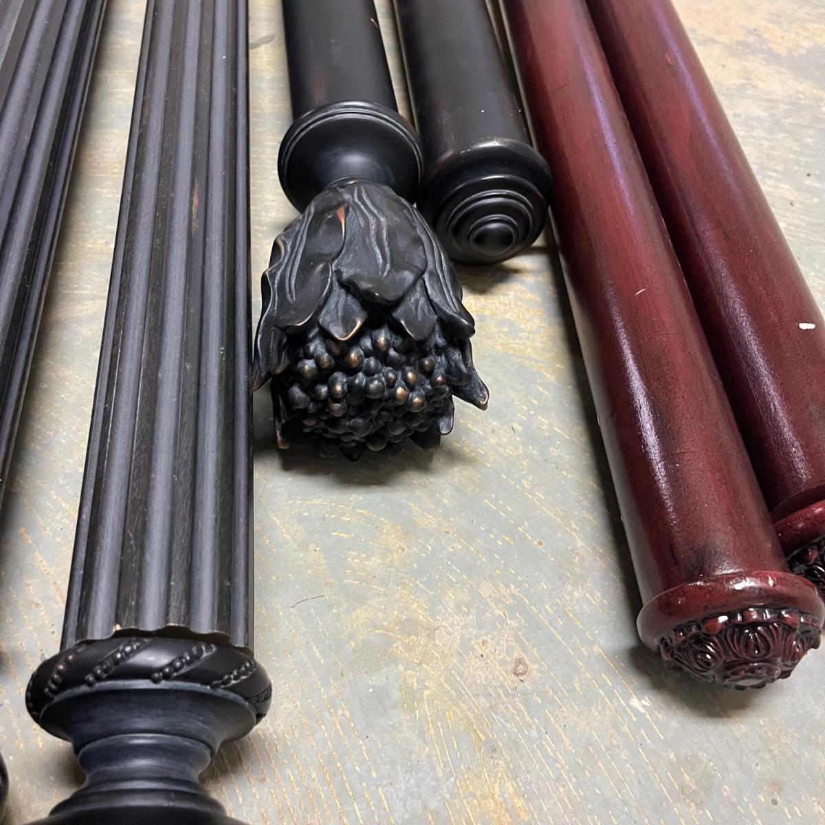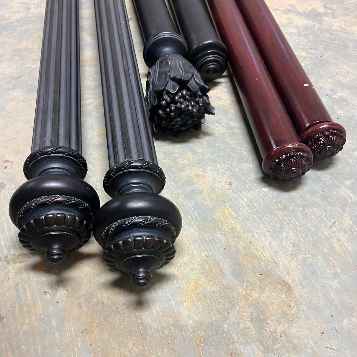Lot includes three pairs of curtain rods with finials attached with the longest measuring 3.5”D x 45” including finial. Also includes a large selection of wooden rings and two sets of four mounting brackets. Most items appear to be wood with a few that are resin. Also includes a nickel colored finial, rings and a 88” long metal adjustable length rod.