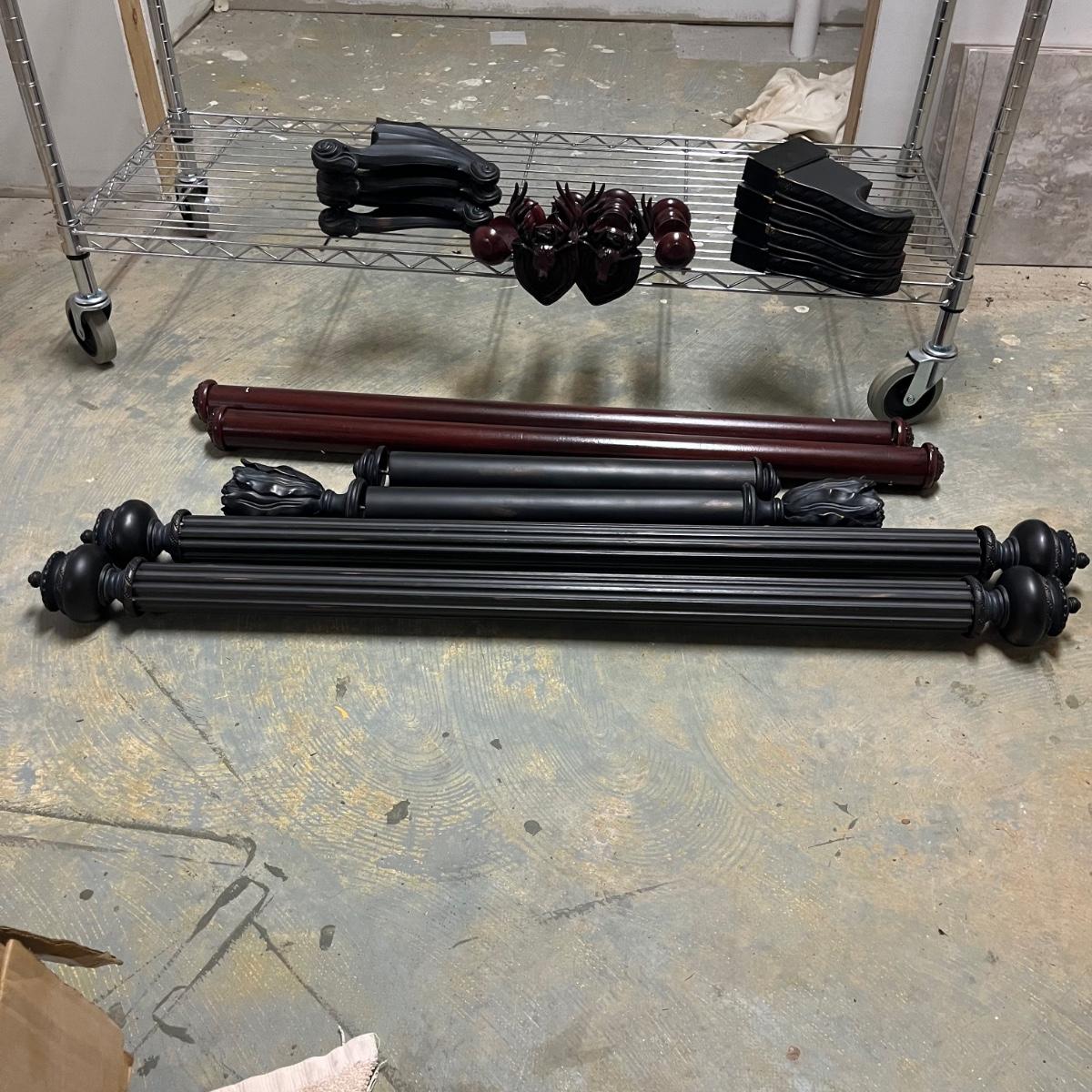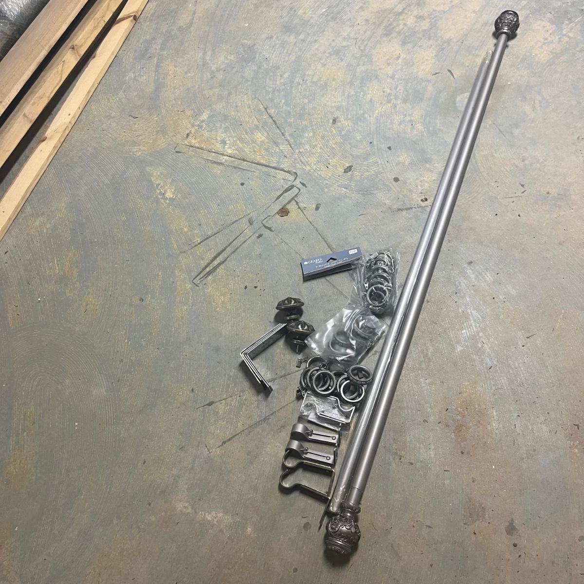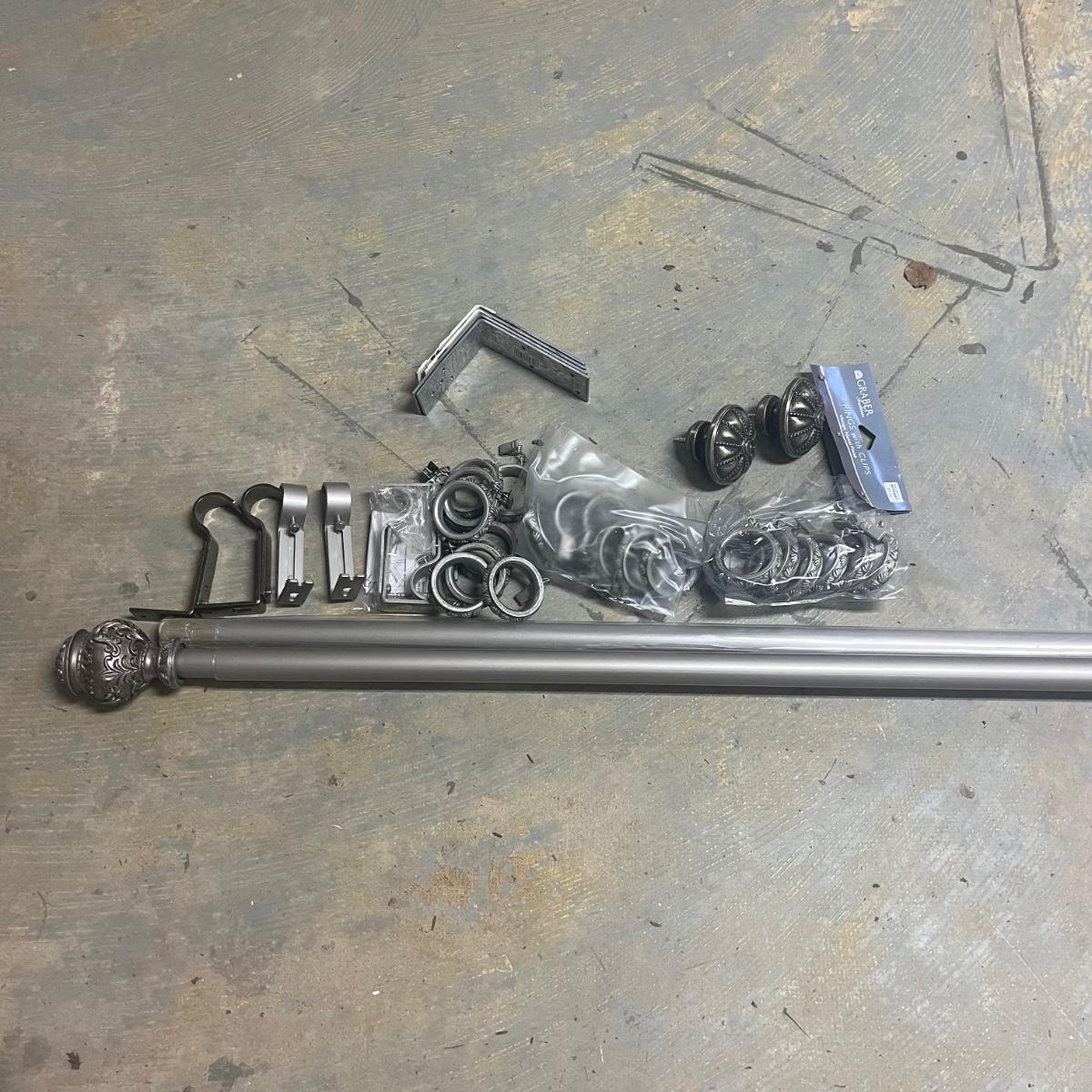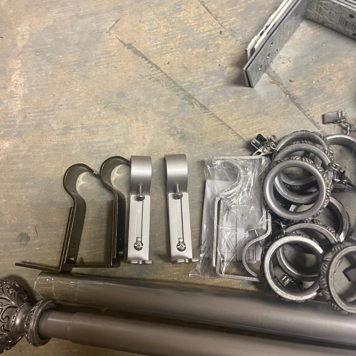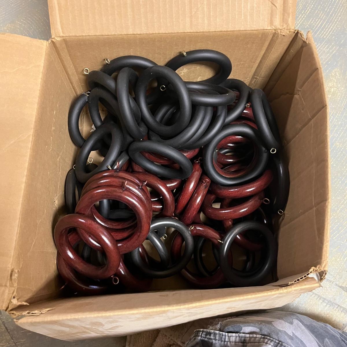 Lot includes three pairs of curtain rods with finials attached with the longest measuring 3.5”D x 45” including finial. Also includes a large selection of wooden rings and two sets of four mounting brackets. Most items appear to be wood with a few that are resin. Also includes a nickel colored finial, rings and a 88” long metal adjustable length rod.