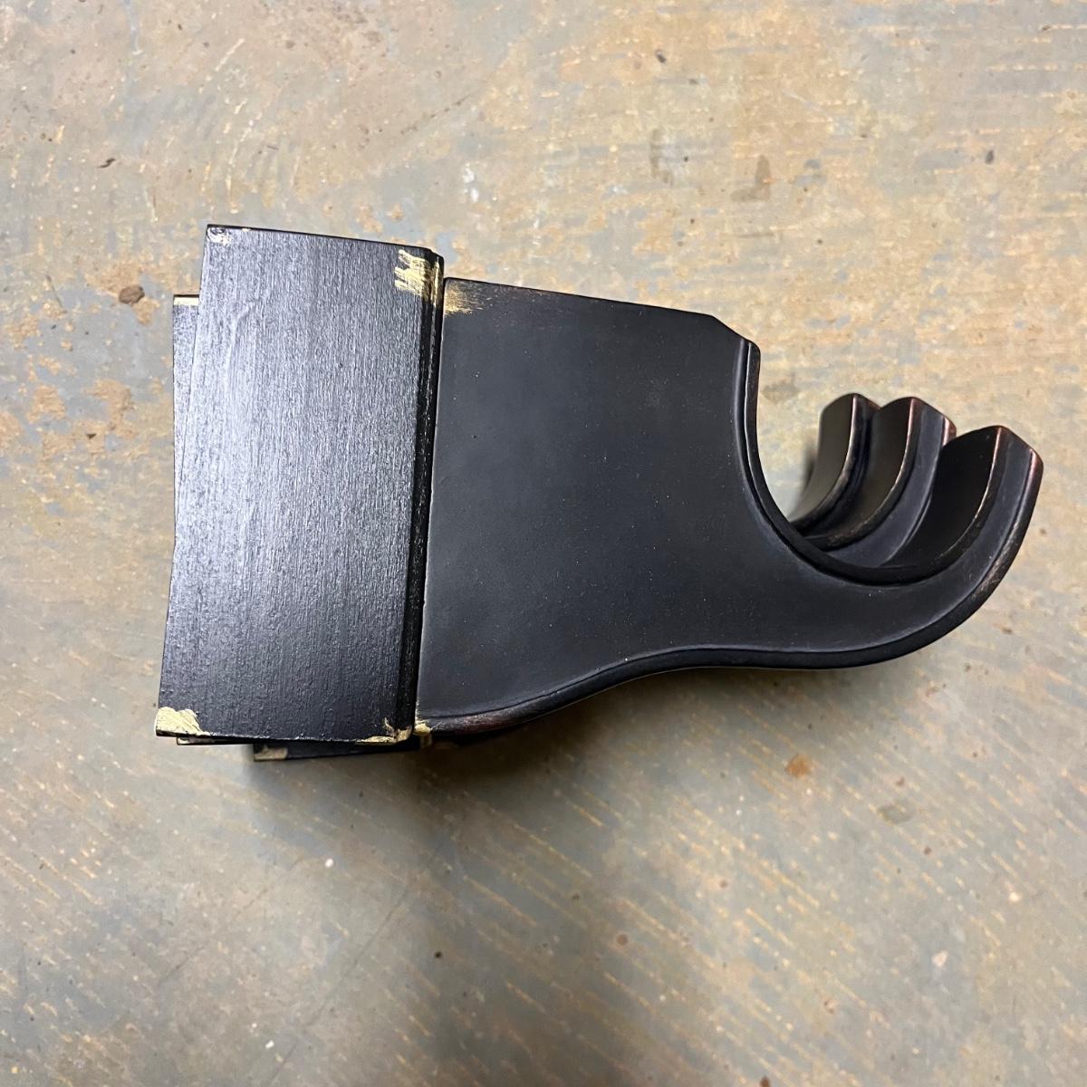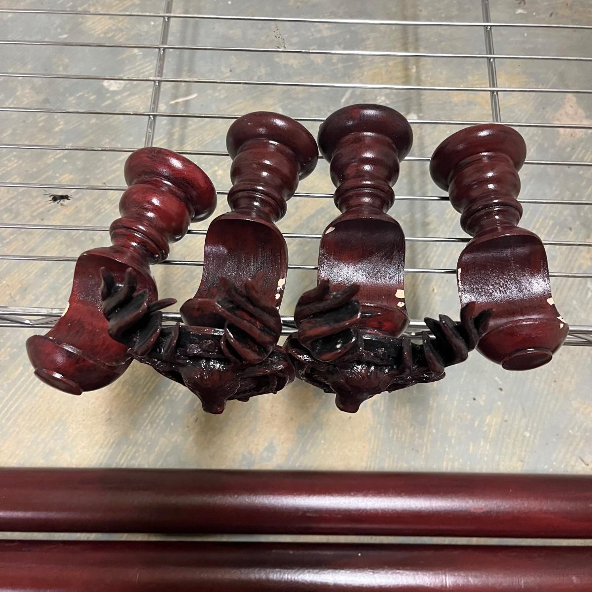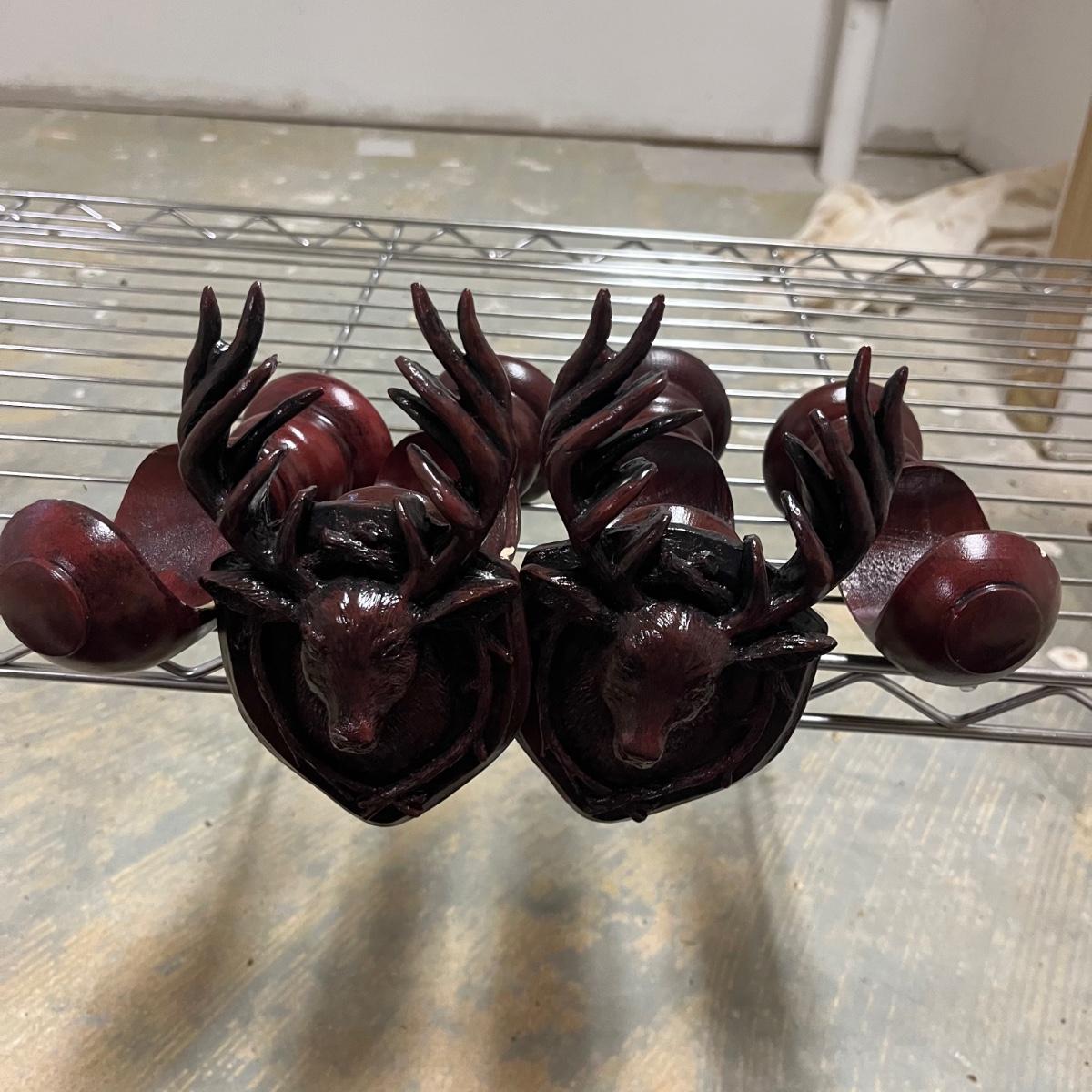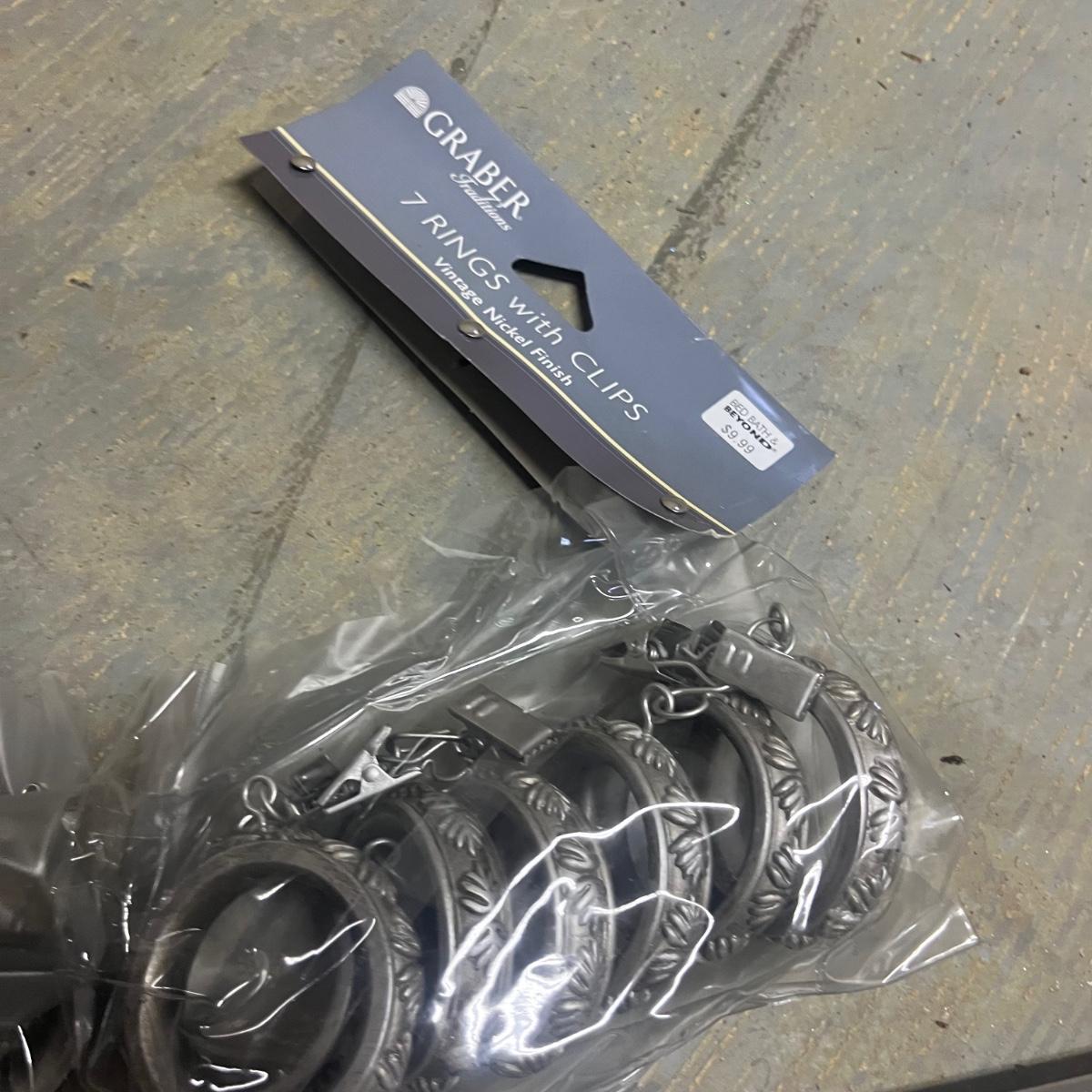 Lot includes three pairs of curtain rods with finials attached with the longest measuring 3.5”D x 45” including finial. Also includes a large selection of wooden rings and two sets of four mounting brackets. Most items appear to be wood with a few that are resin. Also includes a nickel colored finial, rings and a 88” long metal adjustable length rod.