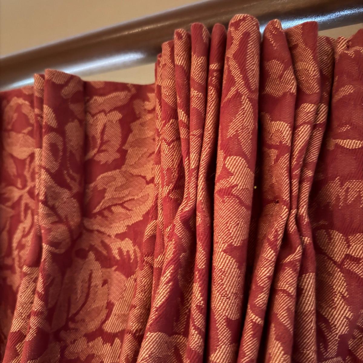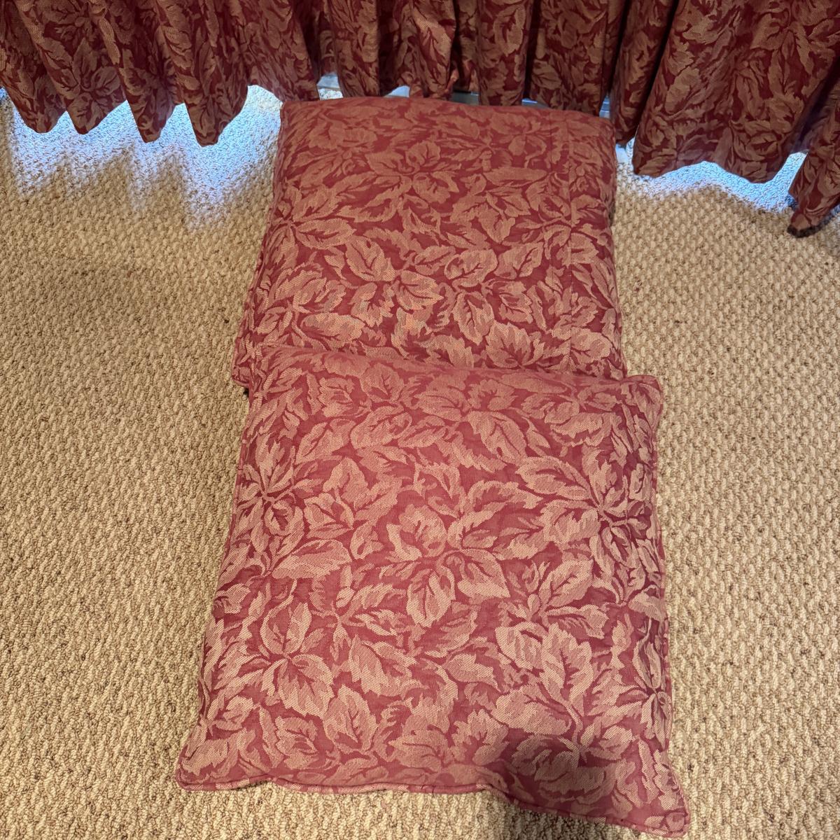 Lot includes two 18” x 18” pillows with a matching curtain that measures 76” x 84”H and measures 84” wide when pulled straight. Rod not included.