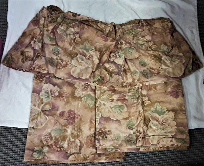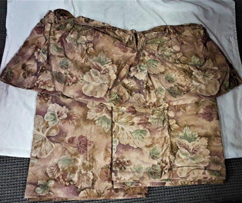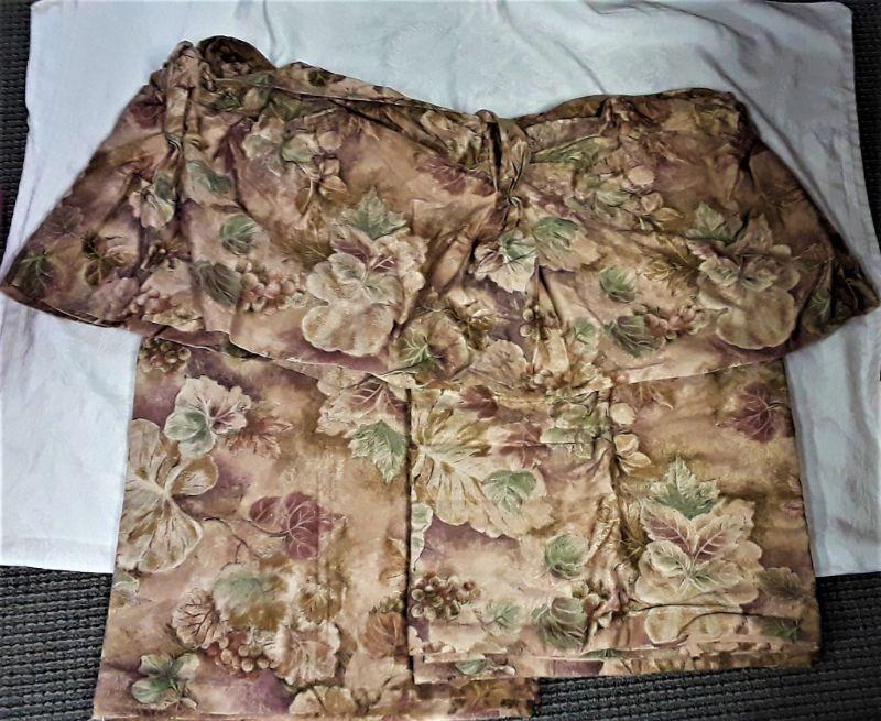 (2) Crosscrill Curtain Panels 48" x 84" Grape Leaf/Vine Pattern and Ruffled Valence 96" x 18" in Great Condition.