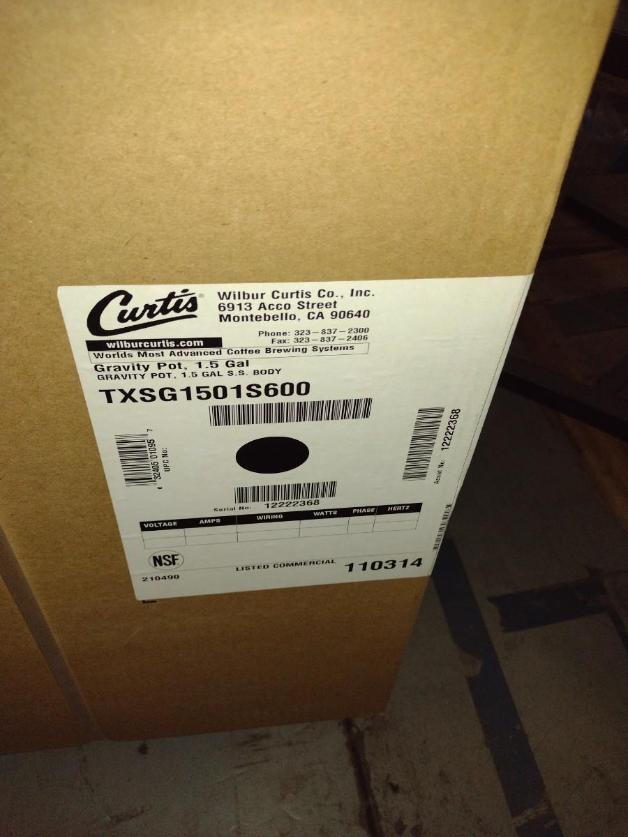 Pair of Curtis NSF Gravity Pots 1.5 Gallon New in Box Shipping option via freight or local mover is Buyer's responsibility and expense. Buyer must have all shipping scheduled within the stated dates and times of pickup. Recommended local movers are Beaty Bros. Moving 828-201-2982 and Carolina Pack n Go 828-489-9773