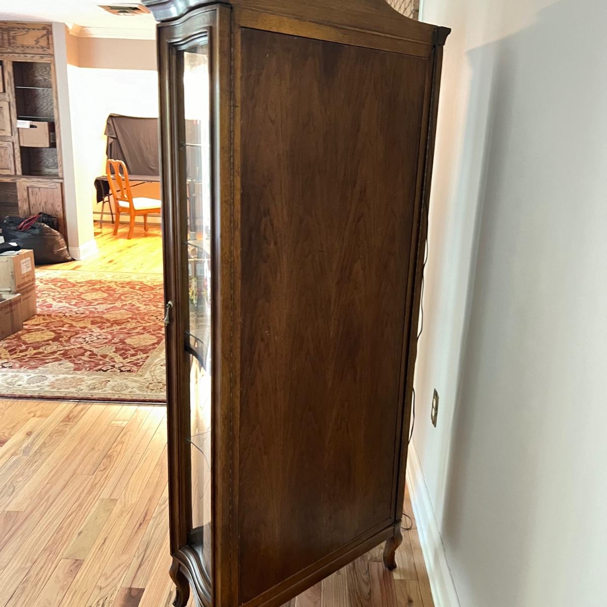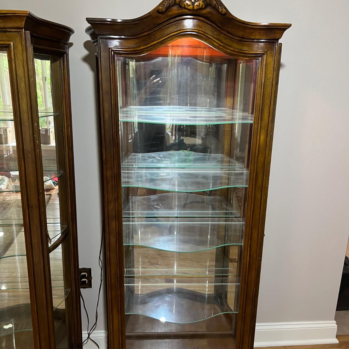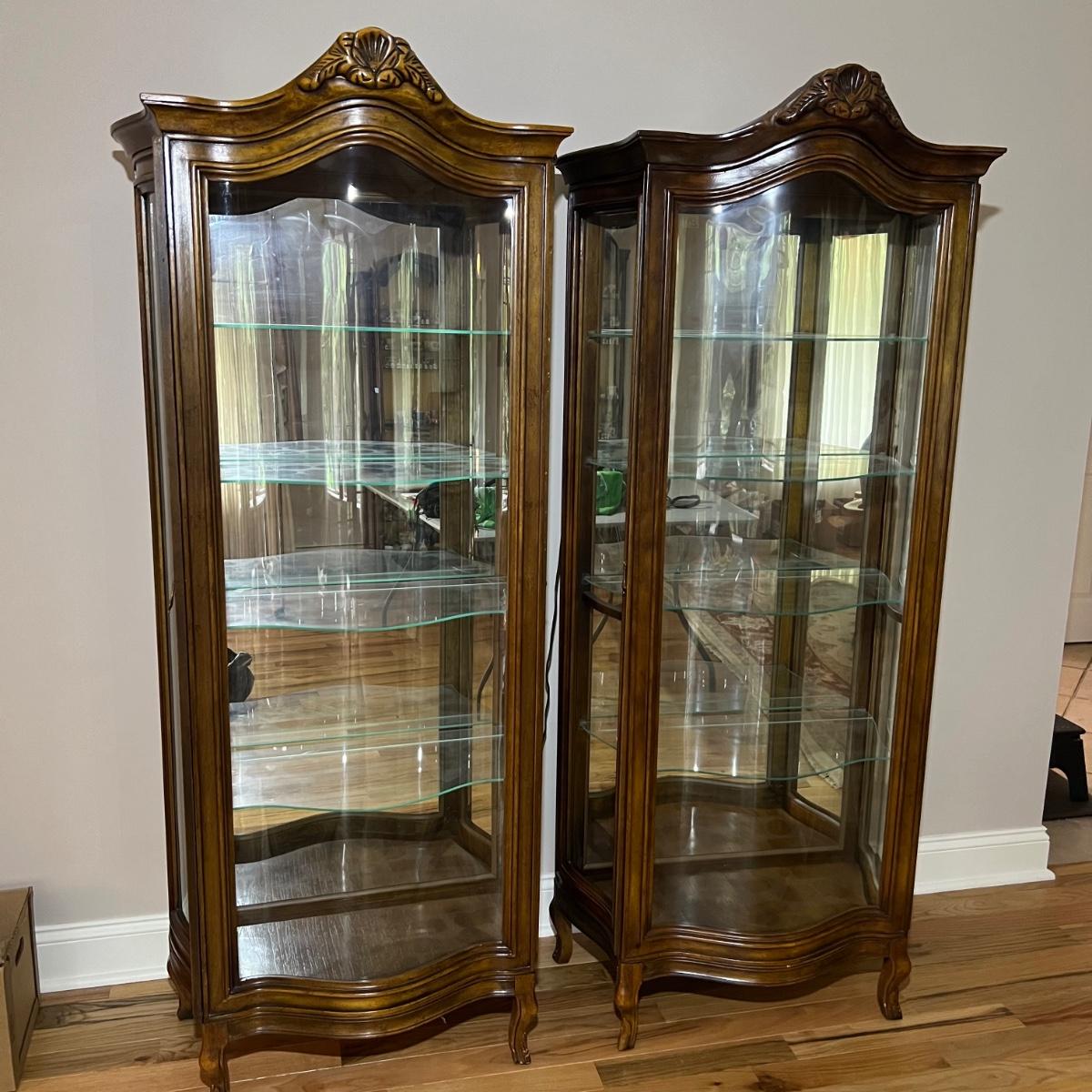 Pair of matching solid wood curio cabinets with curved glass. Four glass shelves in each unit that have plate rails and are removable for transportation. The front legs have some nicks. Both have working single lights. No makers marks were found.