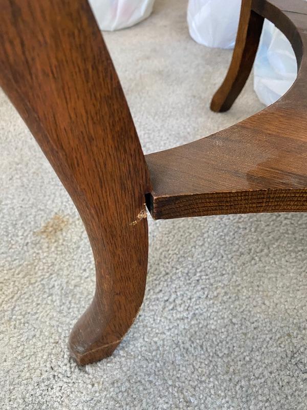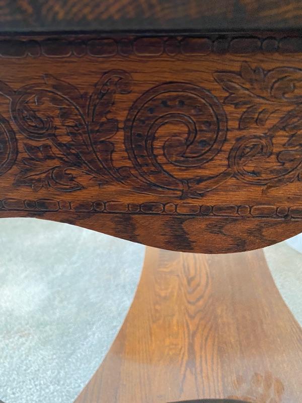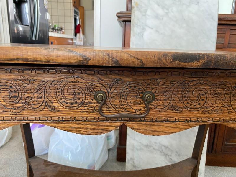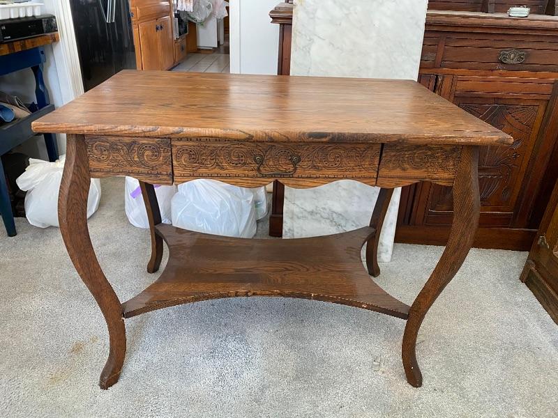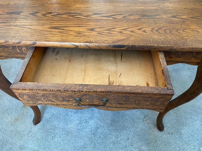 Beautiful curved leg wood table. Great as a small writing desk or entryway table. Has a single drawer on one side. Has a filigree design carved all the way around the top. Lower shelf needs some tightening on one side. Good Condition. Measures 36x24x39.
