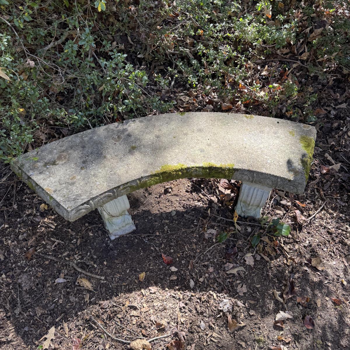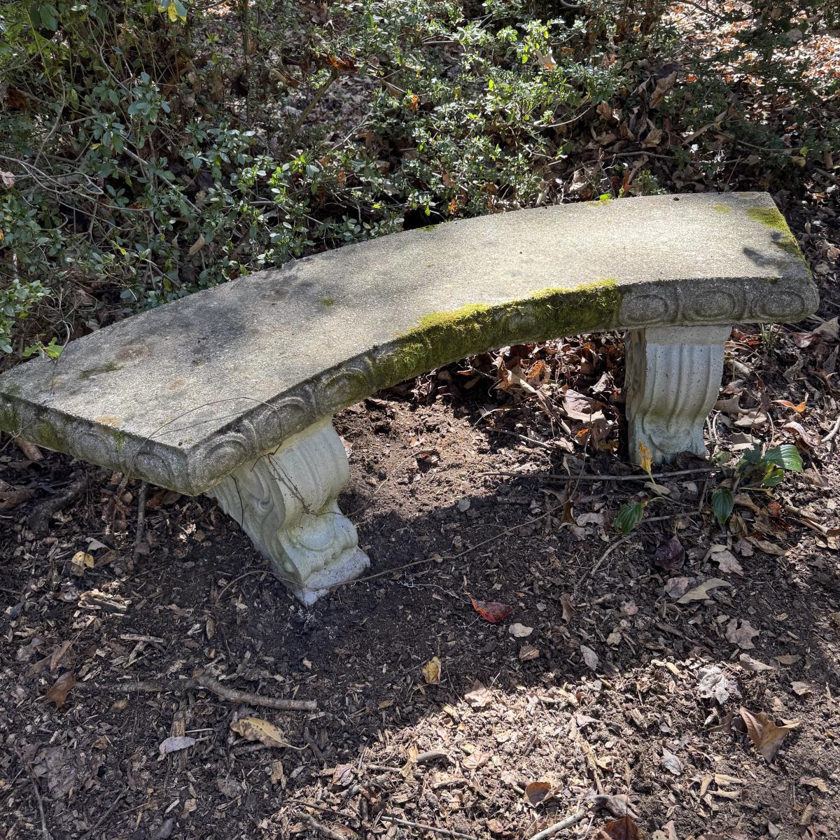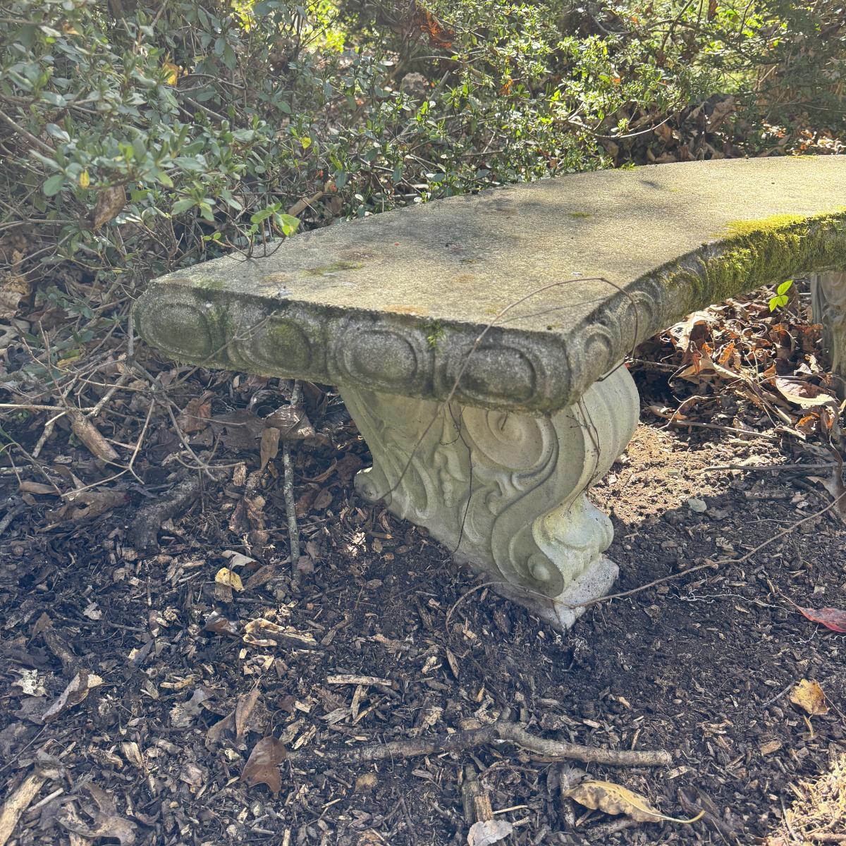 Concrete bench for patio. Has the perfect amount of moss and weathering. Very heavy. Top comes off to transport. Measures 52” x 16” x 16” high