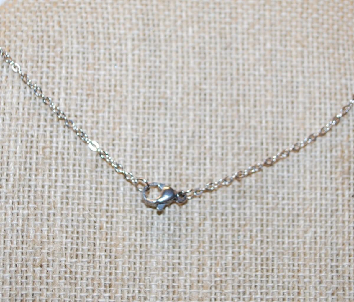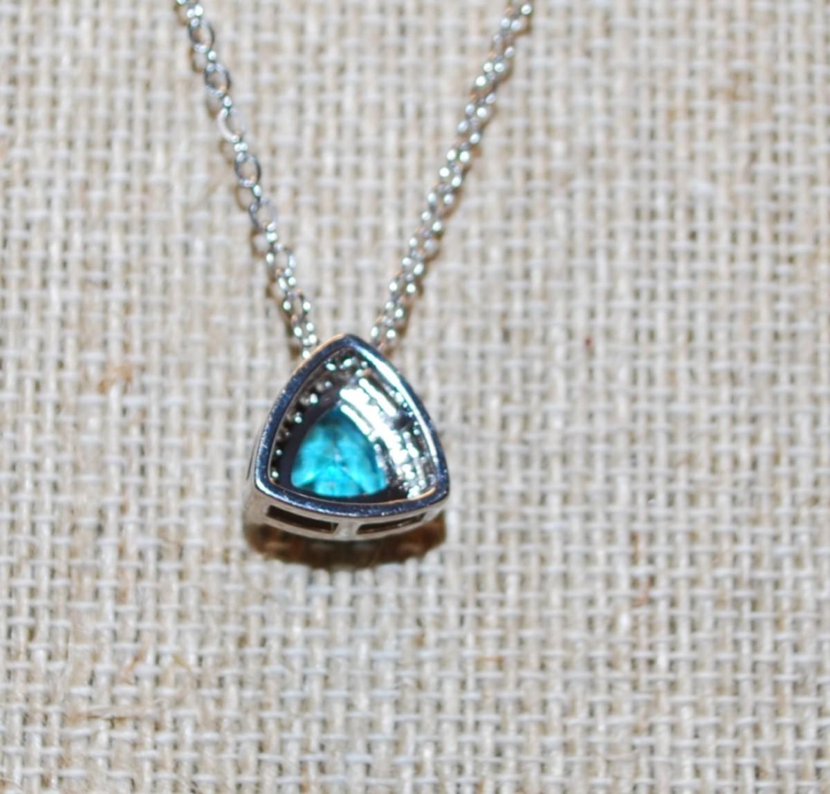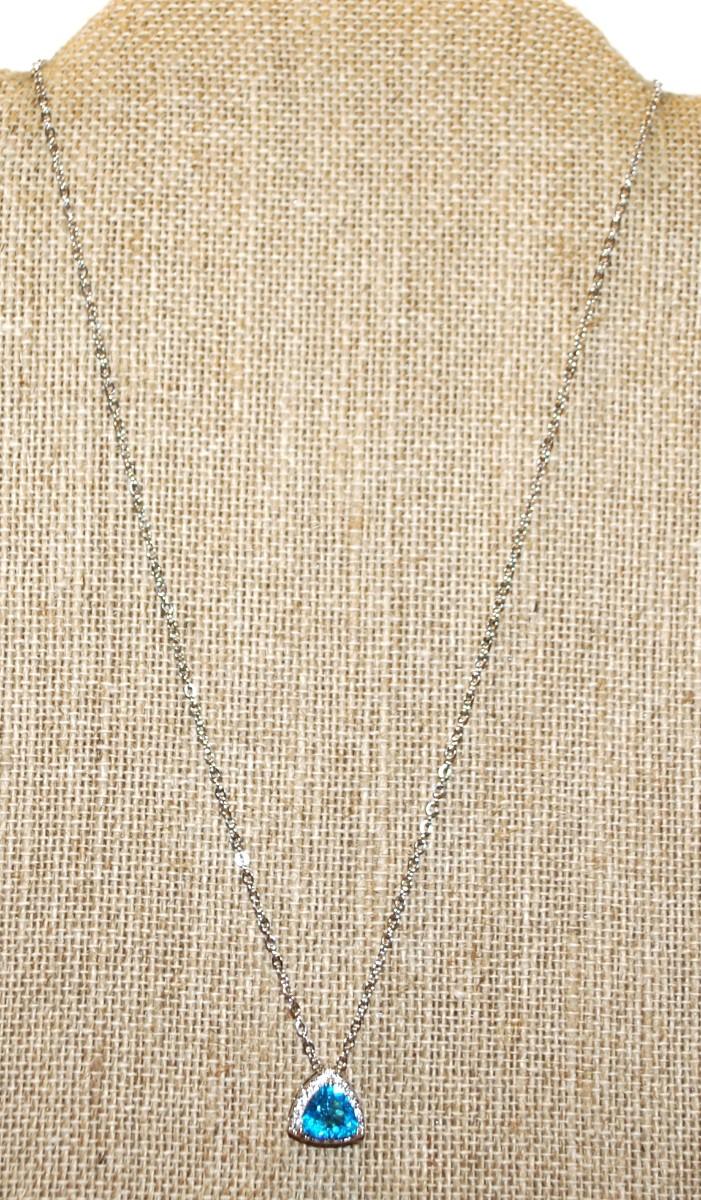Curved Trillion Cut Blue Stone PENDANT (½" x ½") with Surrounds on a Silver Tone Necklace Chain 17" L