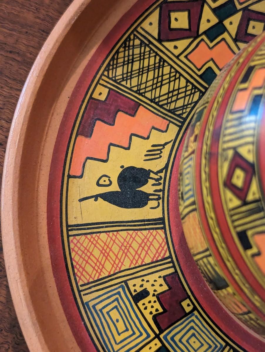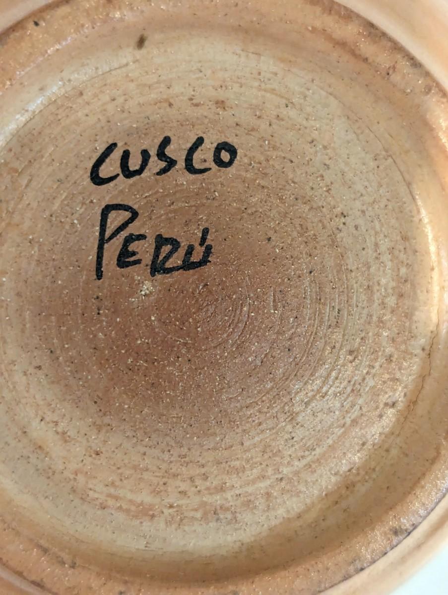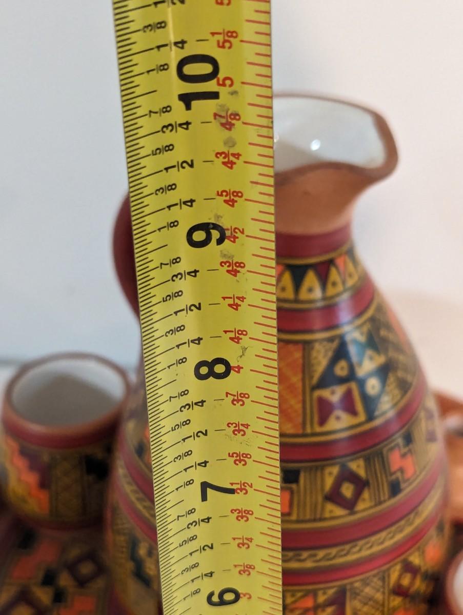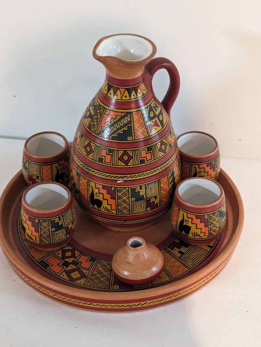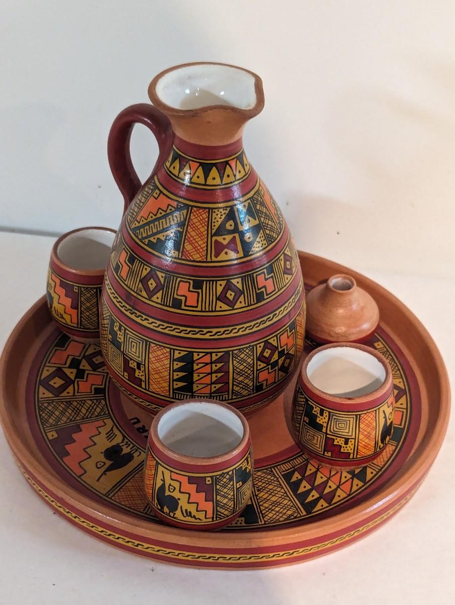 Cusco Peru Hand Painted Glazed Clay/Ceramic Pitcher Cups & Tray