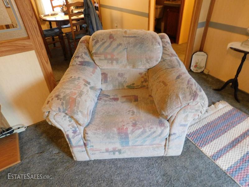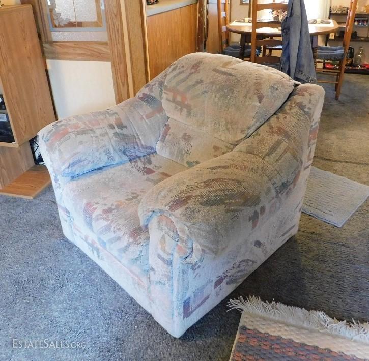 Cushioned Chair needs cleaning. Well used but still good colors. Note: House has been shut up for several months and some smoking in house.