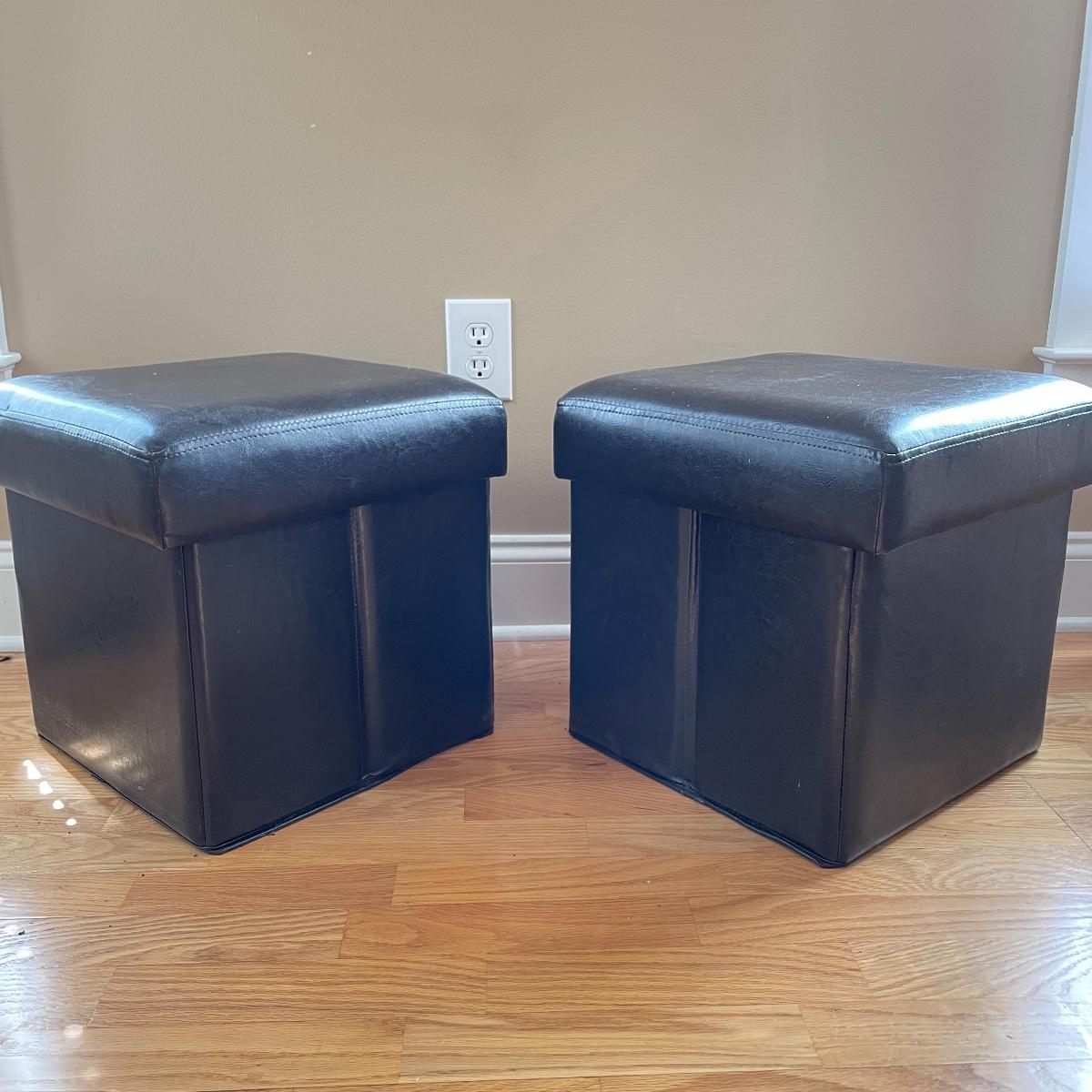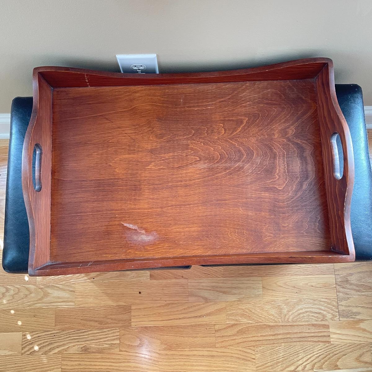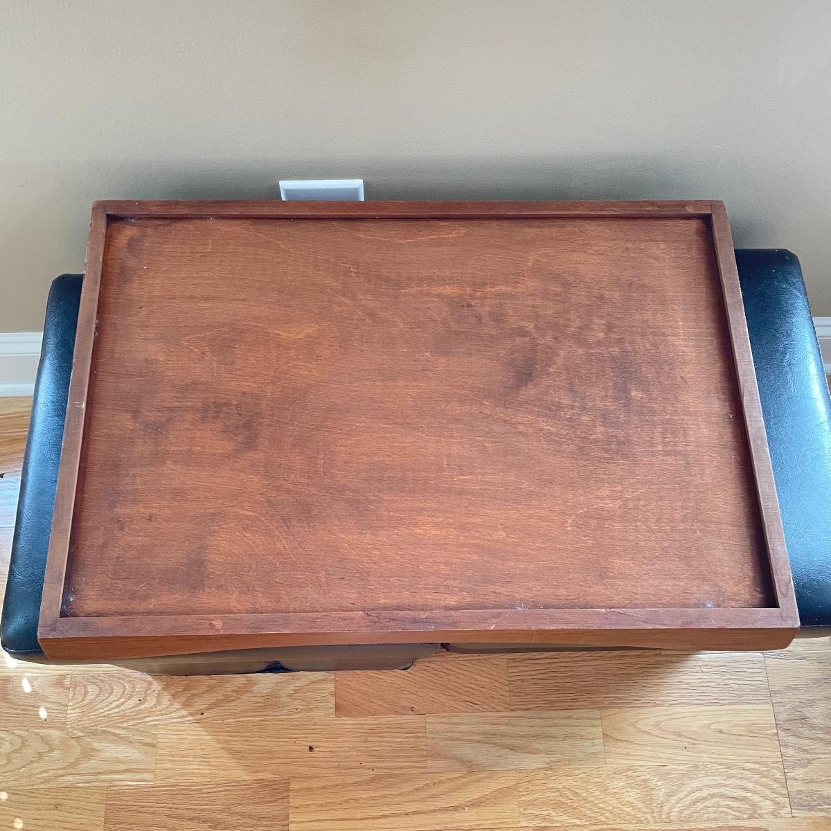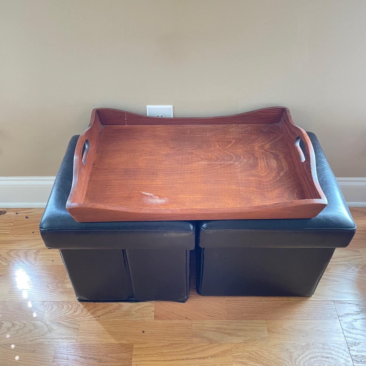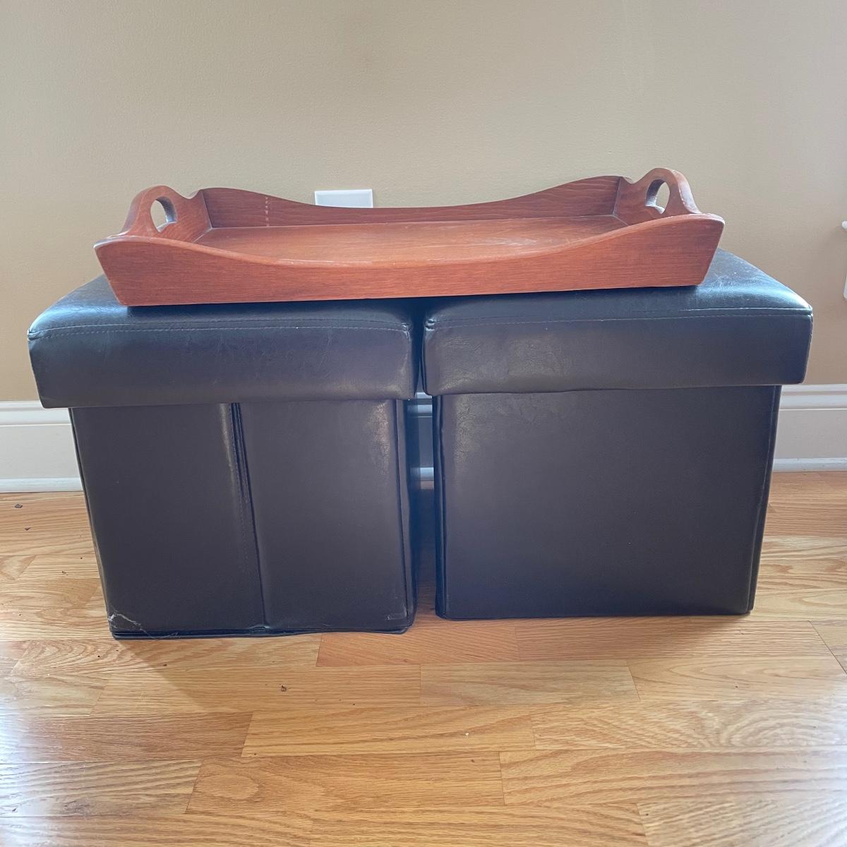 Two matching leather-like cushioned storage boxes/ottomans. Each has a canvas-style material lining and measures 15”sq x 15”. Lot also includes a nice wooden tray measuring 23.5” x 15” x 3.5”. Local pick up only.