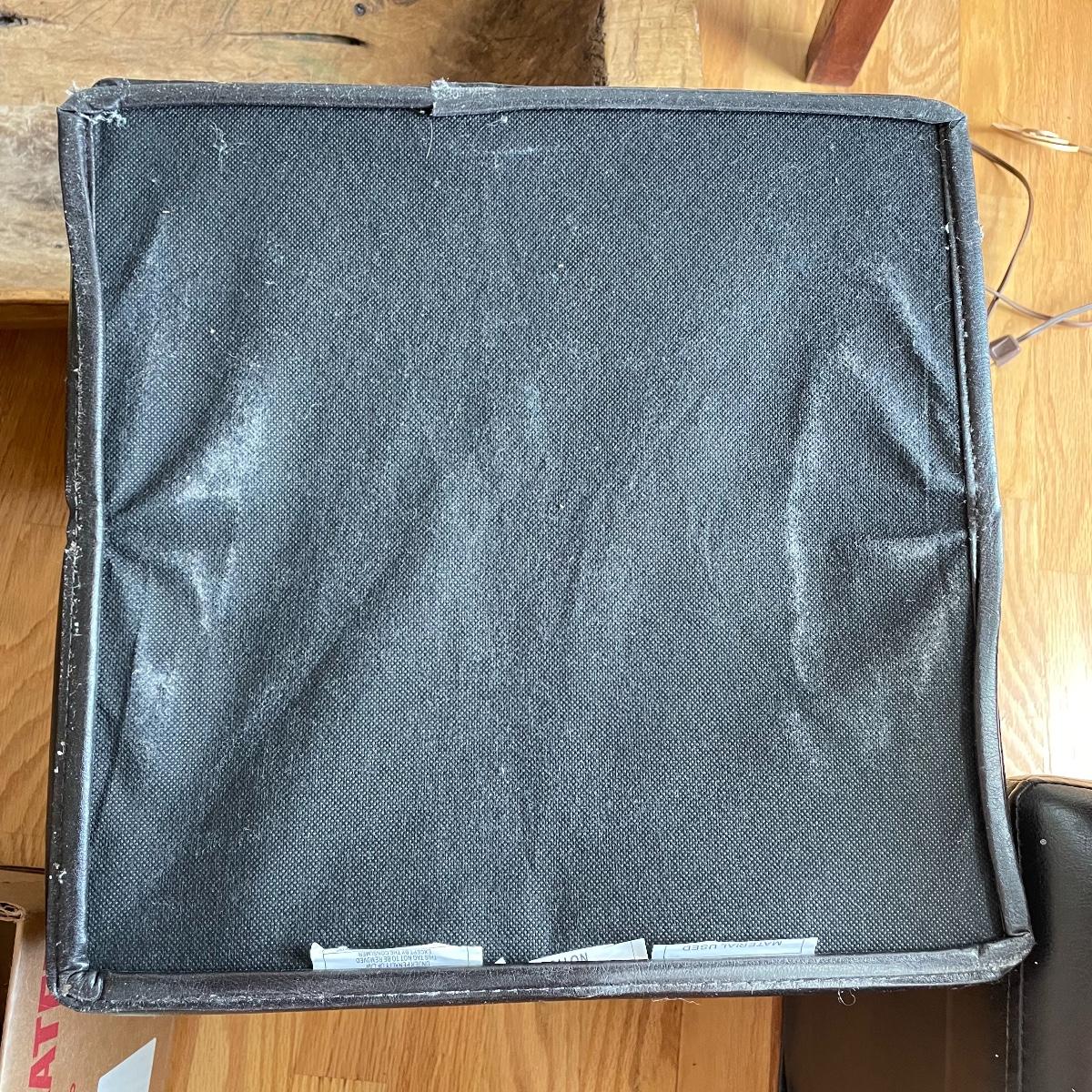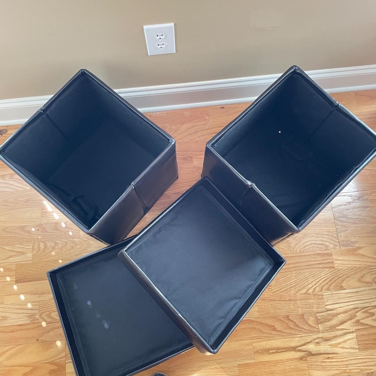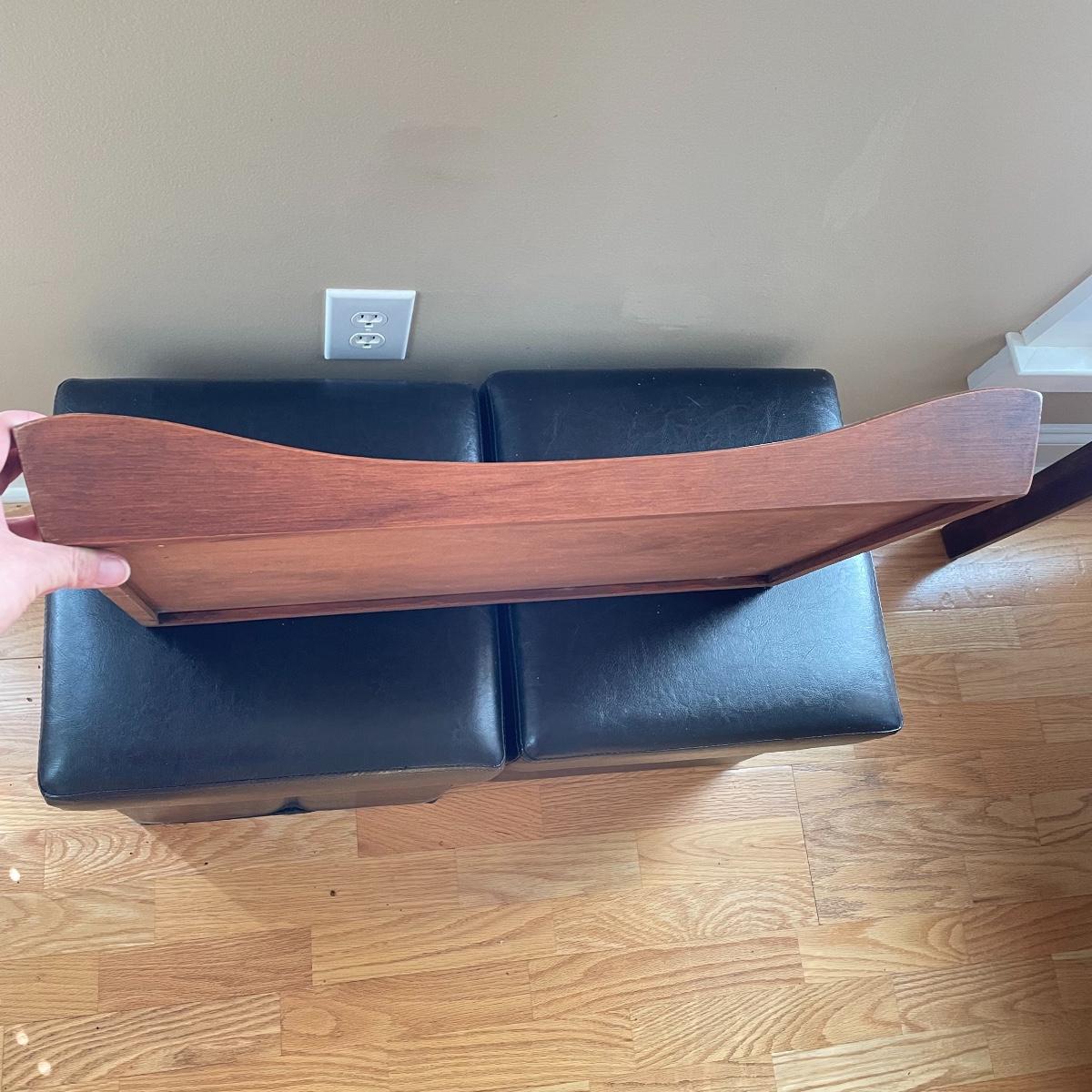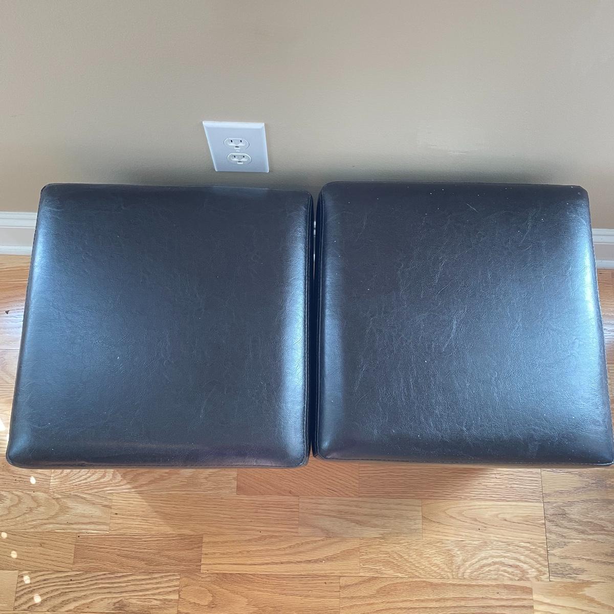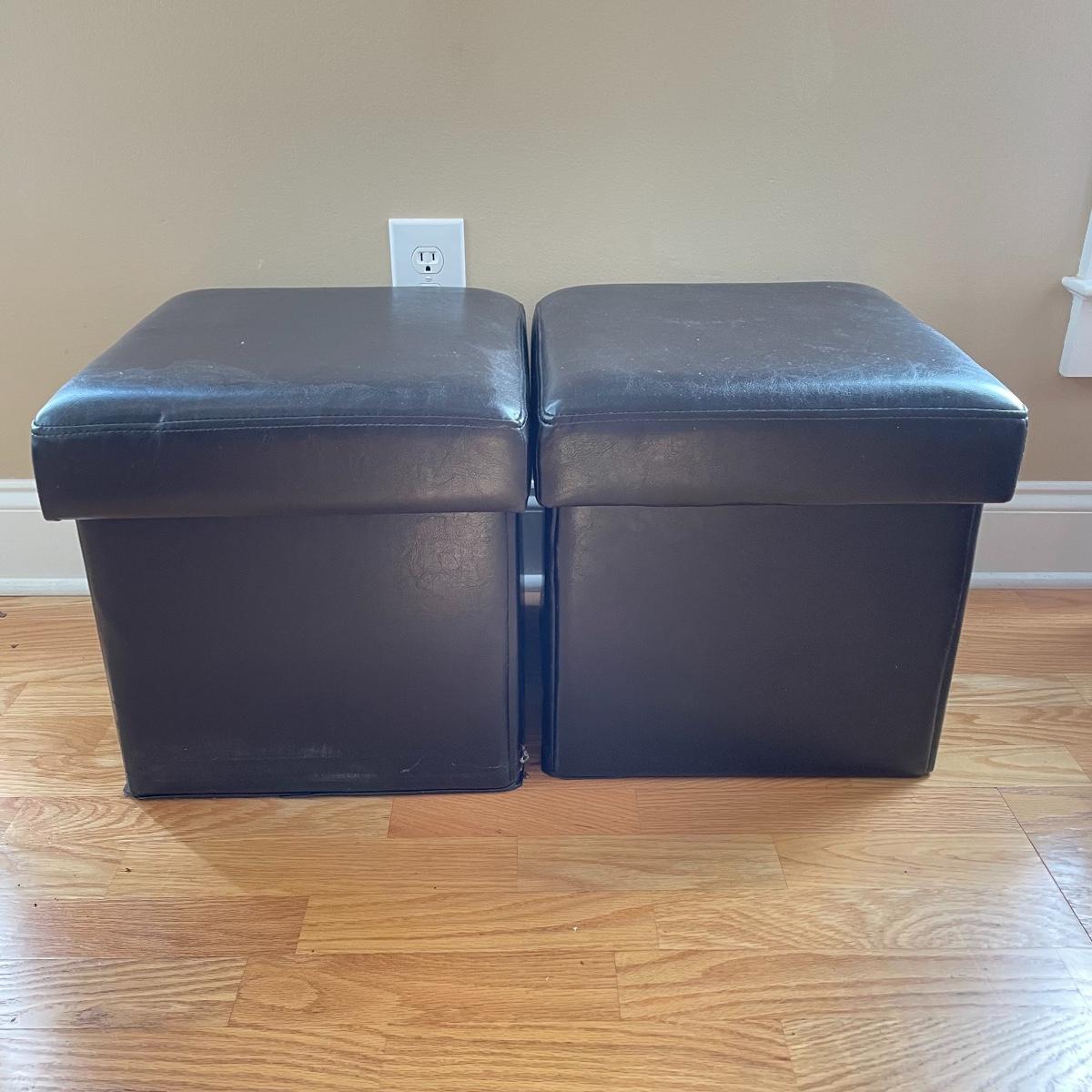 Two matching leather-like cushioned storage boxes/ottomans. Each has a canvas-style material lining and measures 15”sq x 15”. Lot also includes a nice wooden tray measuring 23.5” x 15” x 3.5”. Local pick up only.