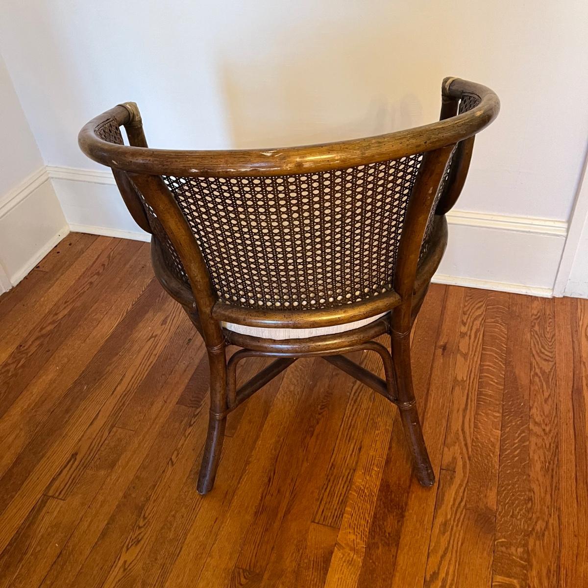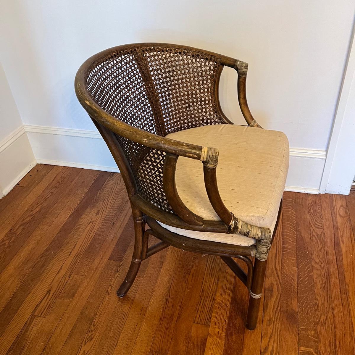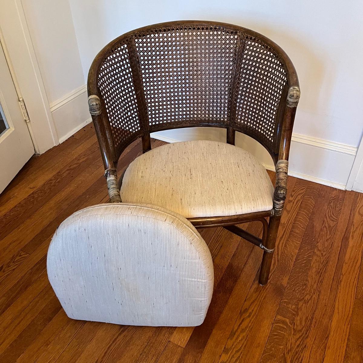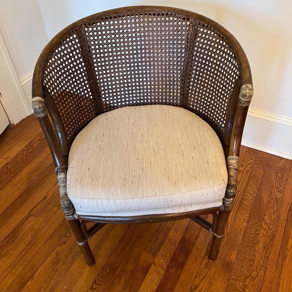 Rattan and wood barrel back armchair has a cream colored removable upholstered seat pad. The chair measures 25” x 24” x 32”H with a seat height of 19”. There are various signs of wear on the wood, rattan and cushion. See pictures. Local pickup only.
