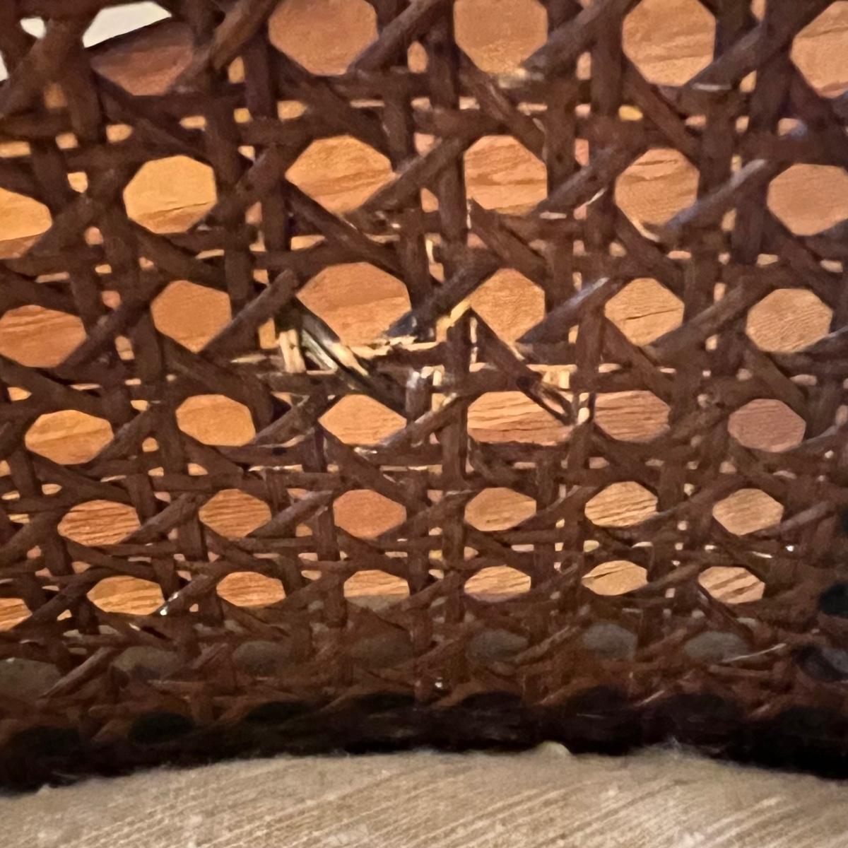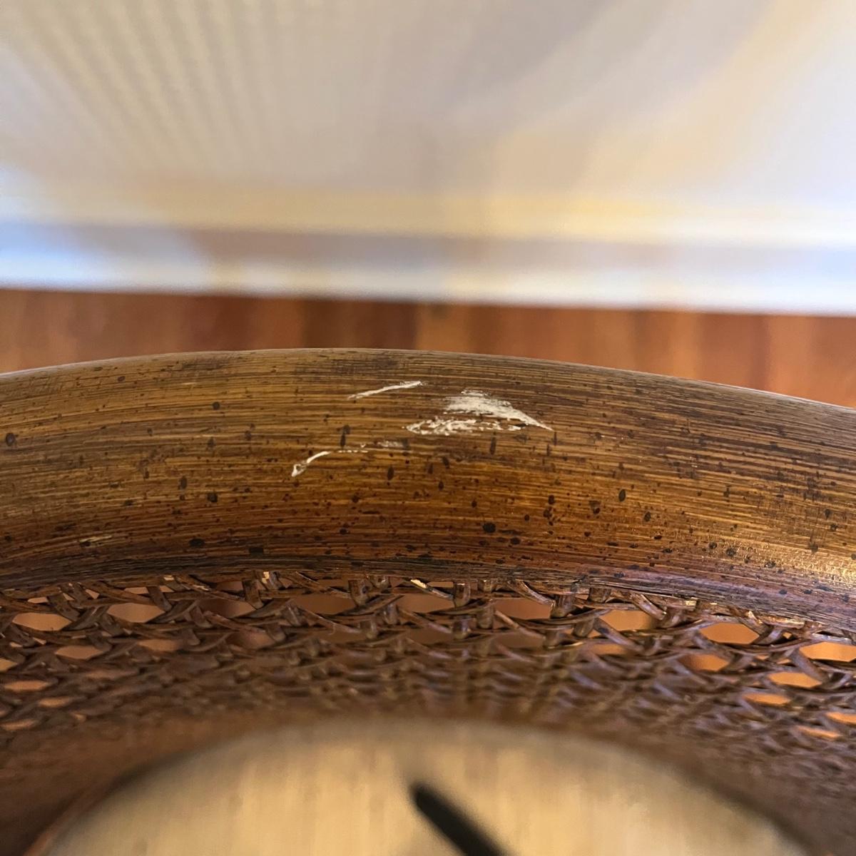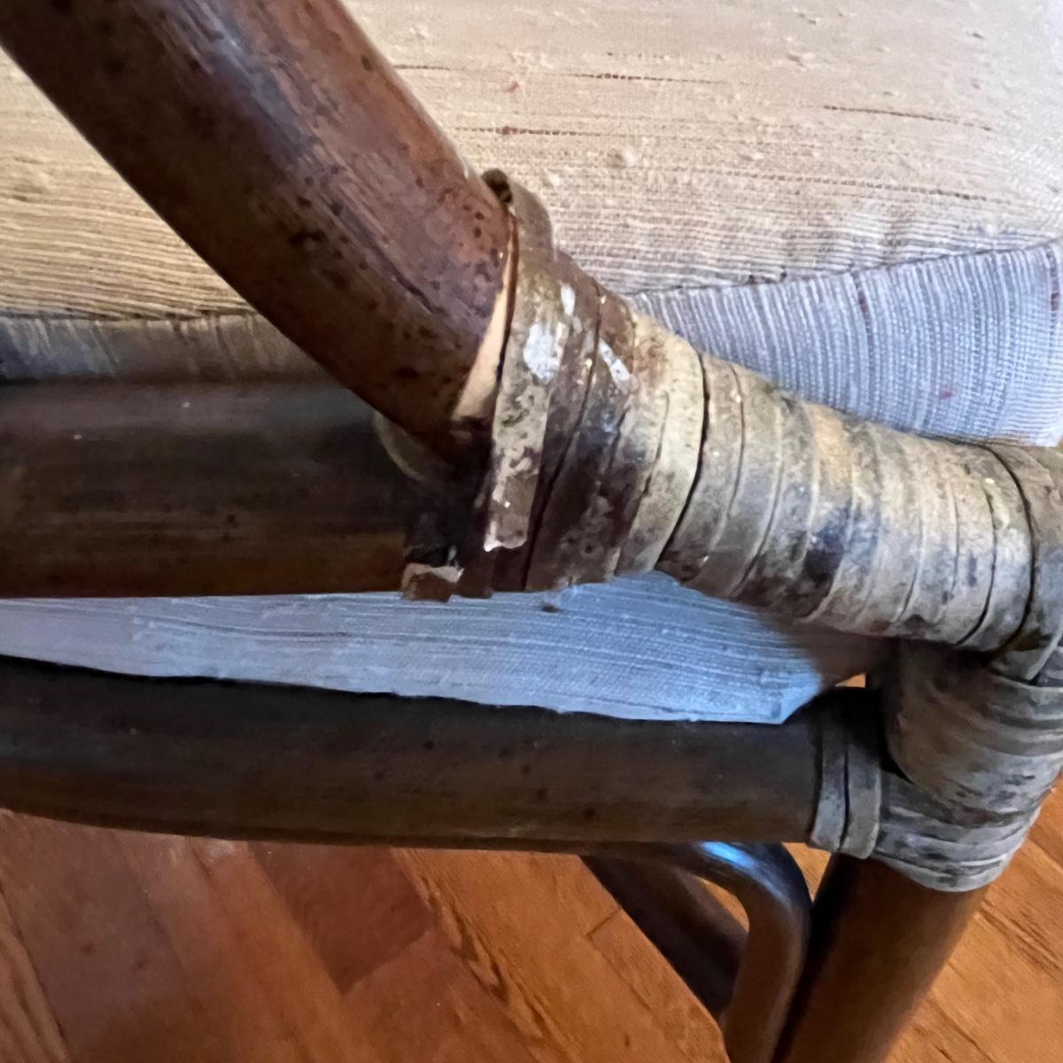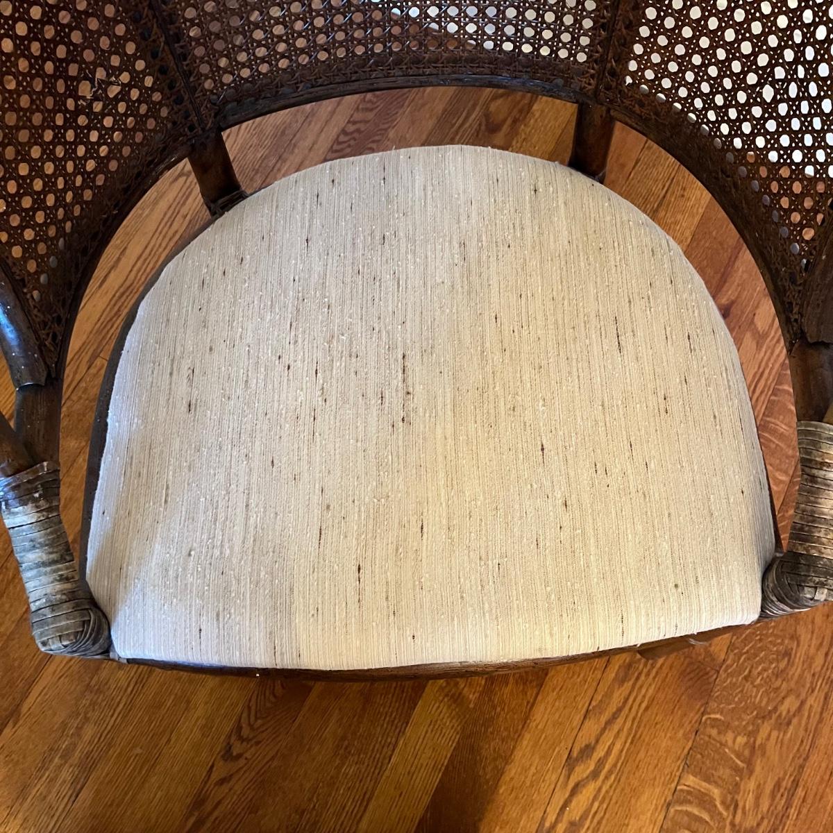 Rattan and wood barrel back armchair has a cream colored removable upholstered seat pad. The chair measures 25” x 24” x 32”H with a seat height of 19”. There are various signs of wear on the wood, rattan and cushion. See pictures. Local pickup only.