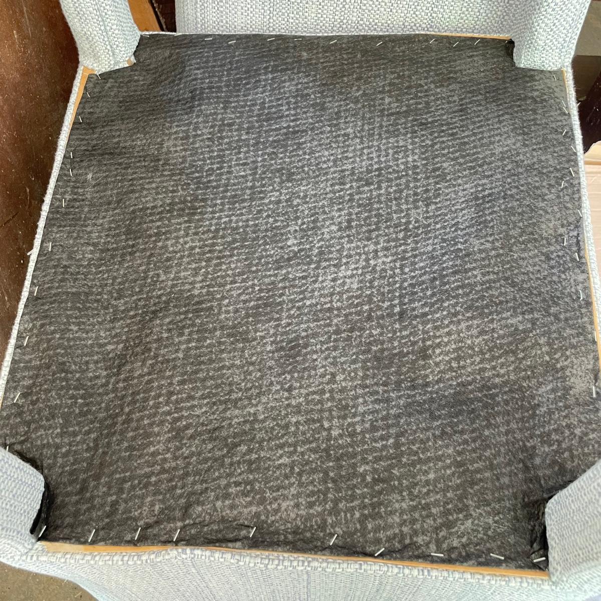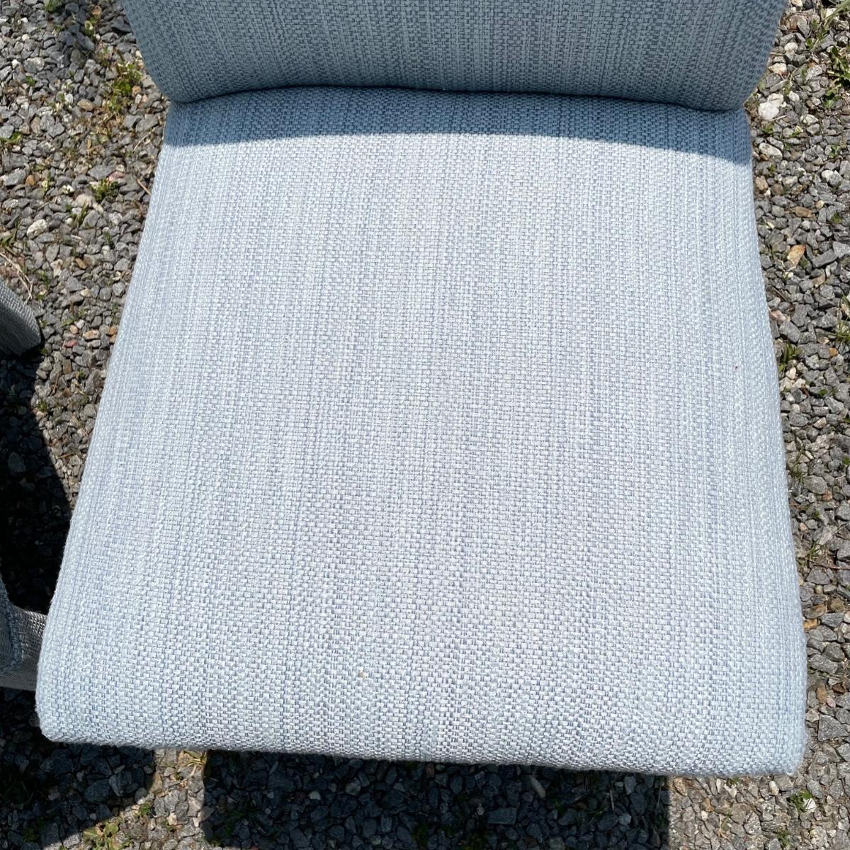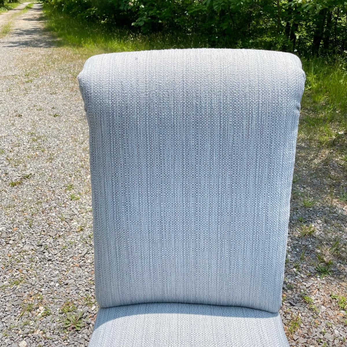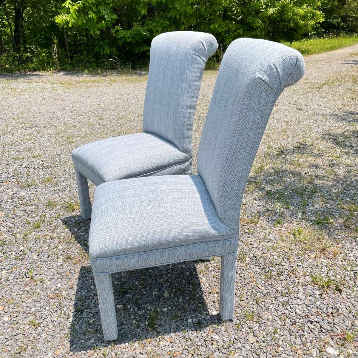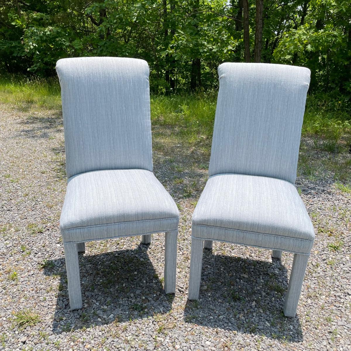 Two fully upholstered sitting room chairs with a pale blue fabric. Both chairs have cushioned seats and backs. Chairs measure 20” x 23” x 42” with a seat height around 19”. See images. Local pick up only.