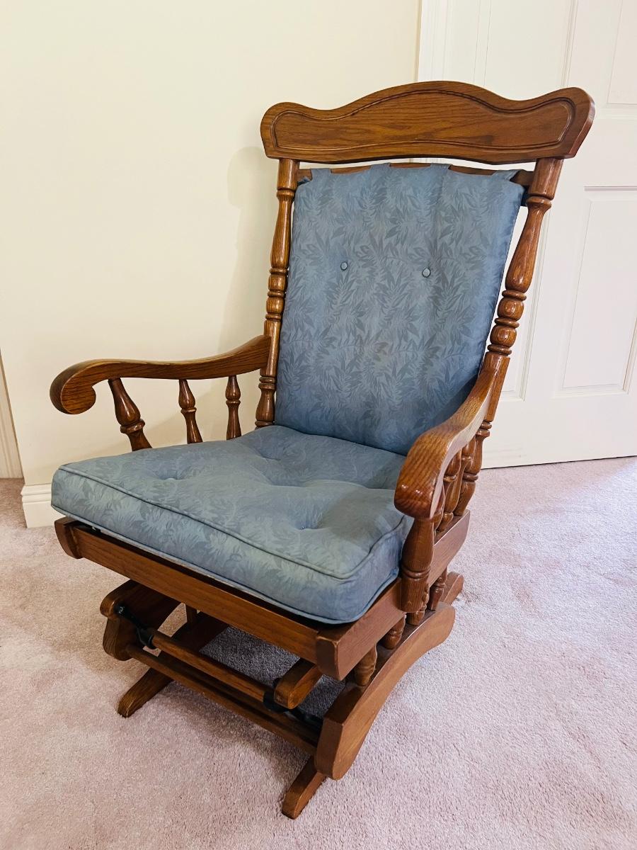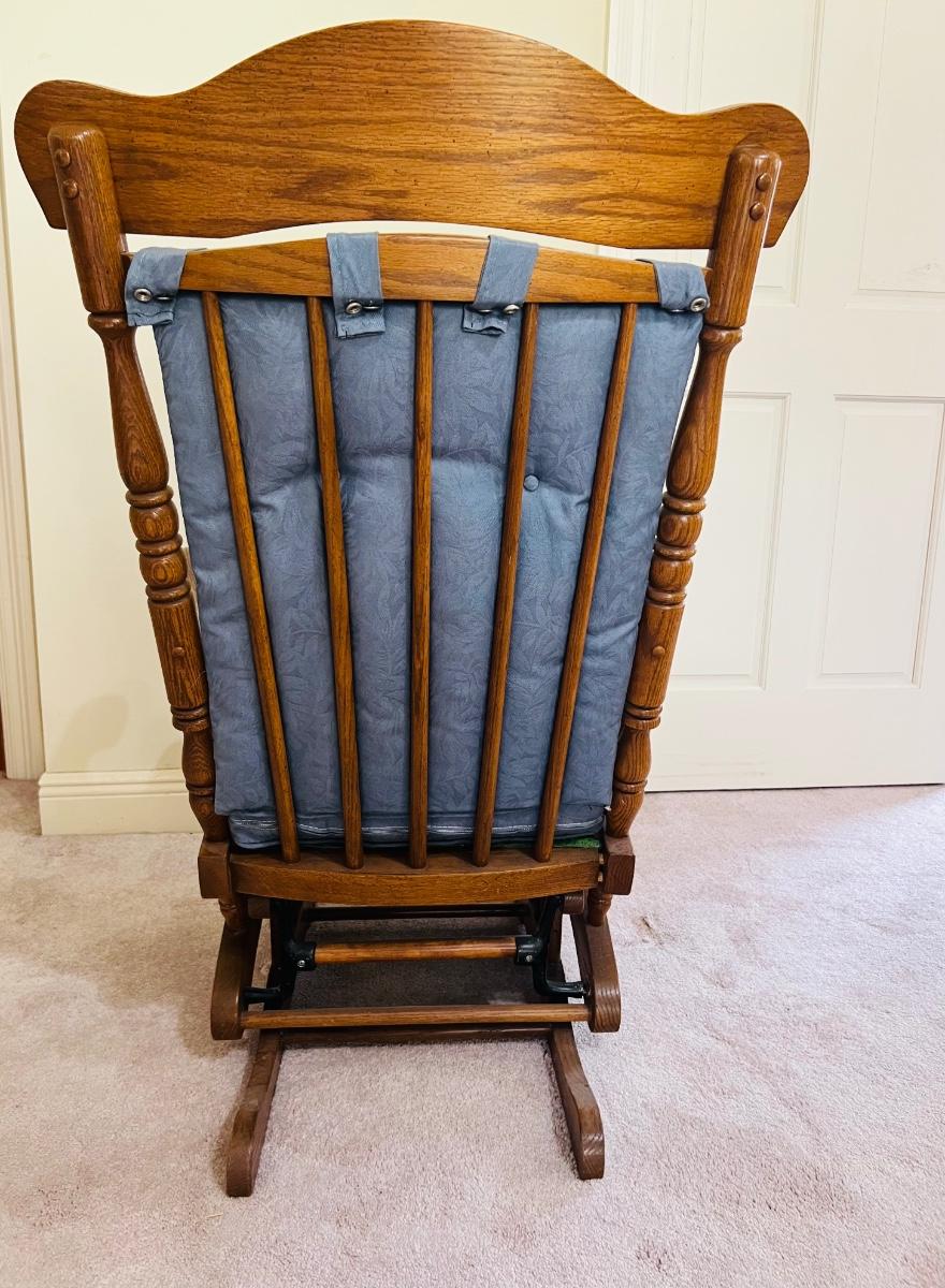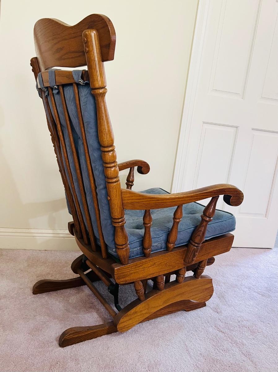 Comfortable! Cushions are removable for washing. Measures 42 inches tall, 27 inches deep and 27 inches wide. Floor two seat measures at 17 1/2 inches .Bottom of rocker that you sit on is a spring base for added comfort.