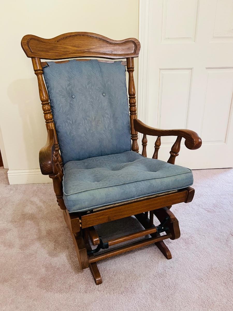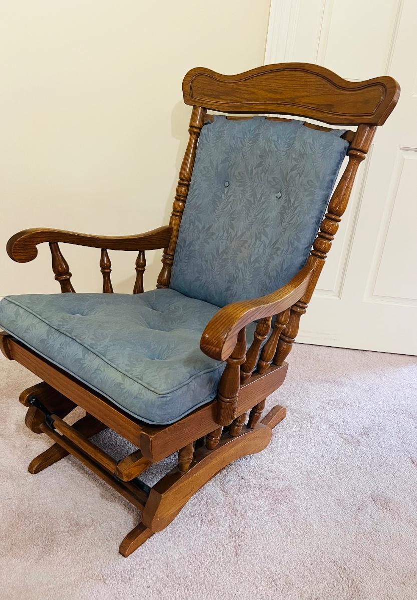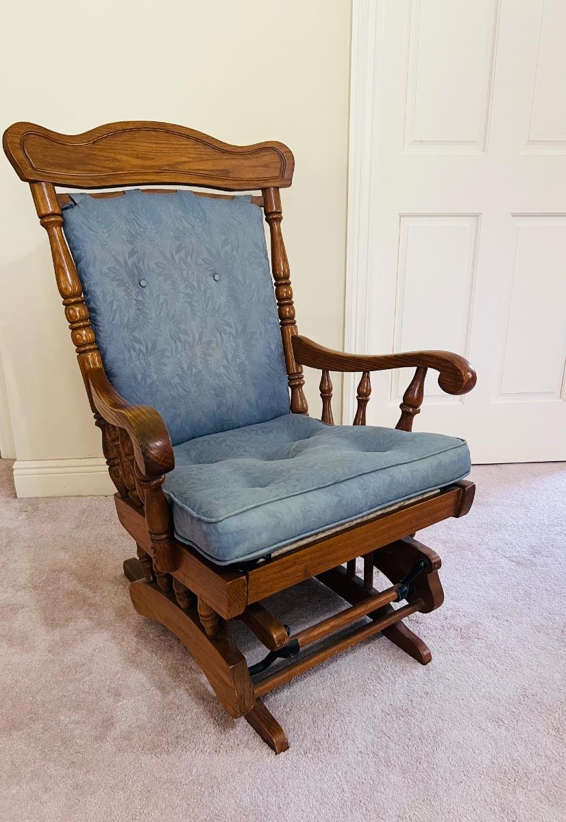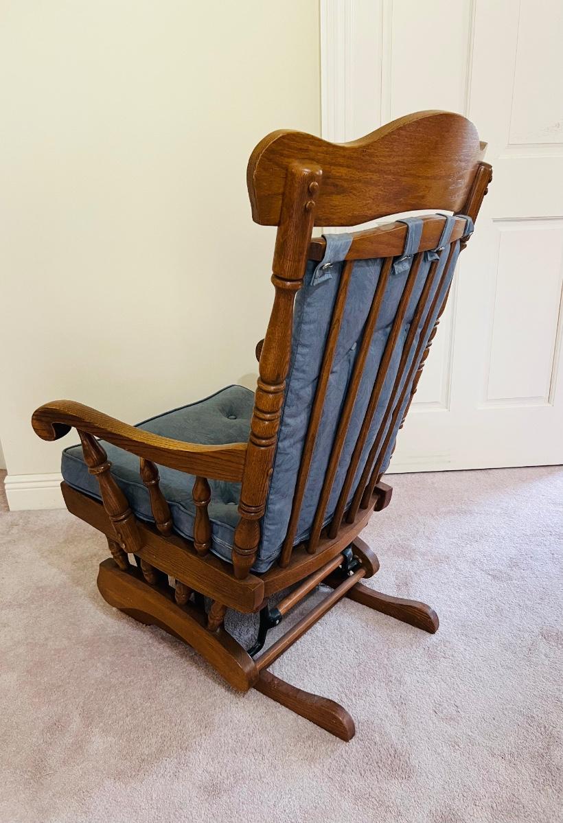 Comfortable! Cushions are removable for washing. Measures 42 inches tall, 27 inches deep and 27 inches wide. Floor two seat measures at 17 1/2 inches .Bottom of rocker that you sit on is a spring base for added comfort.