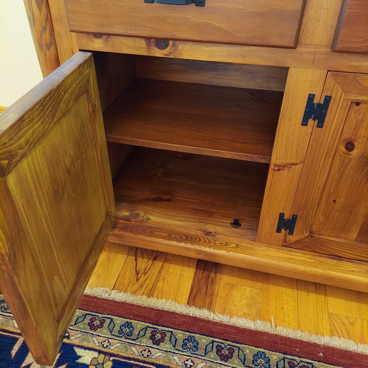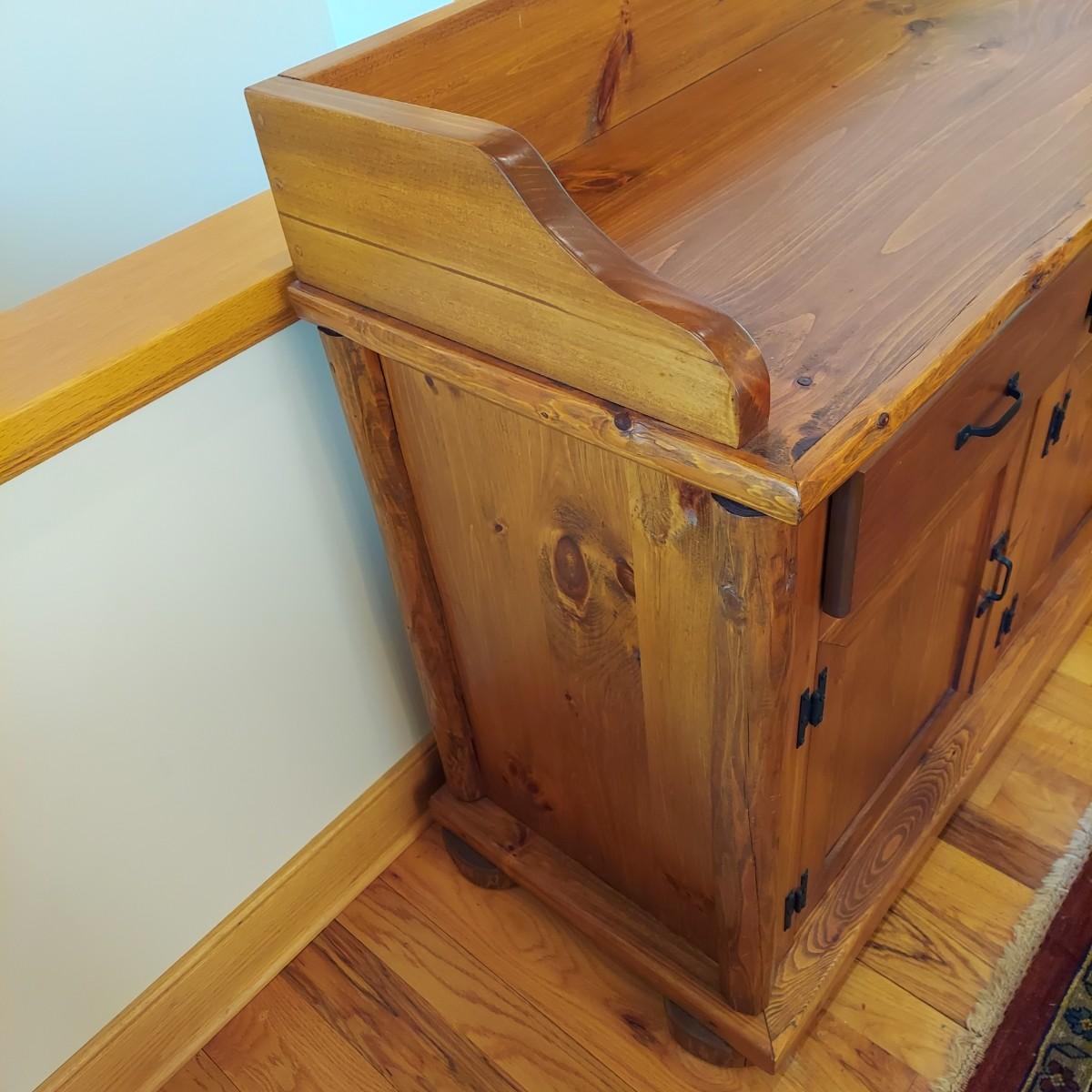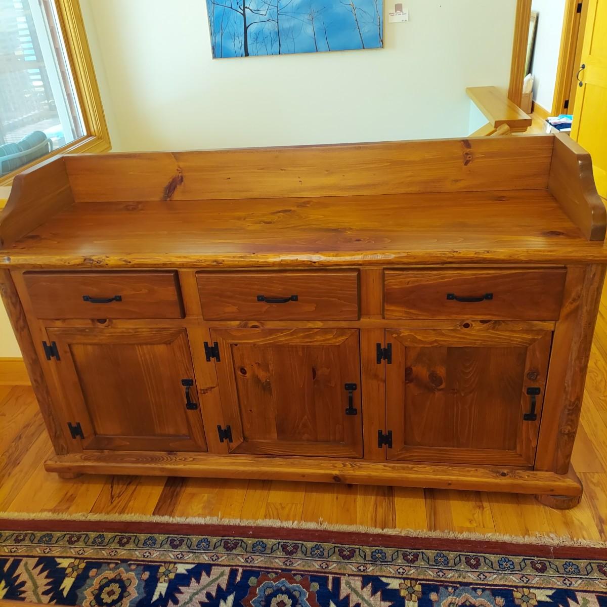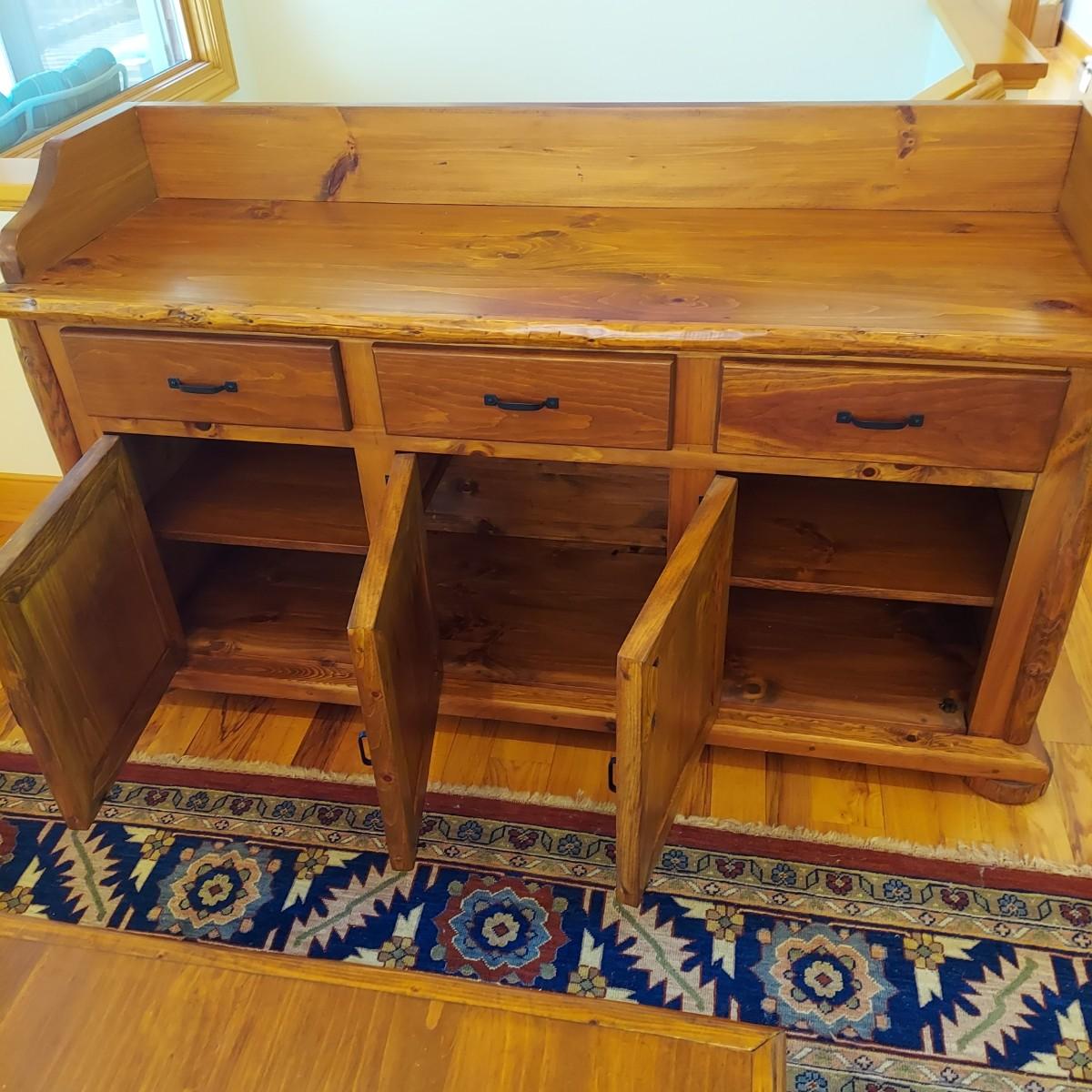 Beautiful custom built solid wood log cabin style buffet. Seller states it was handmade by Lang Hornthal. Has three drawers and three cabinet doors. Piece measures approximately 72” x 23” x 43"H. Please see photos for details. Matches other furniture pieces available in auction. Local Pickup Only. Winning bidder must bring assistance to help move and load this item due to its weight and/or size.