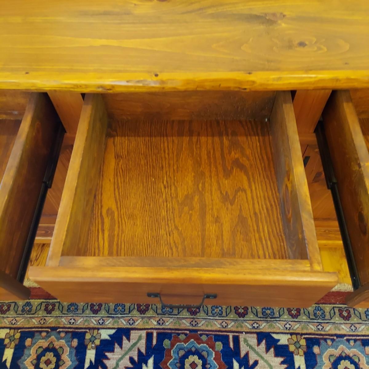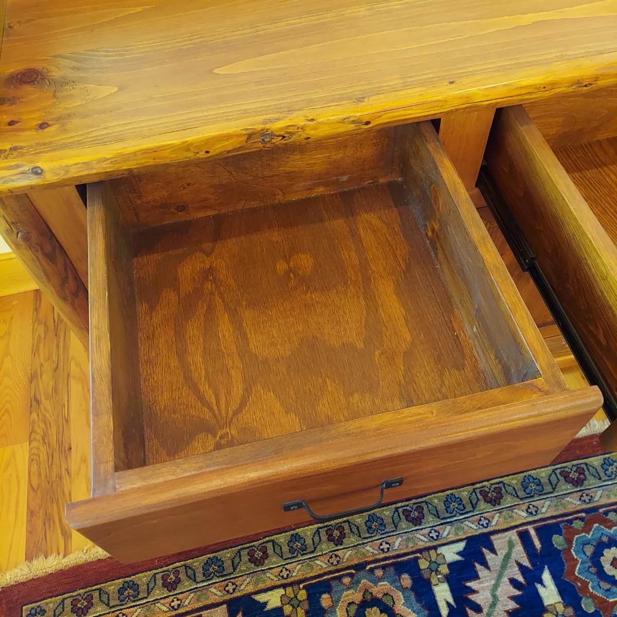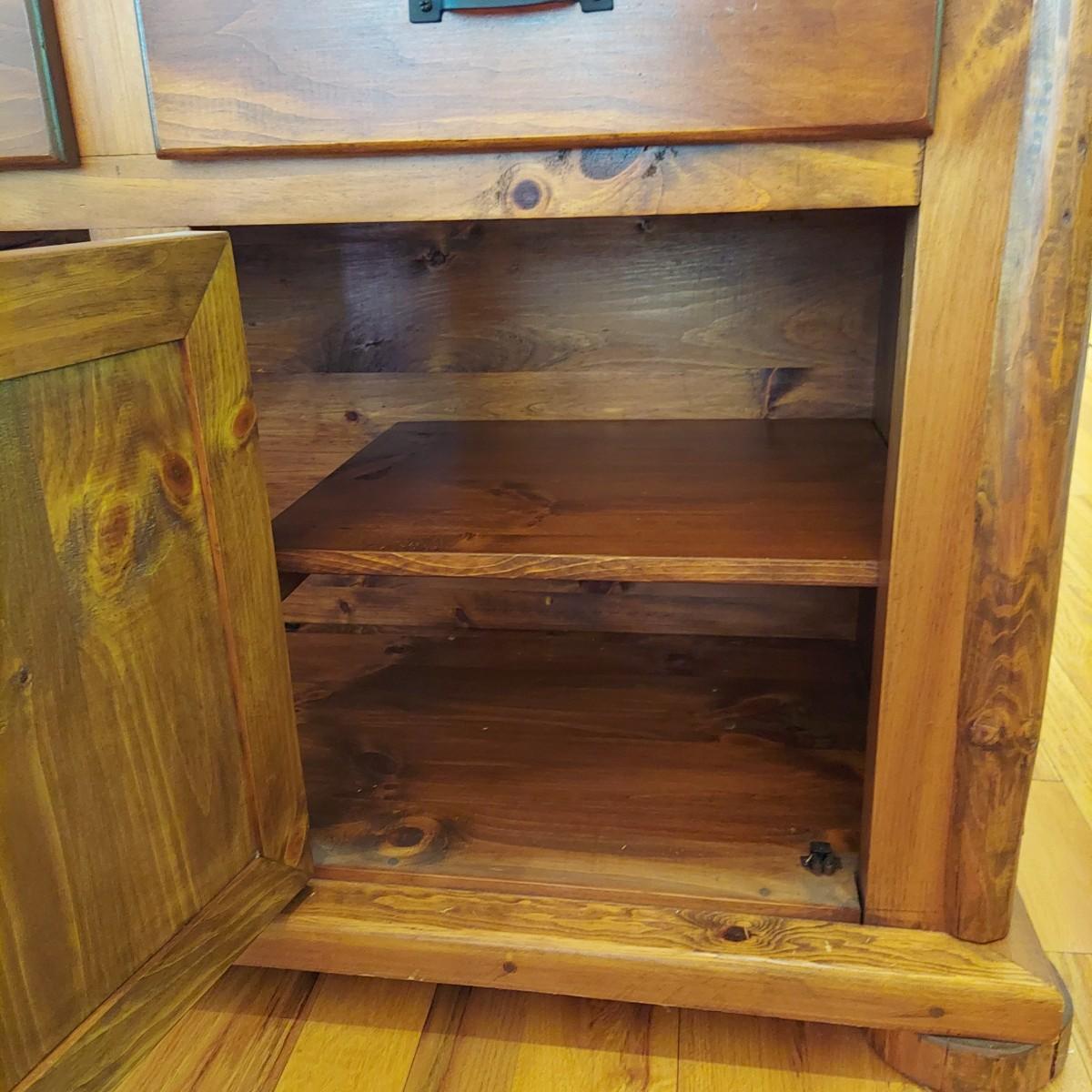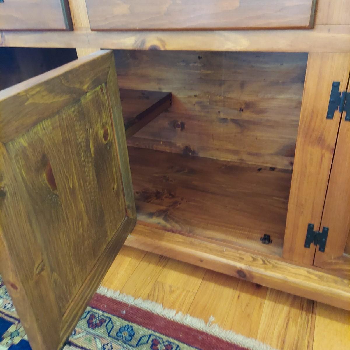 Beautiful custom built solid wood log cabin style buffet. Seller states it was handmade by Lang Hornthal. Has three drawers and three cabinet doors. Piece measures approximately 72” x 23” x 43"H. Please see photos for details. Matches other furniture pieces available in auction. Local Pickup Only. Winning bidder must bring assistance to help move and load this item due to its weight and/or size.