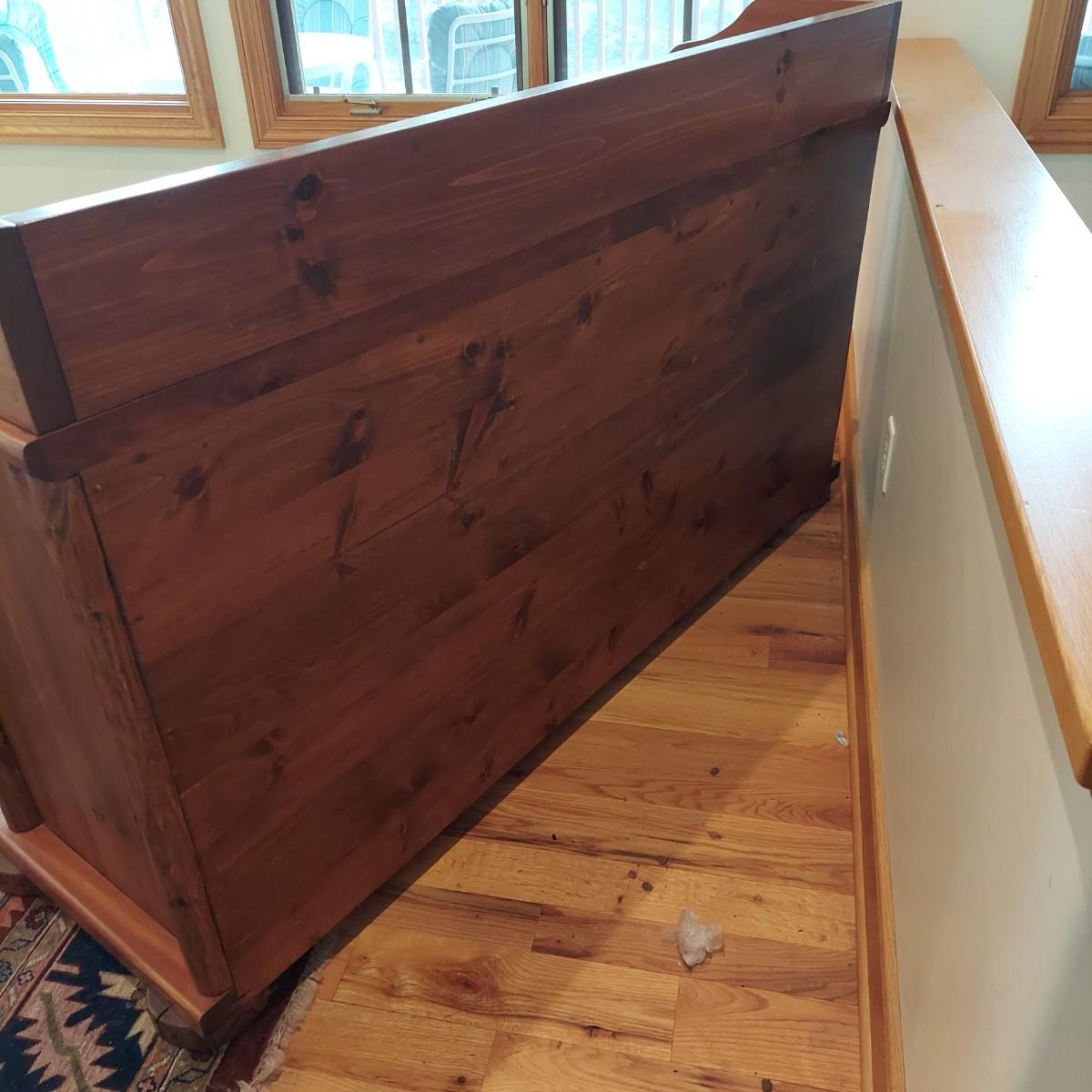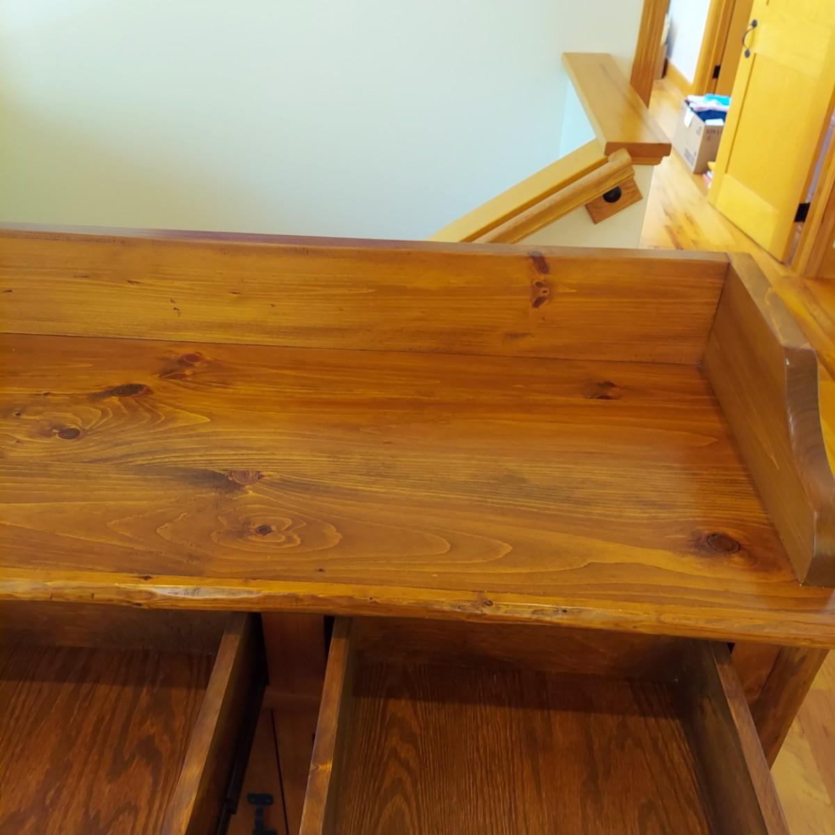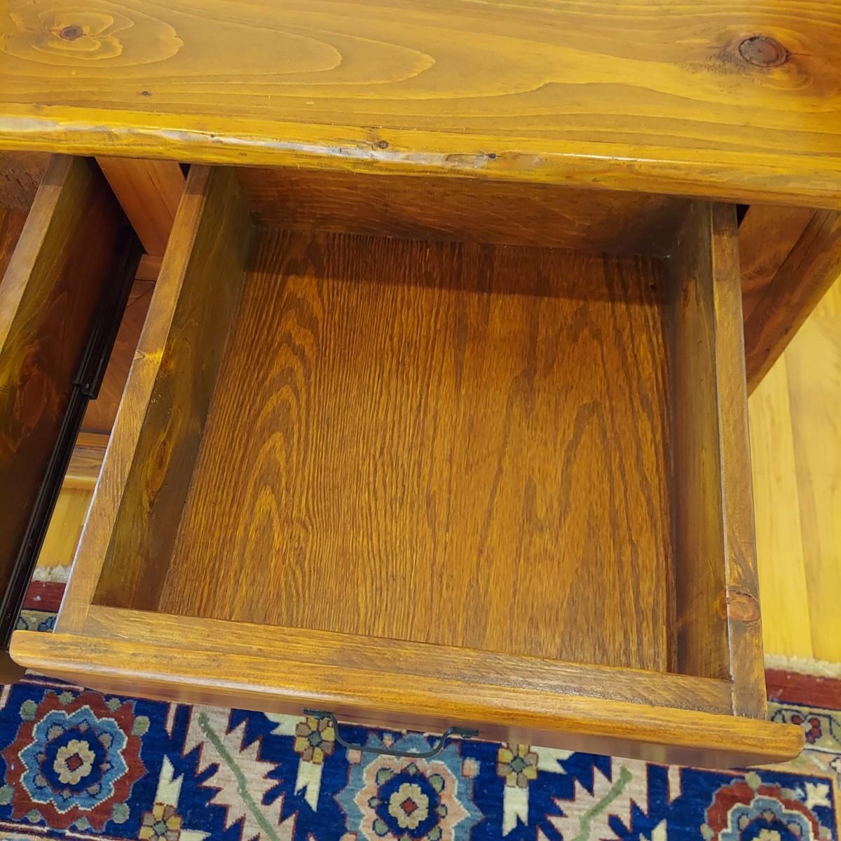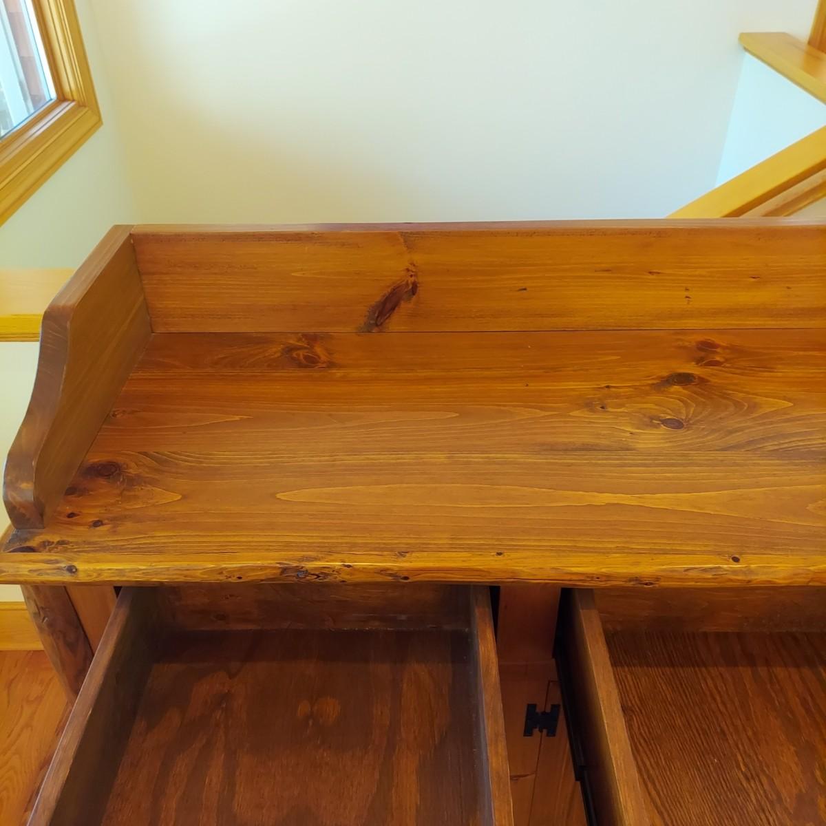 Beautiful custom built solid wood log cabin style buffet. Seller states it was handmade by Lang Hornthal. Has three drawers and three cabinet doors. Piece measures approximately 72” x 23” x 43"H. Please see photos for details. Matches other furniture pieces available in auction. Local Pickup Only. Winning bidder must bring assistance to help move and load this item due to its weight and/or size.