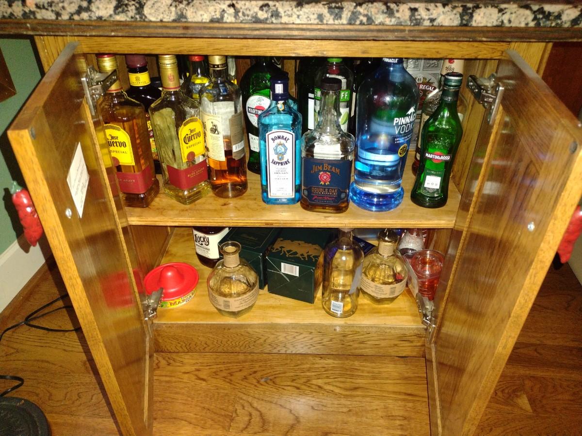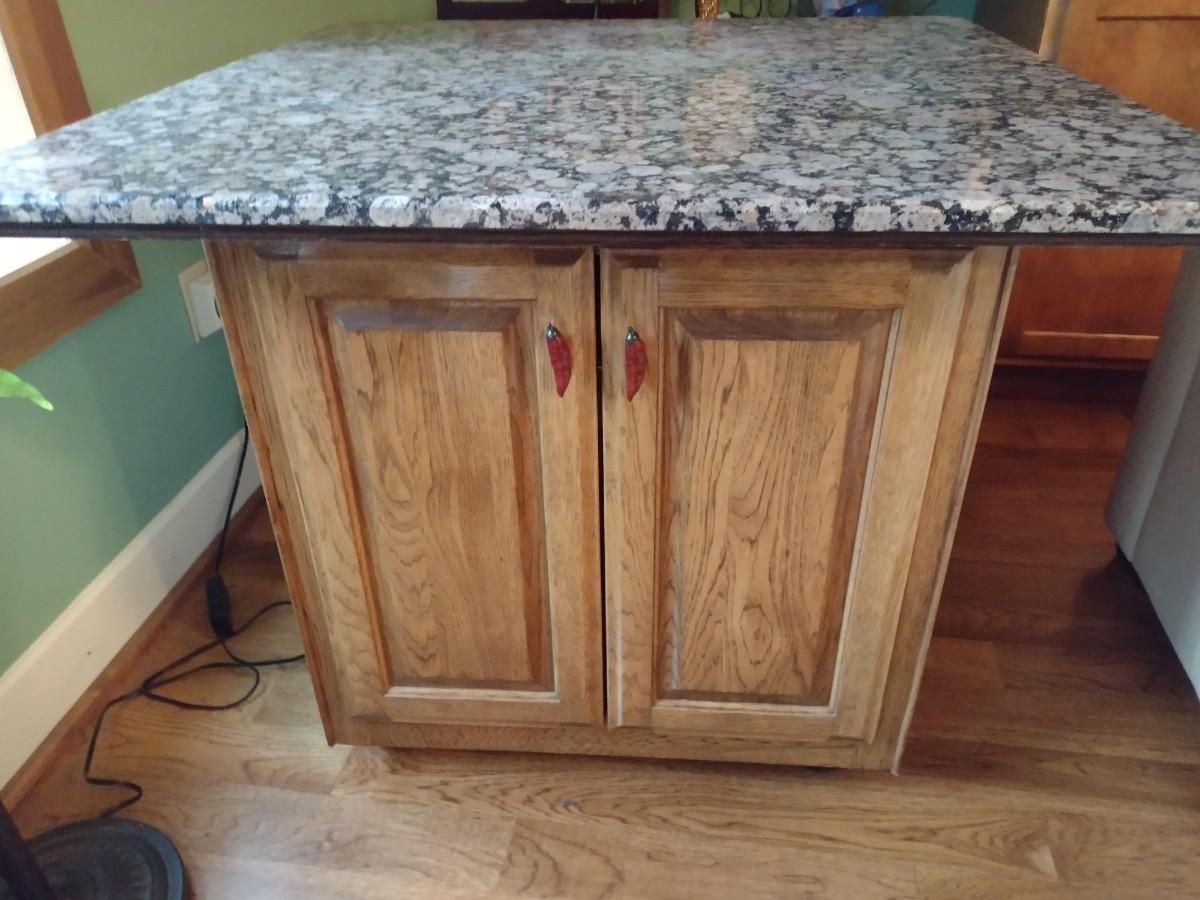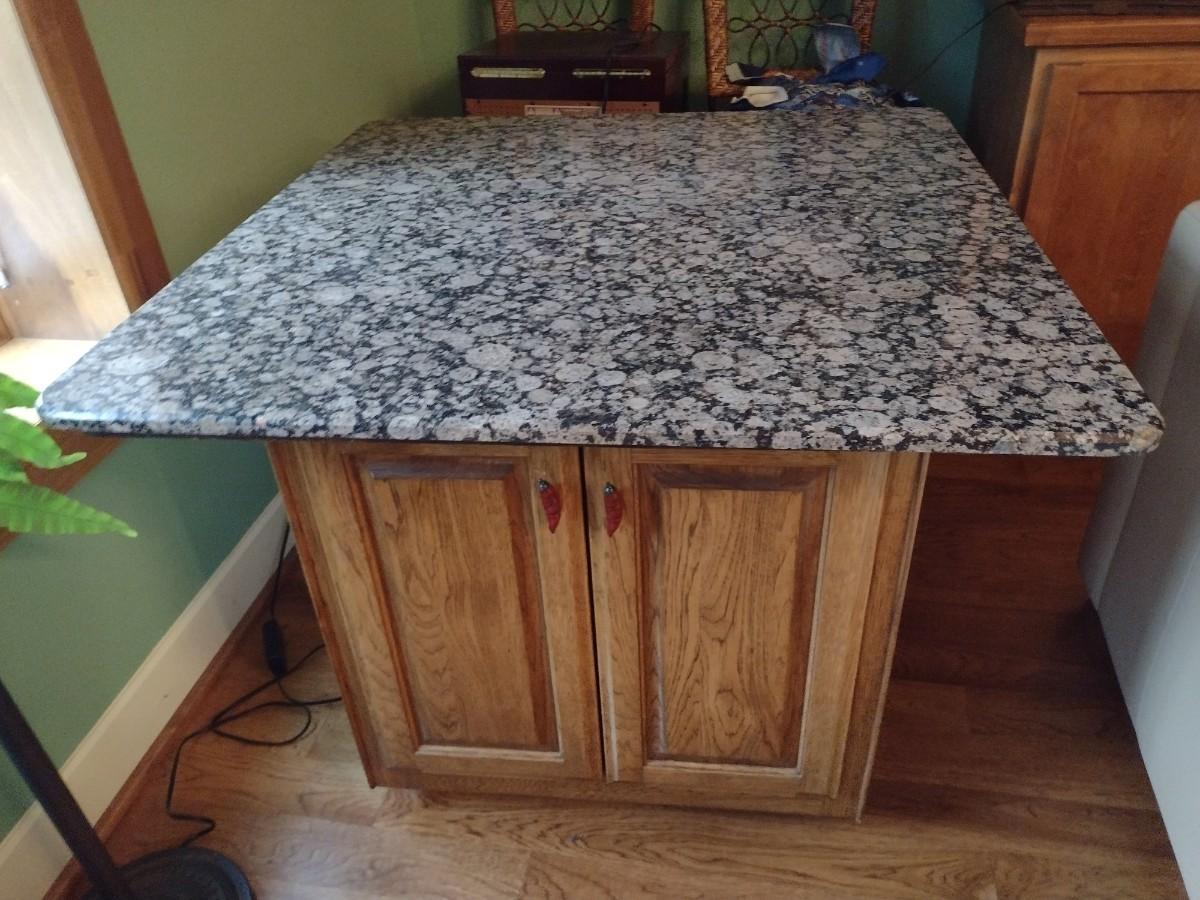 Custom Crafted Wood Bar with Granite Top and Cabinet Storage Both Ends on Castors (No Contents). Granite removes for easy hauling.