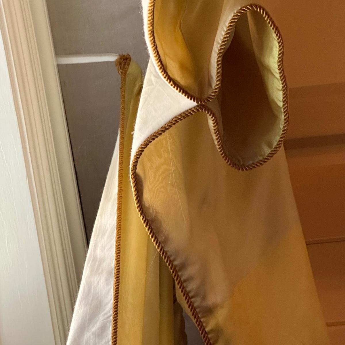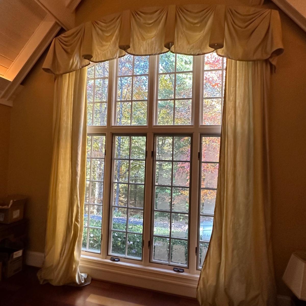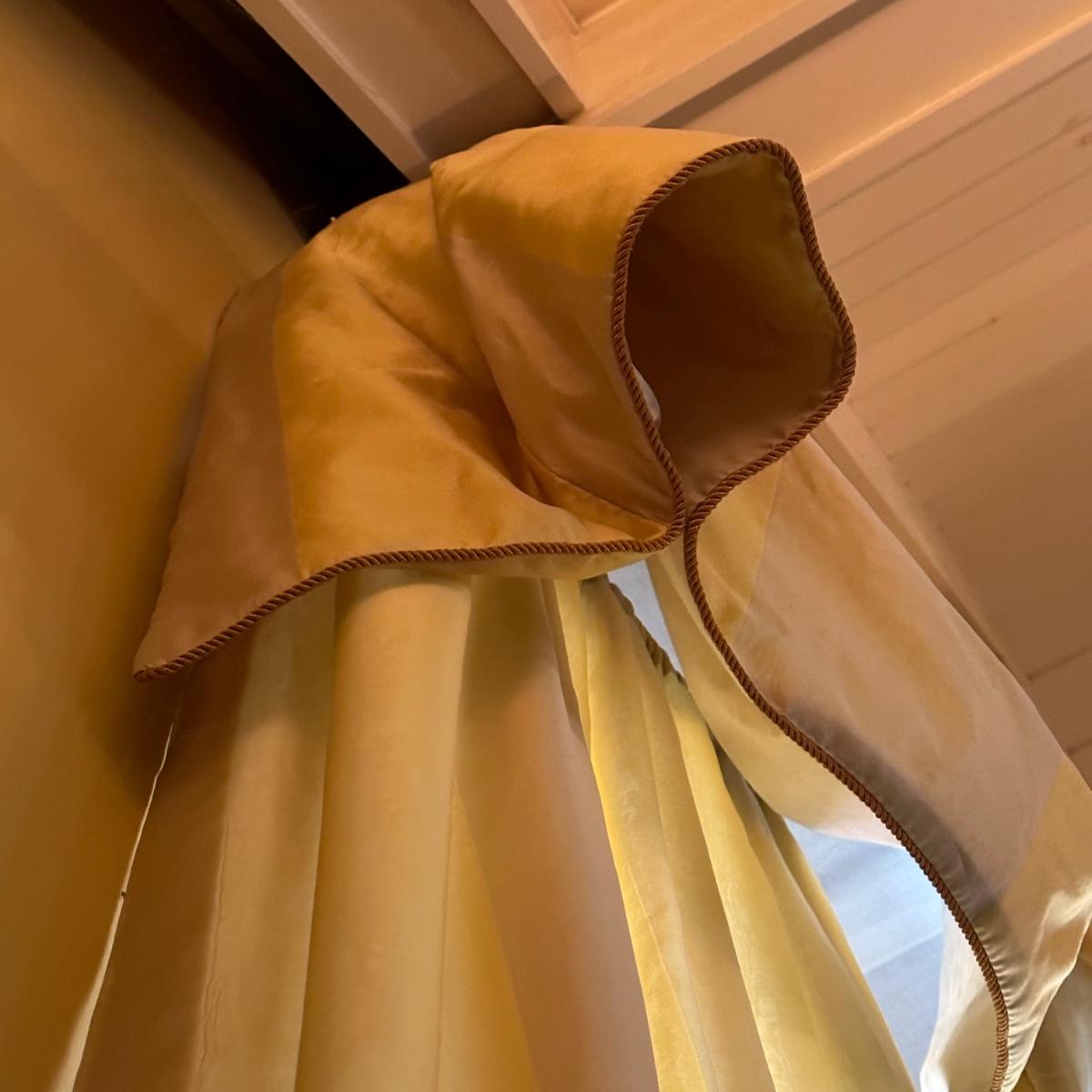 Custom lined drapery side panels and valence. Drapery panels puddle and measure 11’7” long. Valence measures 9’3”W. Mounted with “L” brackets and Phillips head screws. Winning bidder will need to bring ladder and tools to remove. Local pickup only.