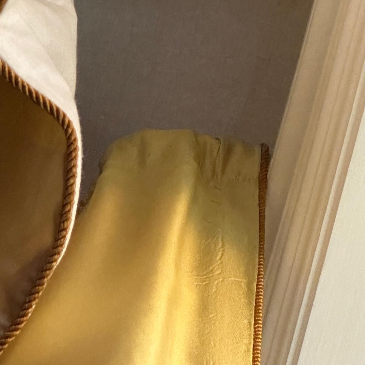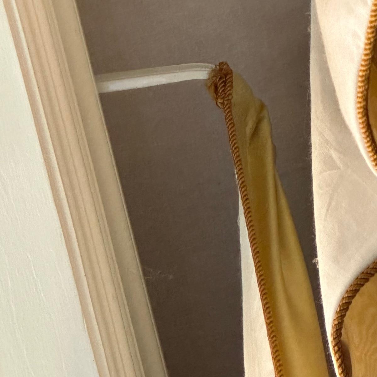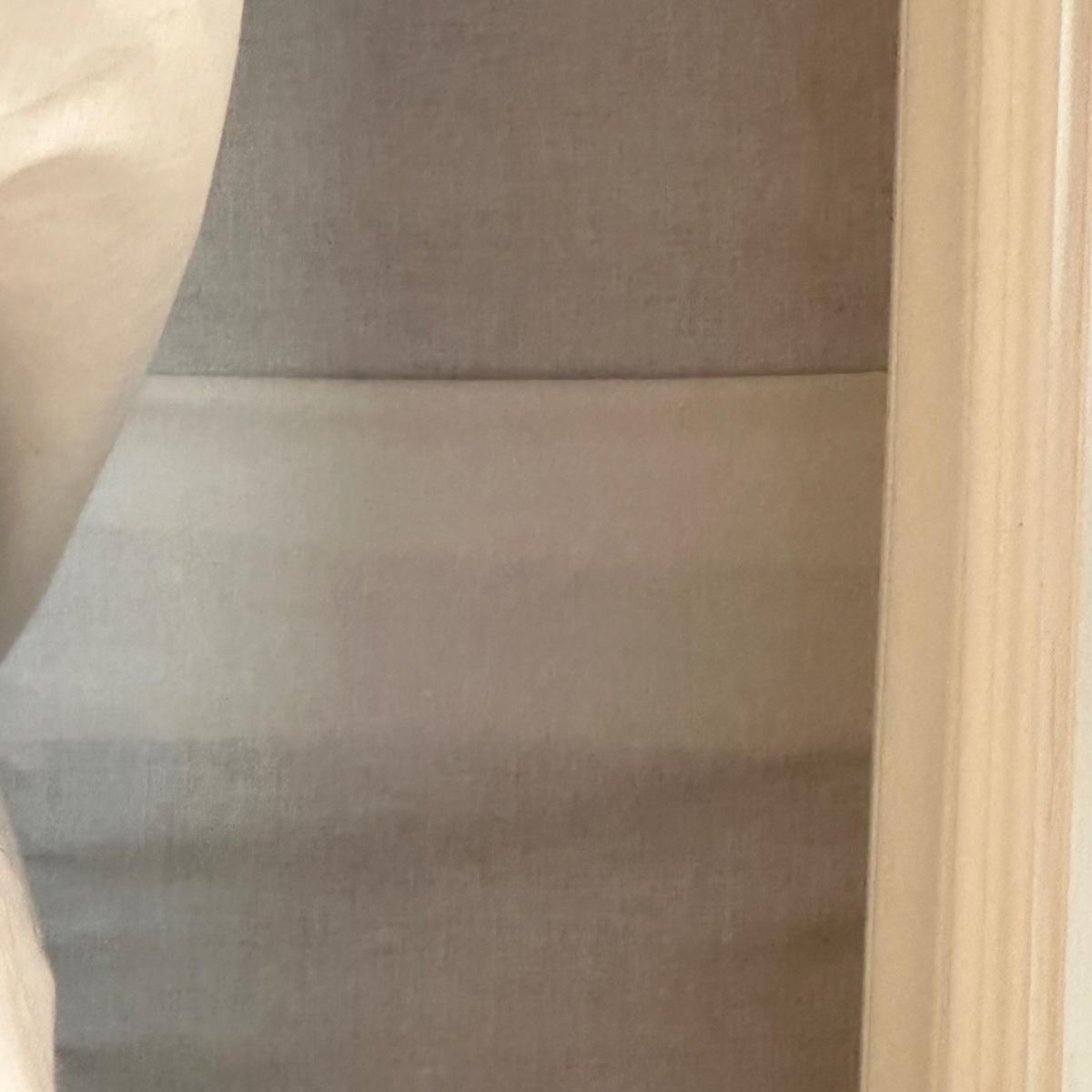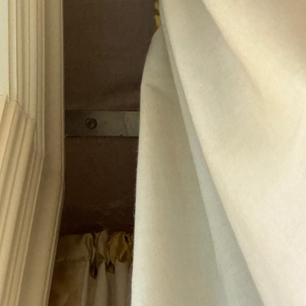 Custom lined drapery side panels and valence. Drapery panels puddle and measure 11’7” long. Valence measures 9’3”W. Mounted with “L” brackets and Phillips head screws. Winning bidder will need to bring ladder and tools to remove. Local pickup only.