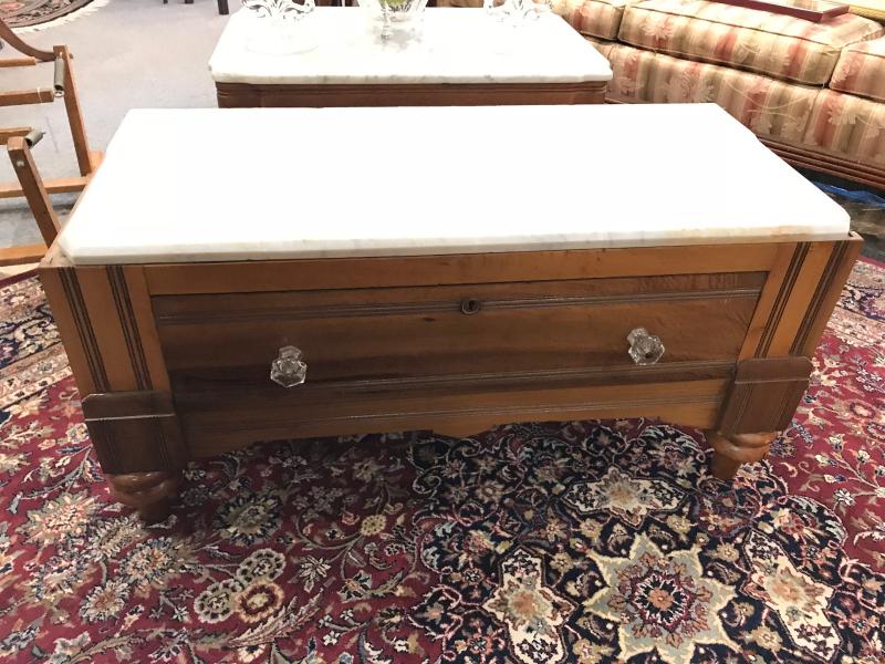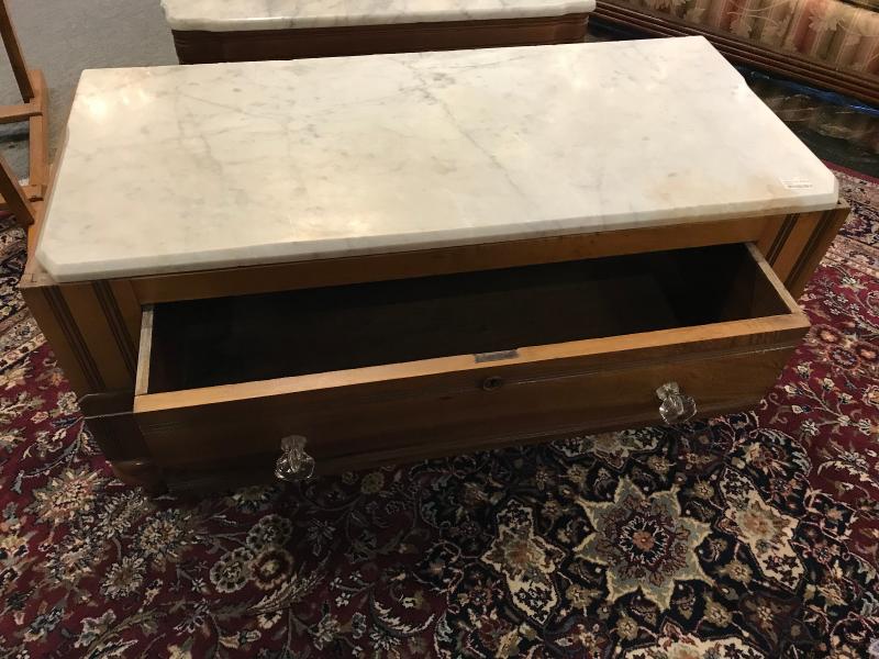 Very unique custom made piece created from antique parts. The main body is an antique walnut Victorian Eastlake Style wardrobe base with a single deep drawer. This part is decorated with incise reeding, and features nice large glass knobs, This part has been mounted on four modern stained to match turned feet. The whole has been topped with an antique piece of white marble which is a near perfect fit. This is a great piece of furniture for extra storage at the foot of the bed, and can be used as a bench. It also fits nicely under a window, and the marble top is waterproof for displaying plants. 17" x 39" x 19" H