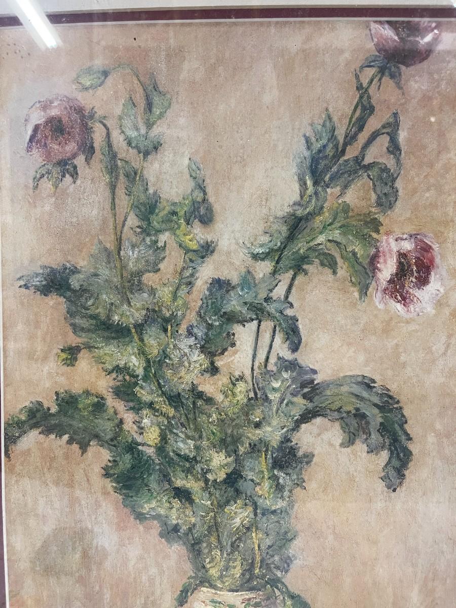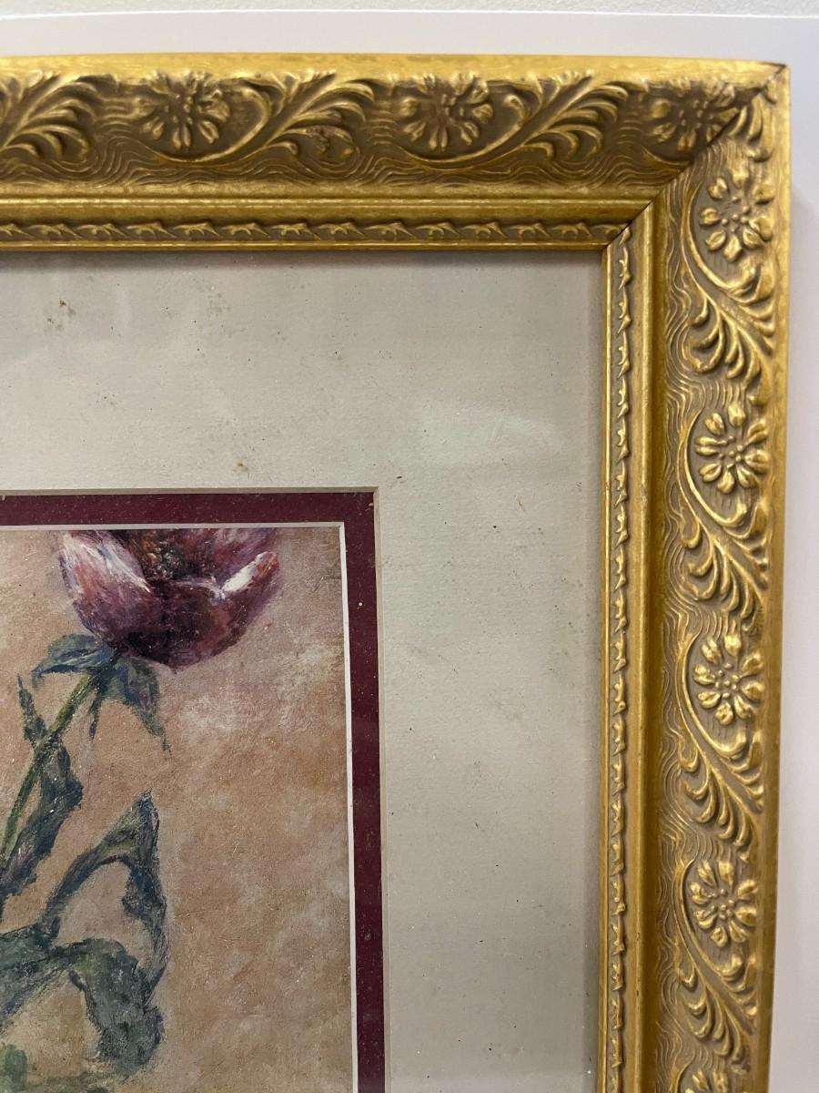 Custom framed flower print, unsigned. Frame: 15 1/2" x 21"; Matted: 10" x 15 1/4". Frame is in very good condition.