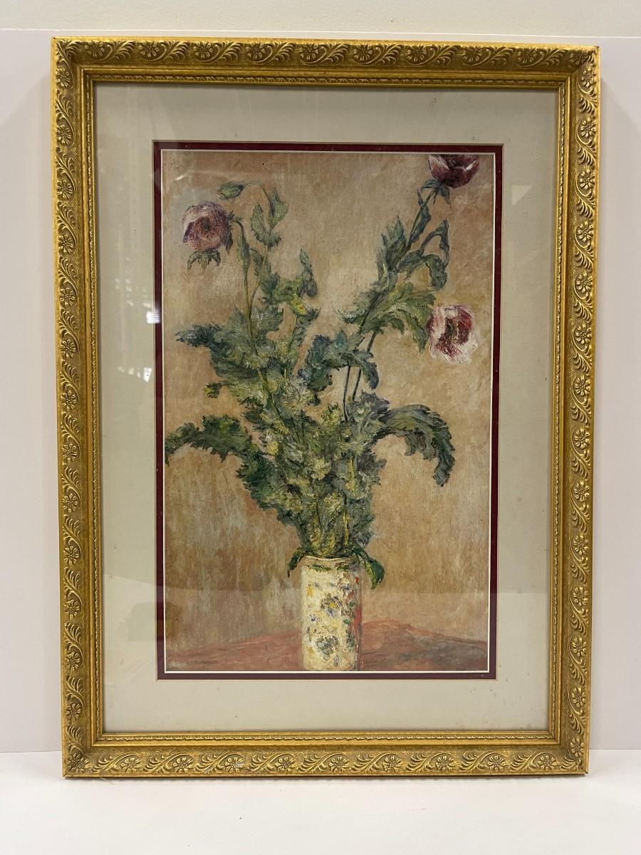 Custom framed flower print, unsigned. Frame: 15 1/2" x 21"; Matted: 10" x 15 1/4". Frame is in very good condition.