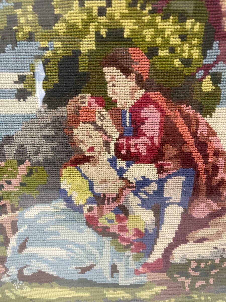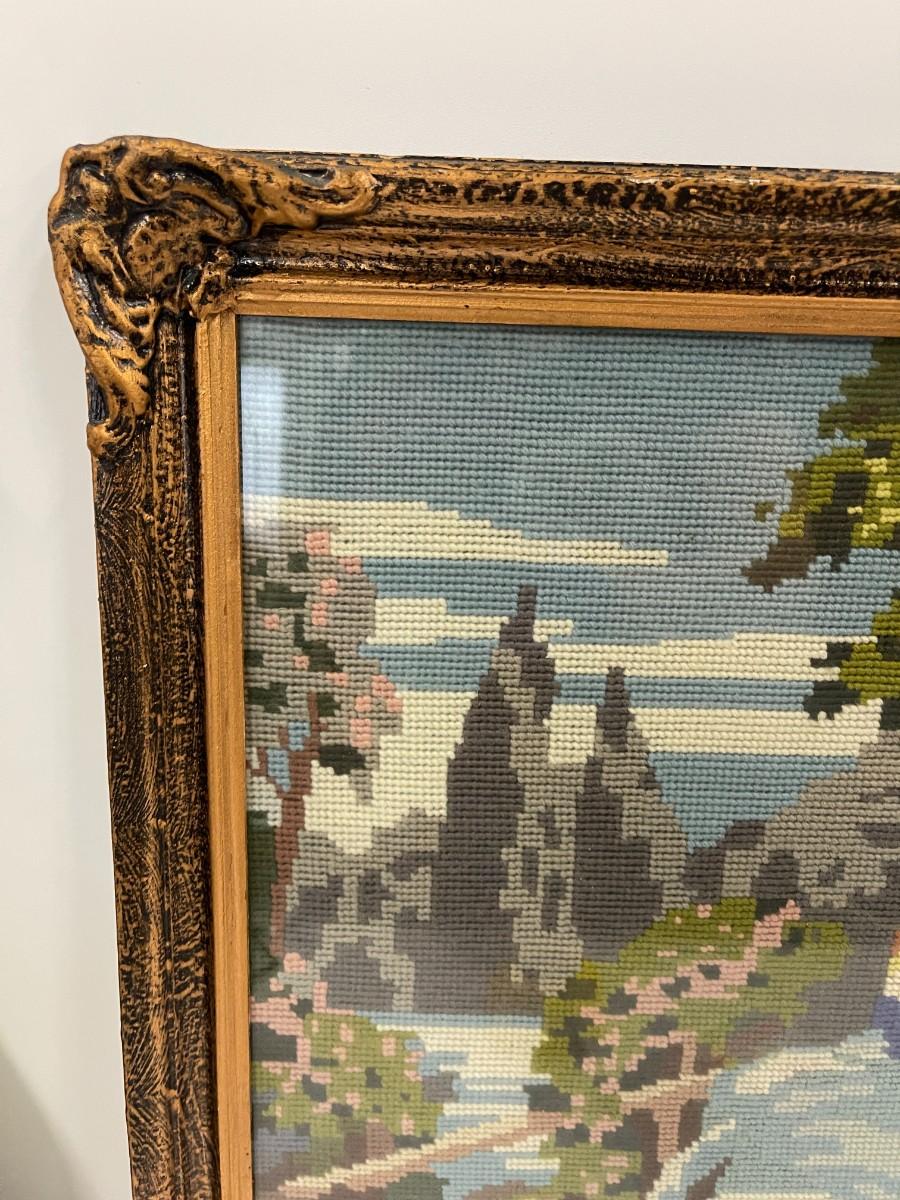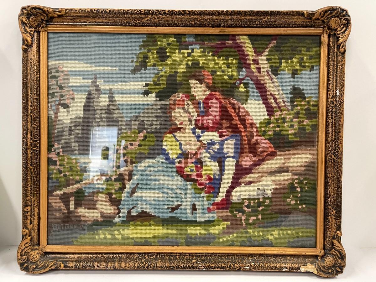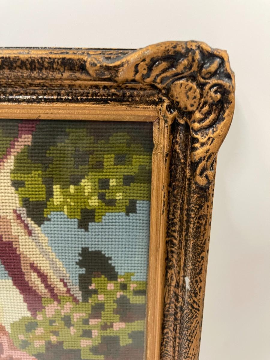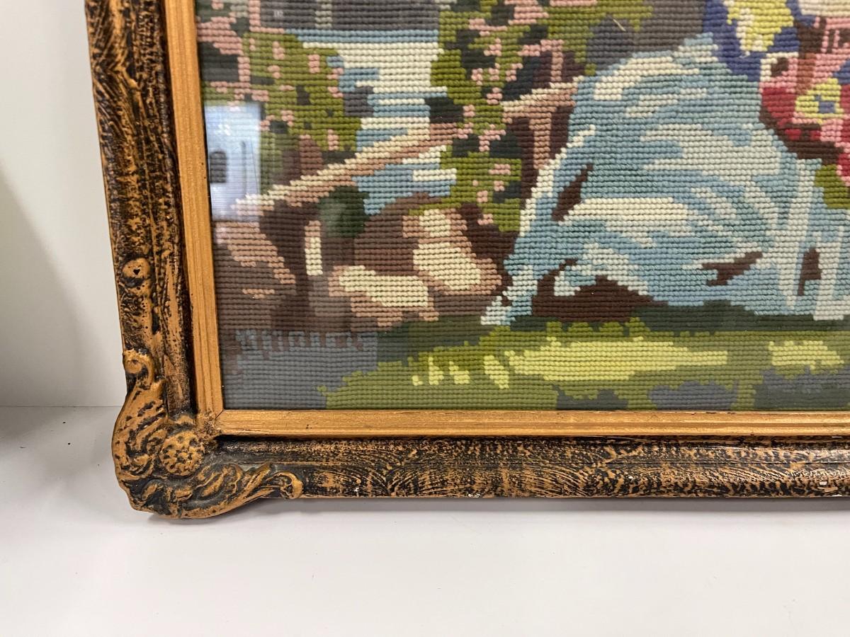 Custom framed needlepoint, 17" x 21". There is some damage to the frame. # 1313