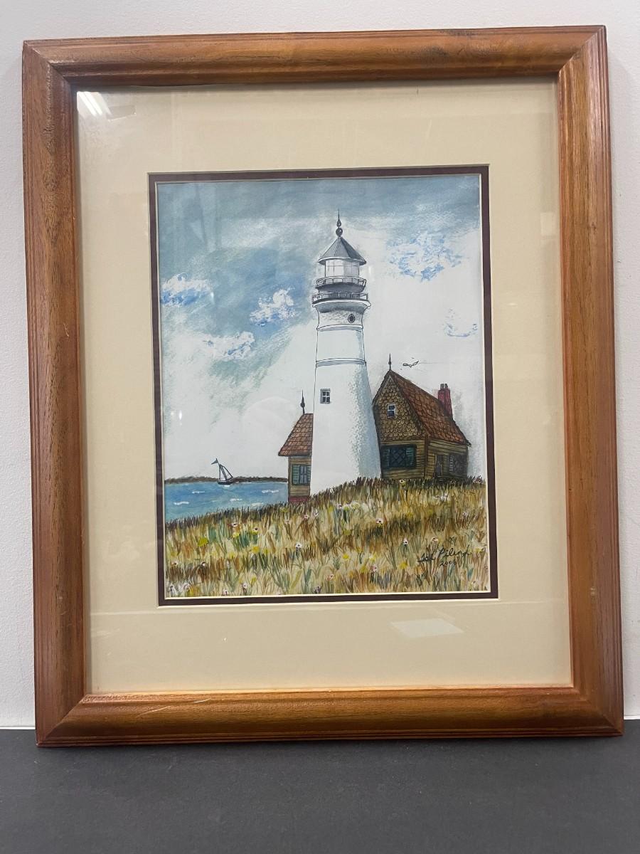 Custom Framed Original Watercolor Painting of Lighthouse, Signed
